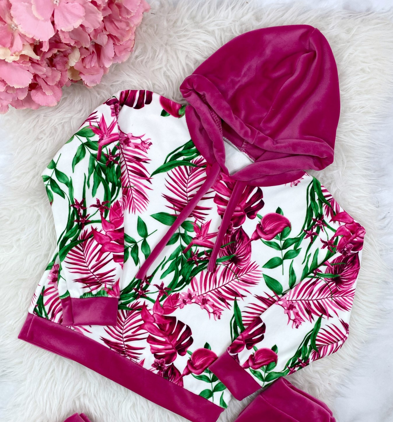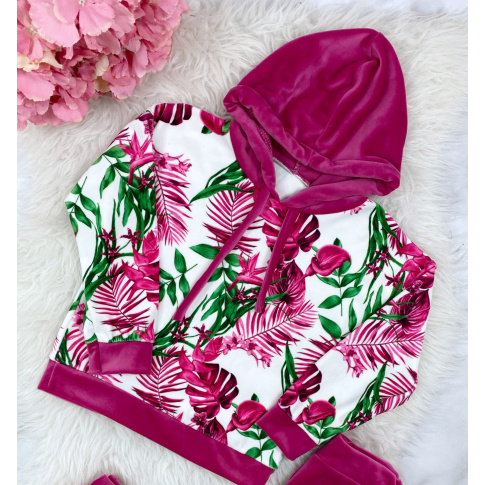 • bluza z kapturem, zdobiona motywem kwiatów i liści
