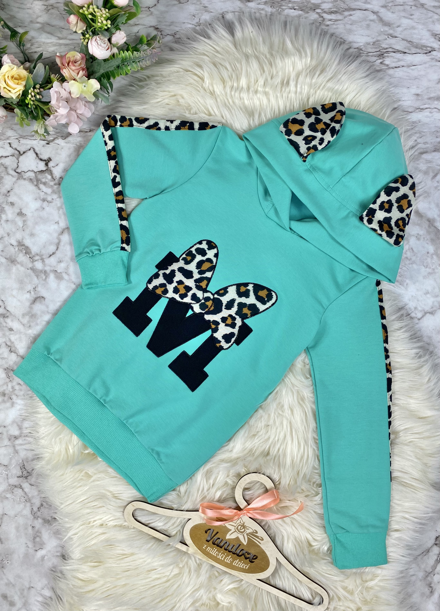 • bluza ozdobiona nadrukiem literki "M" z panterkową kokardką