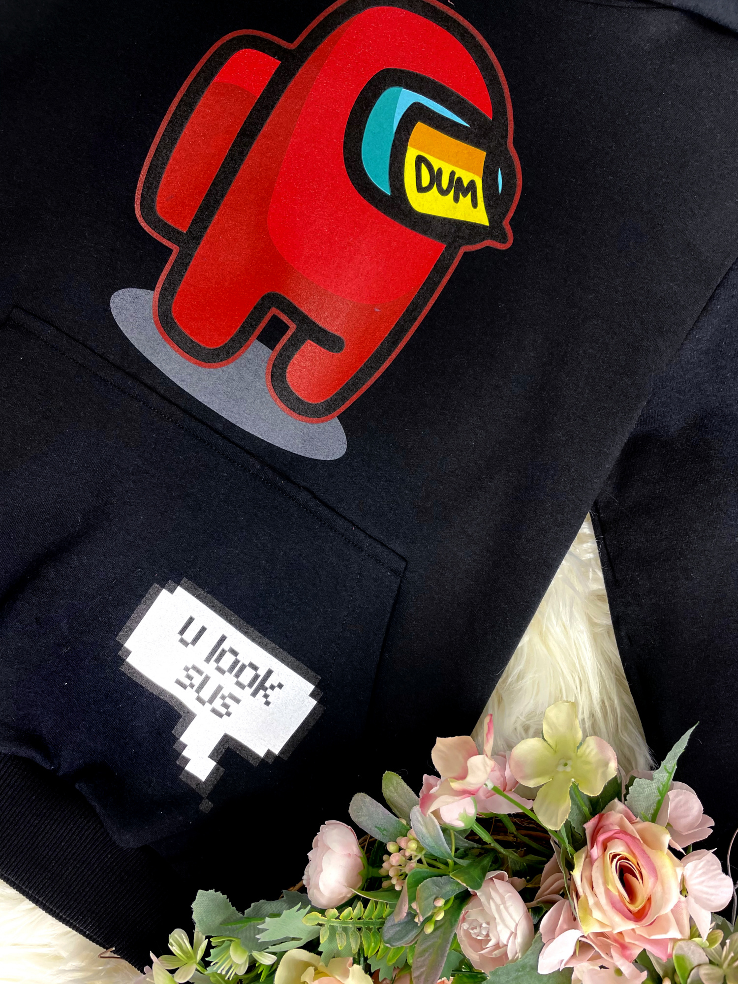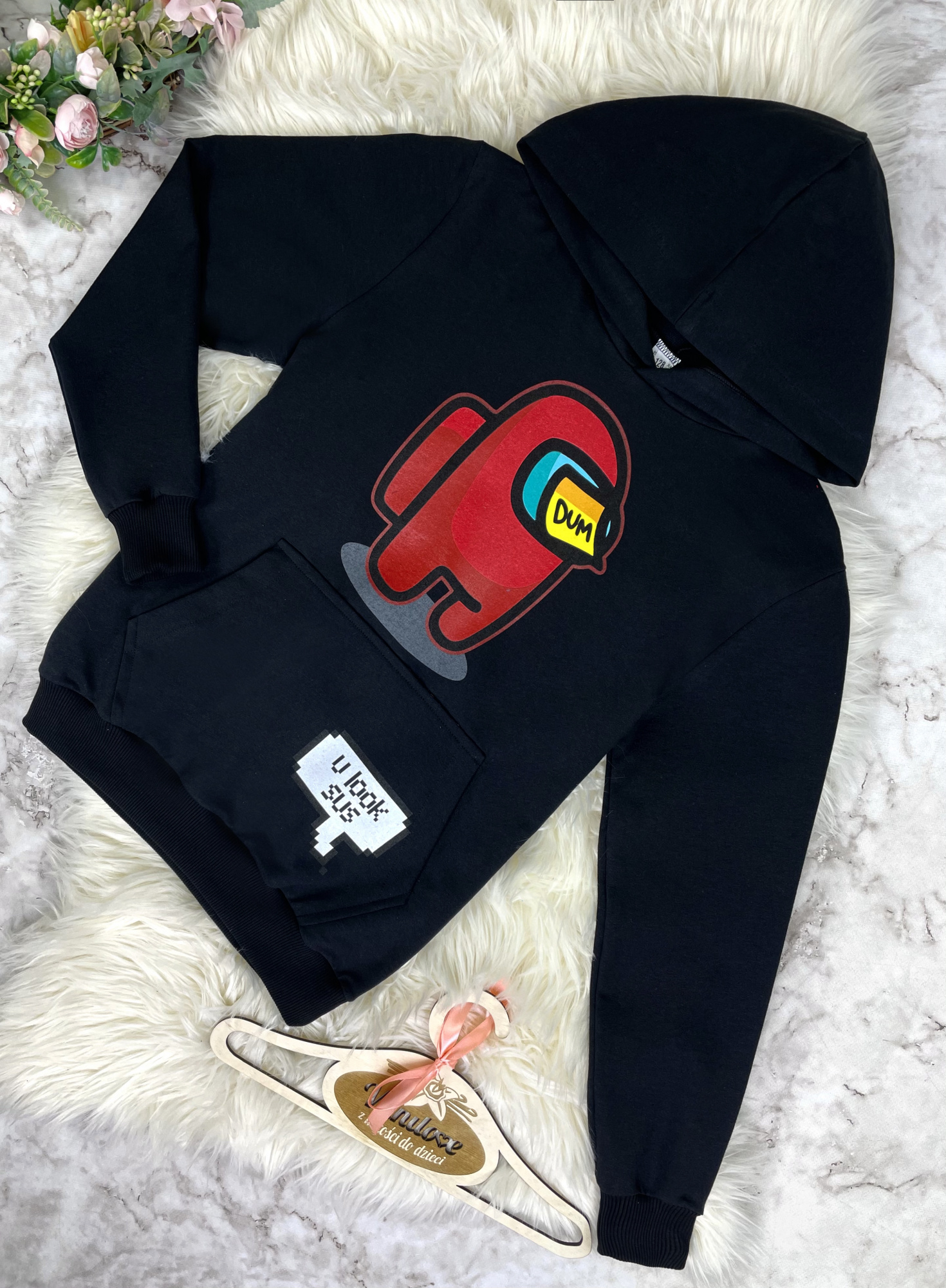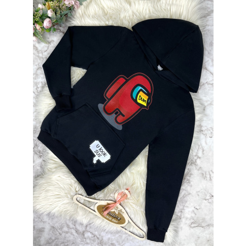 • z przodu bluza zdobiona kolorowymi nadrukami z gry Among Us