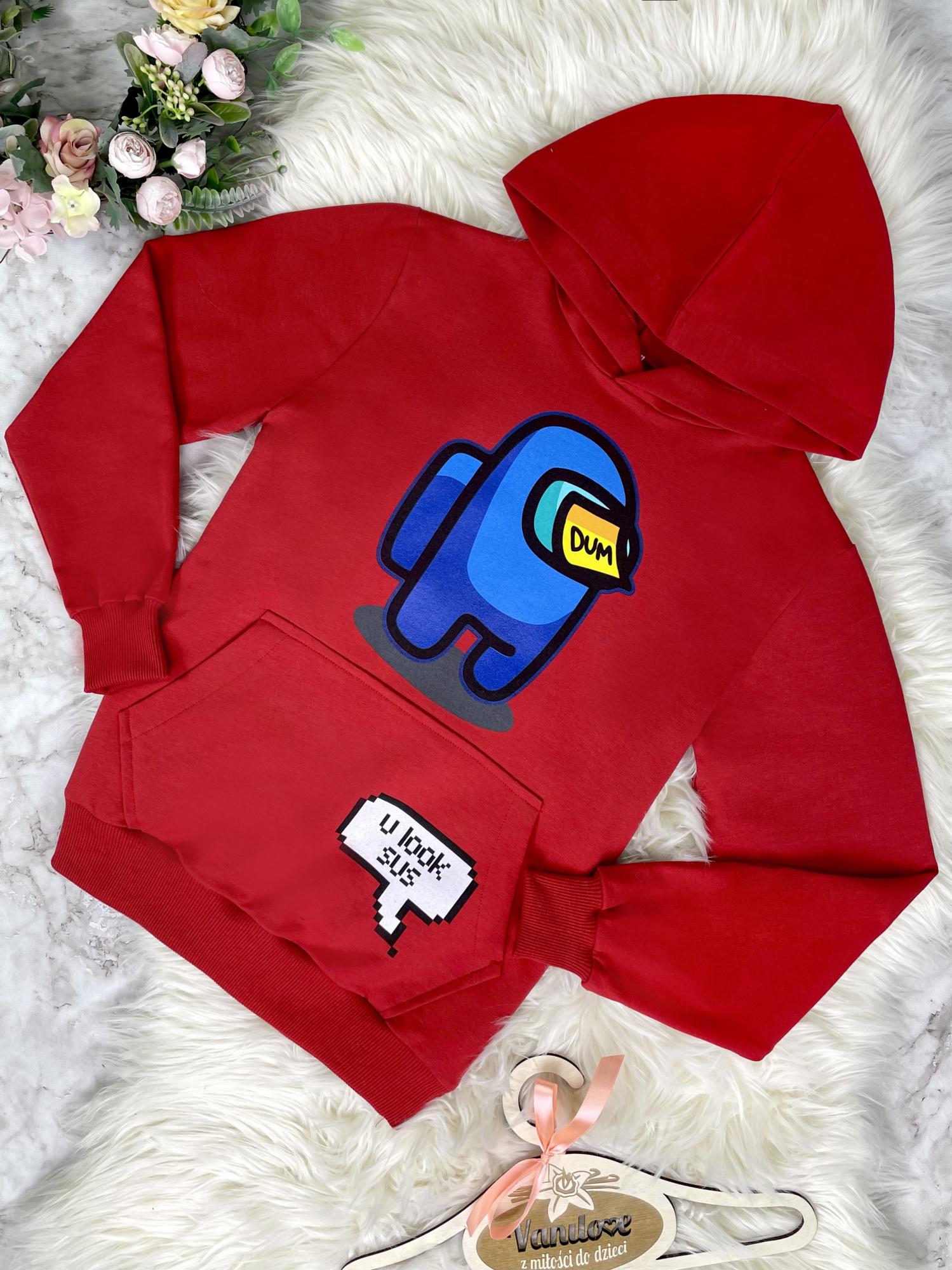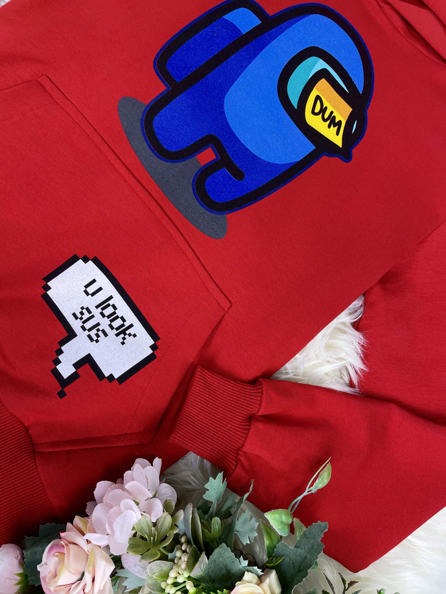 • z przodu bluza zdobiona kolorowymi nadrukami z gry Among Us
