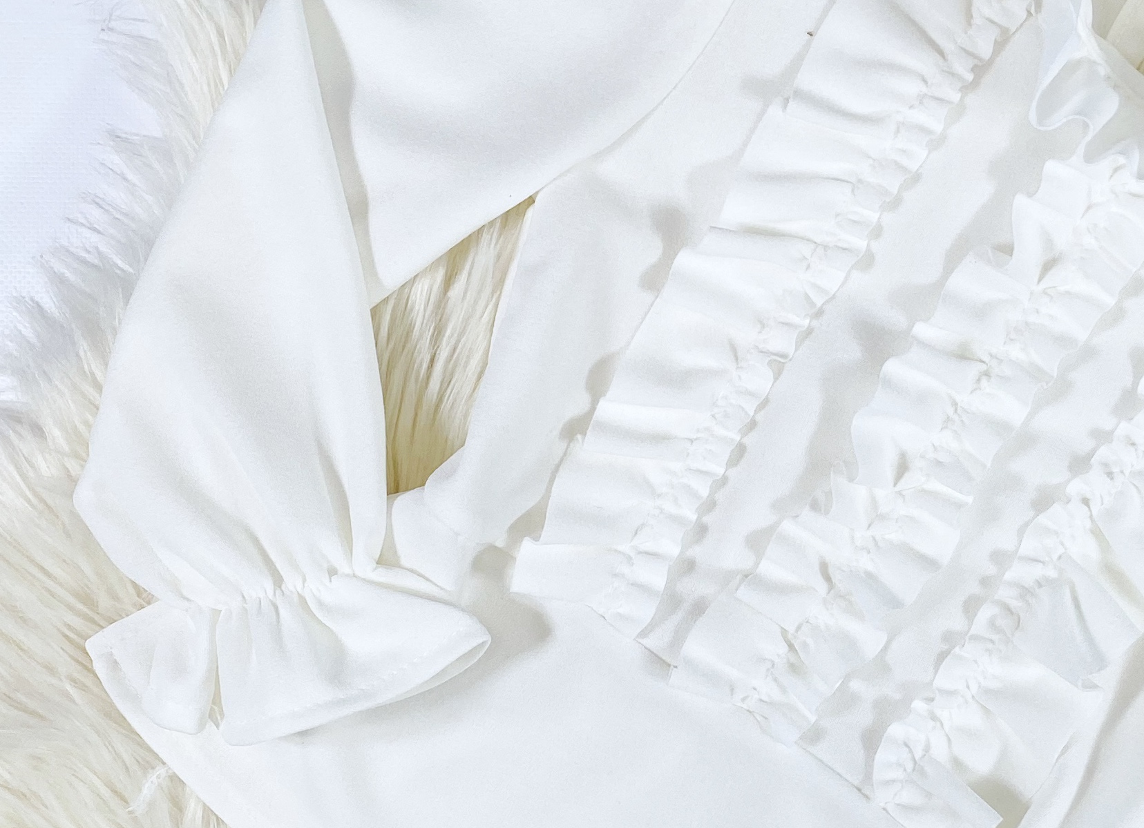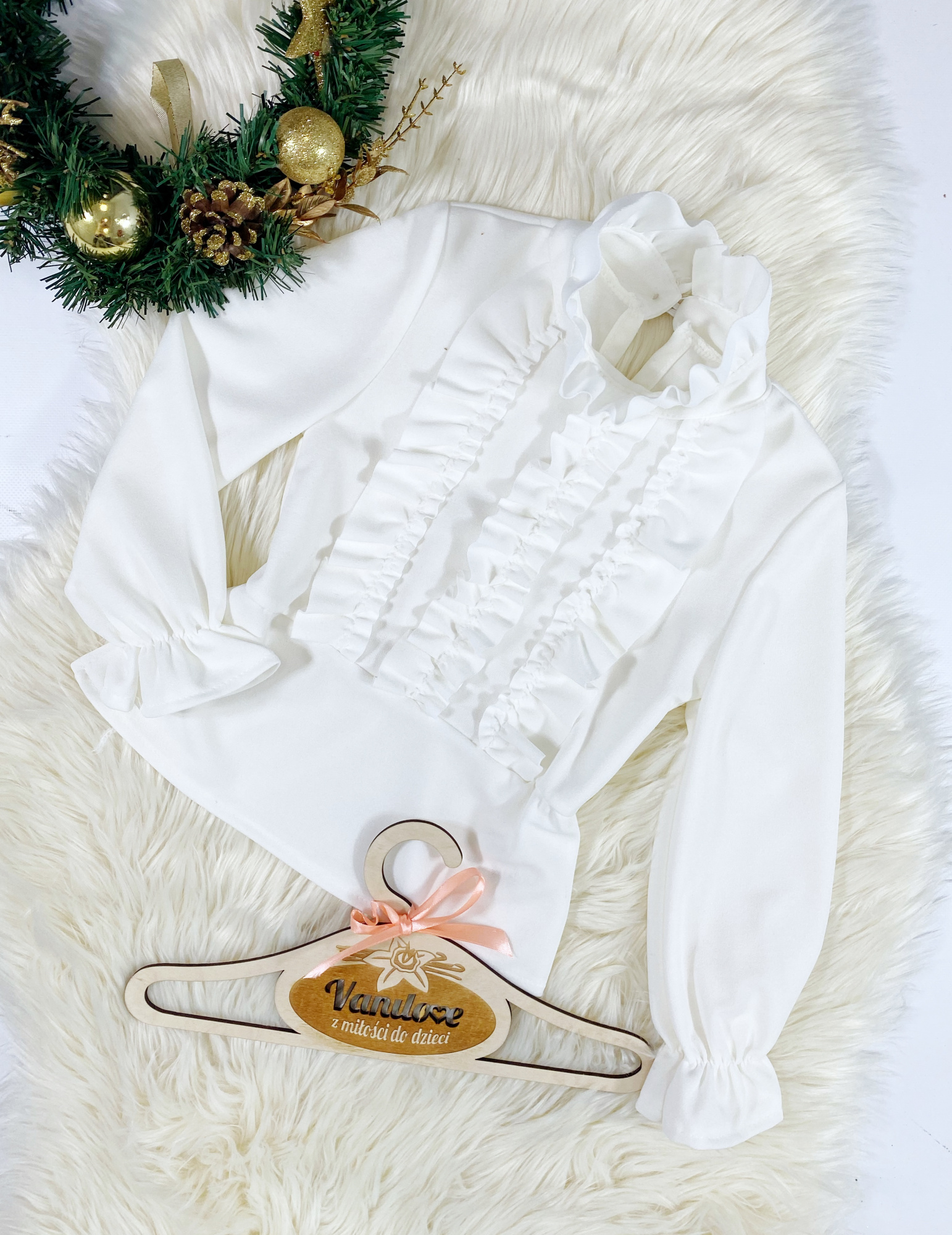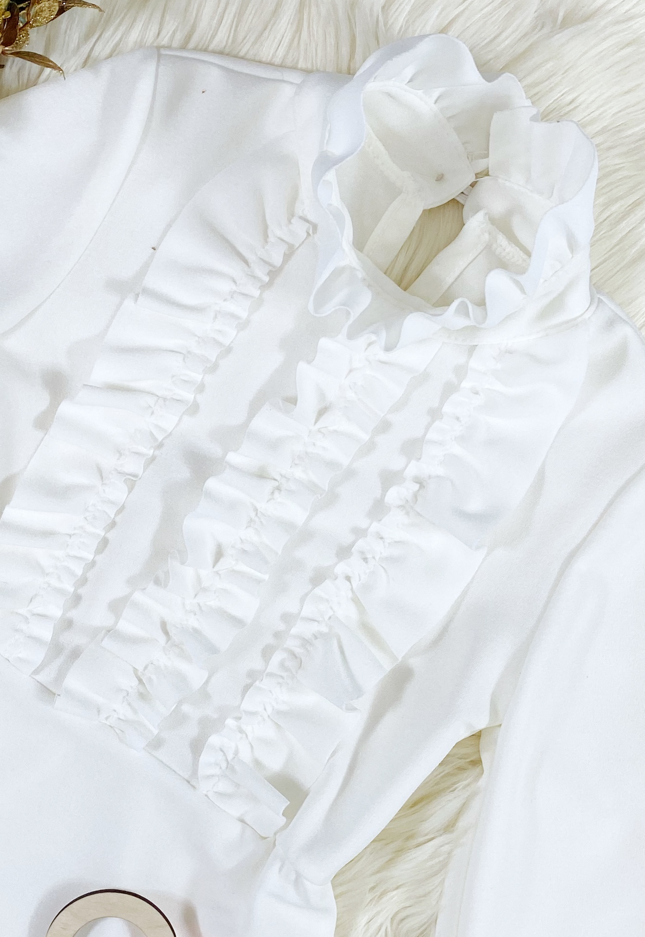 - elegancka bluzka zdobiona falbankami na klatce piersiowej