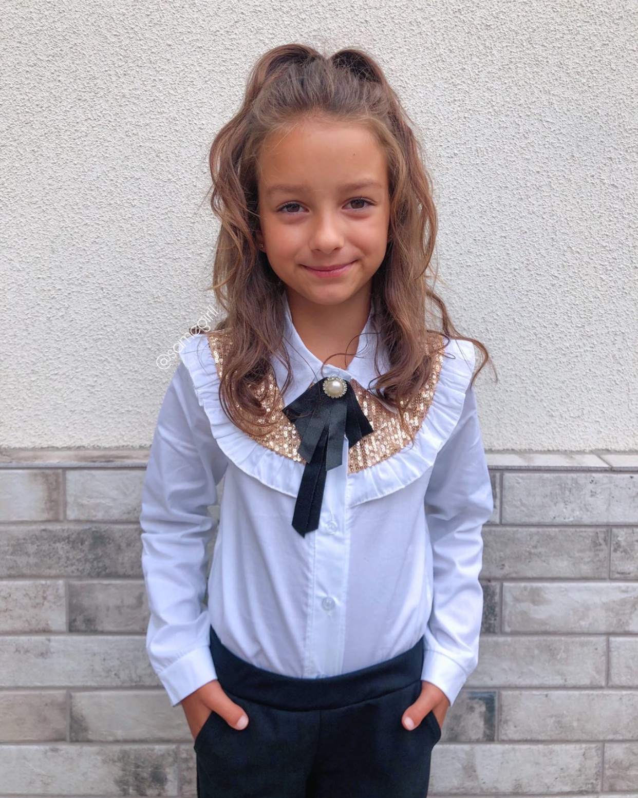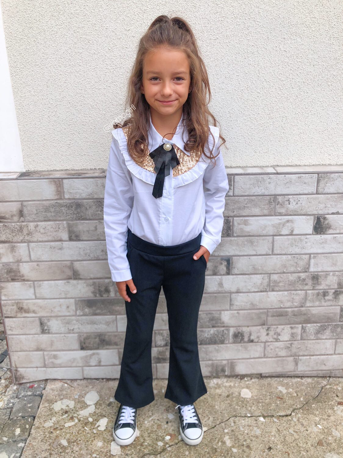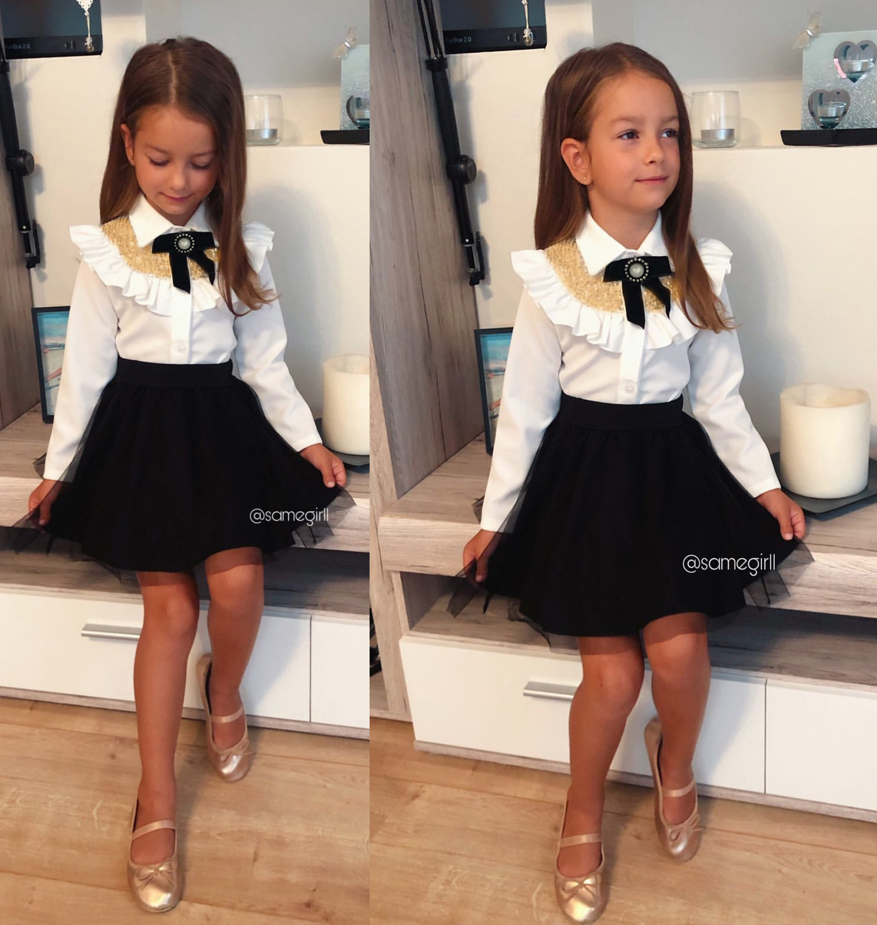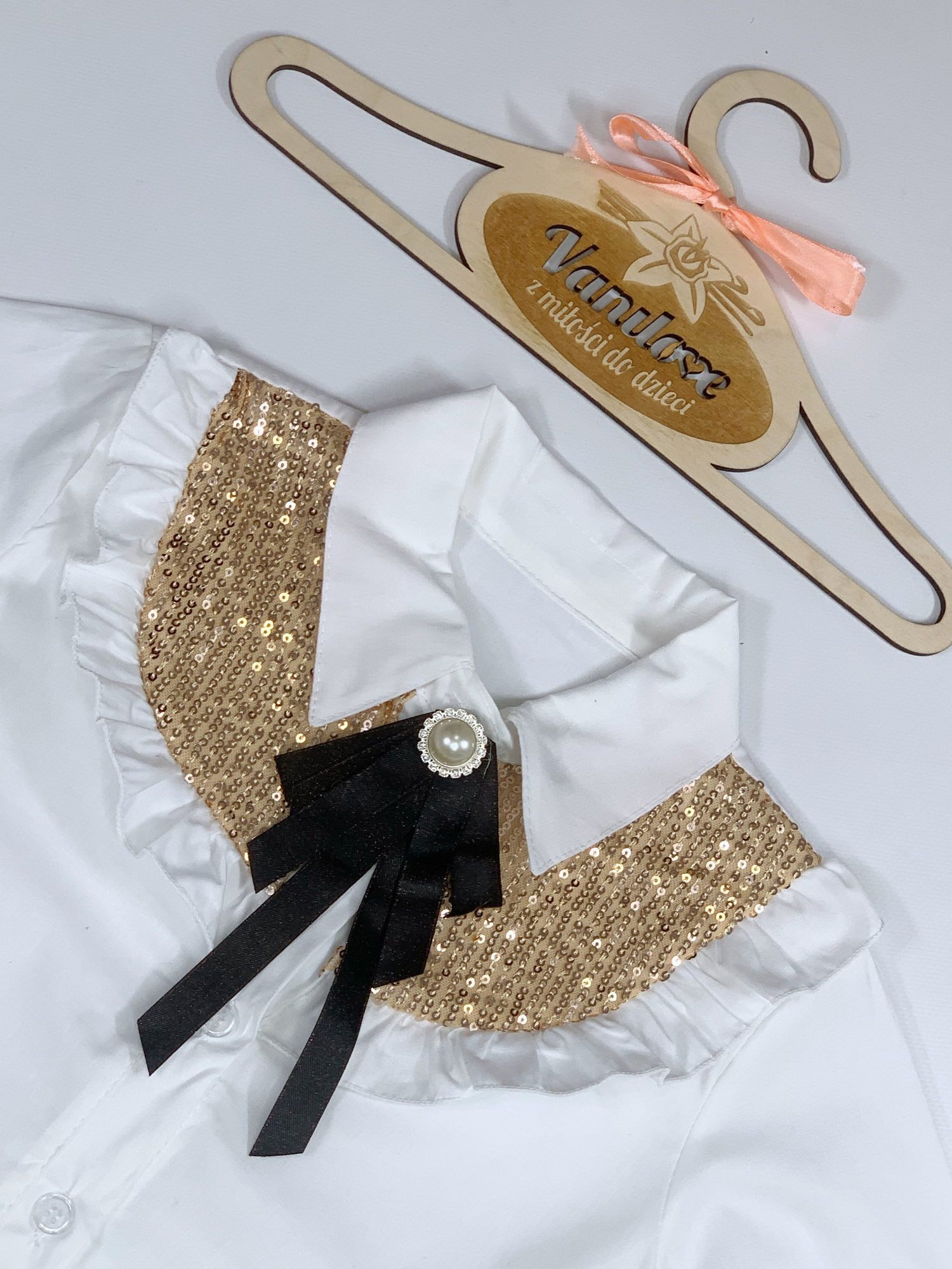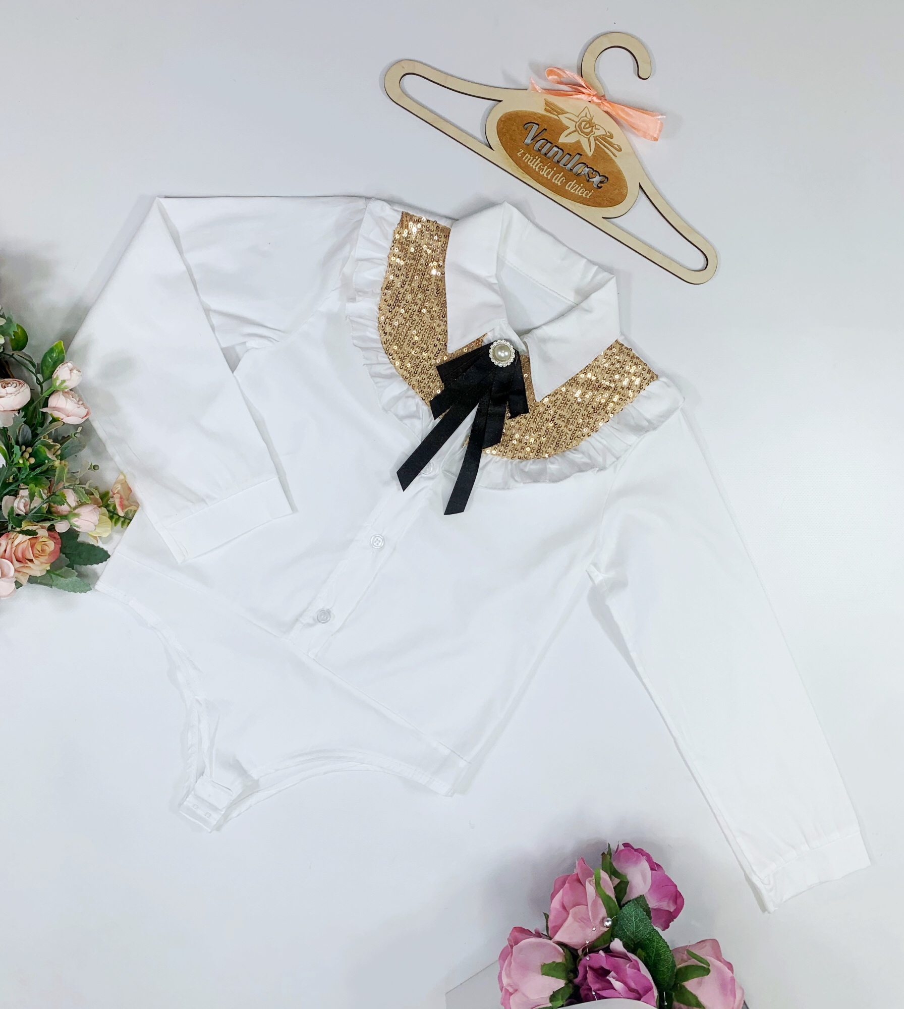 • zdobione złotymi cekinami, falbankami oraz uroczą broszką