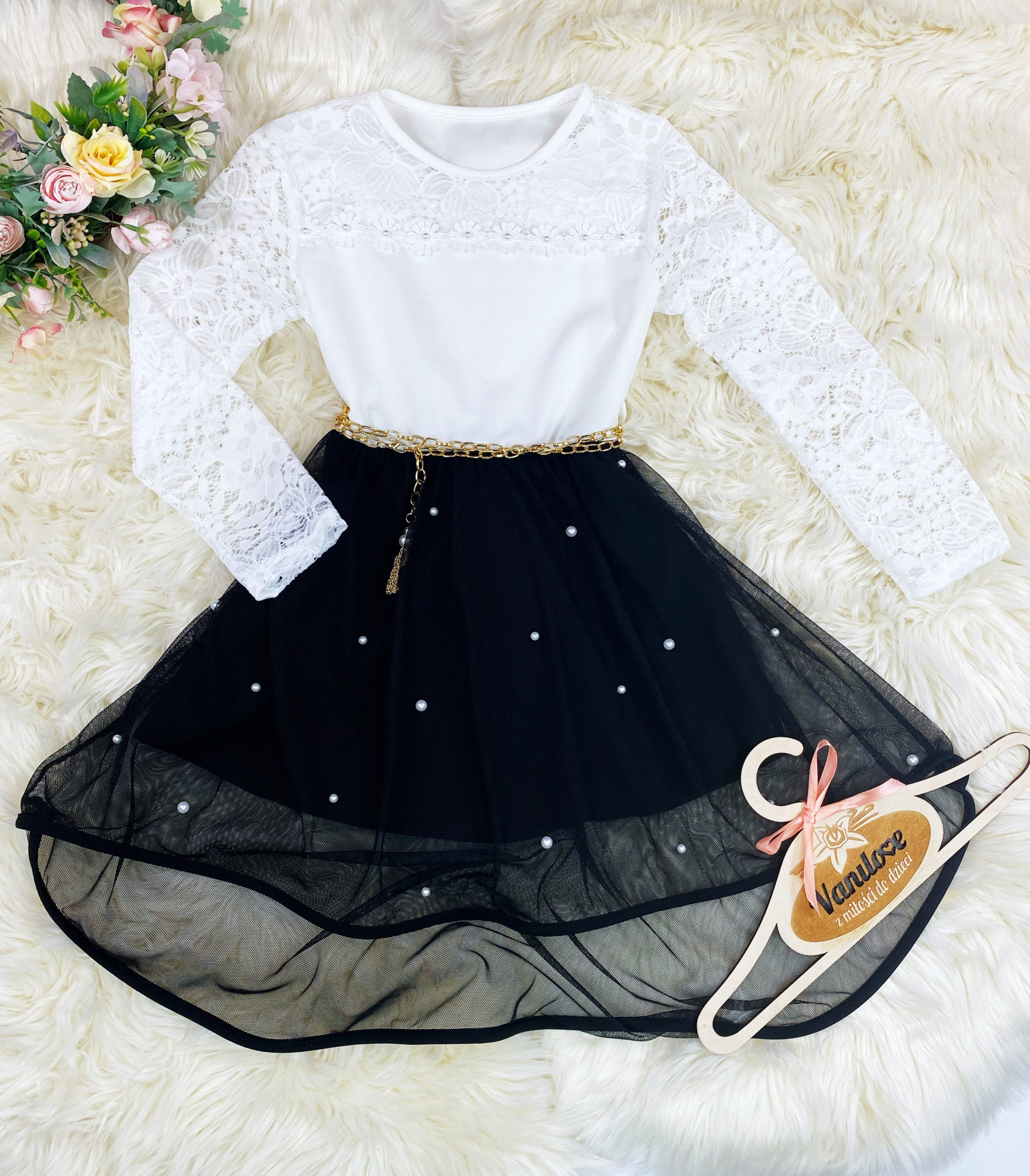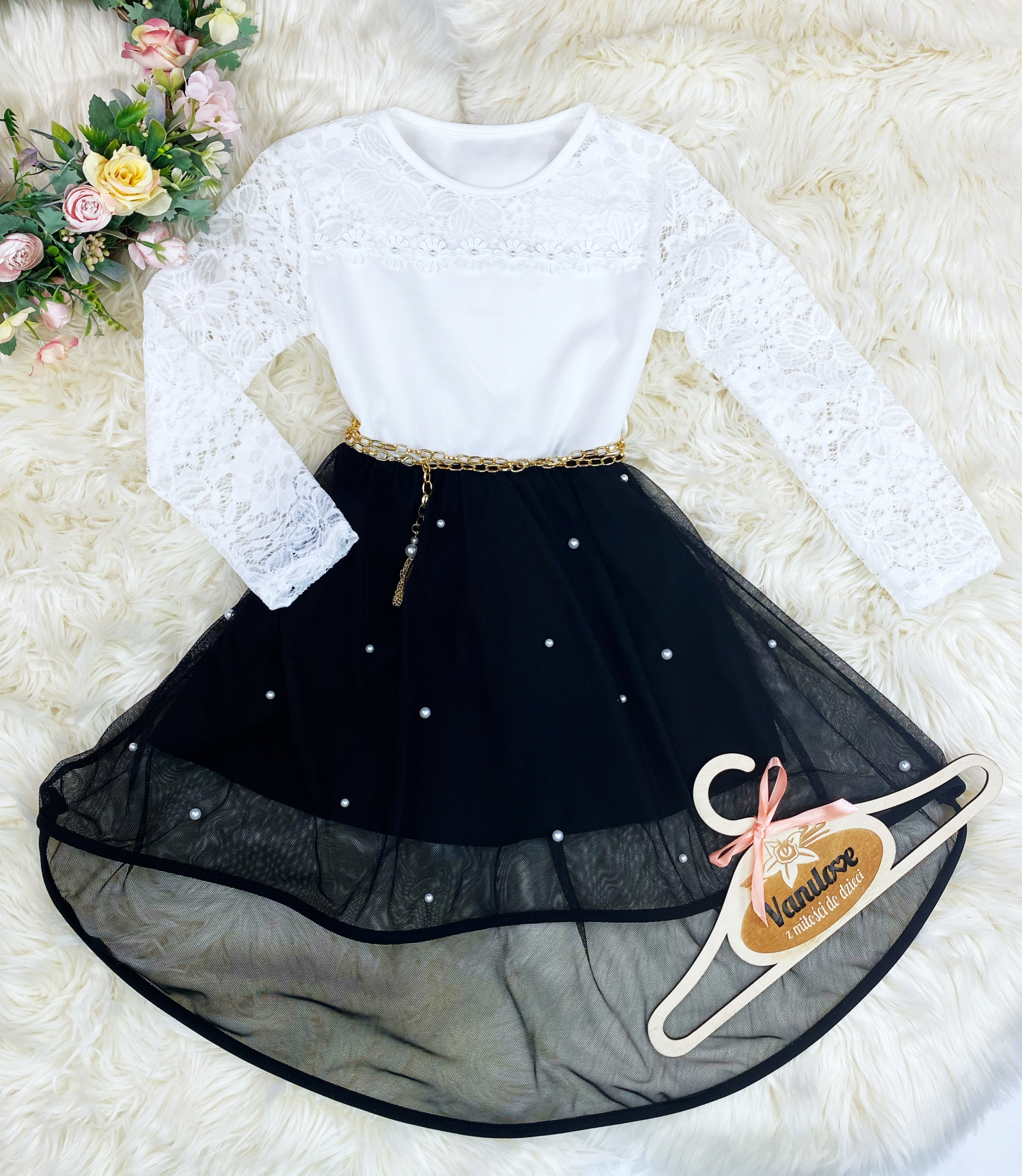 - dół wykonany z tiulowego materiału w asymetrycznym fasonie, na podszewce