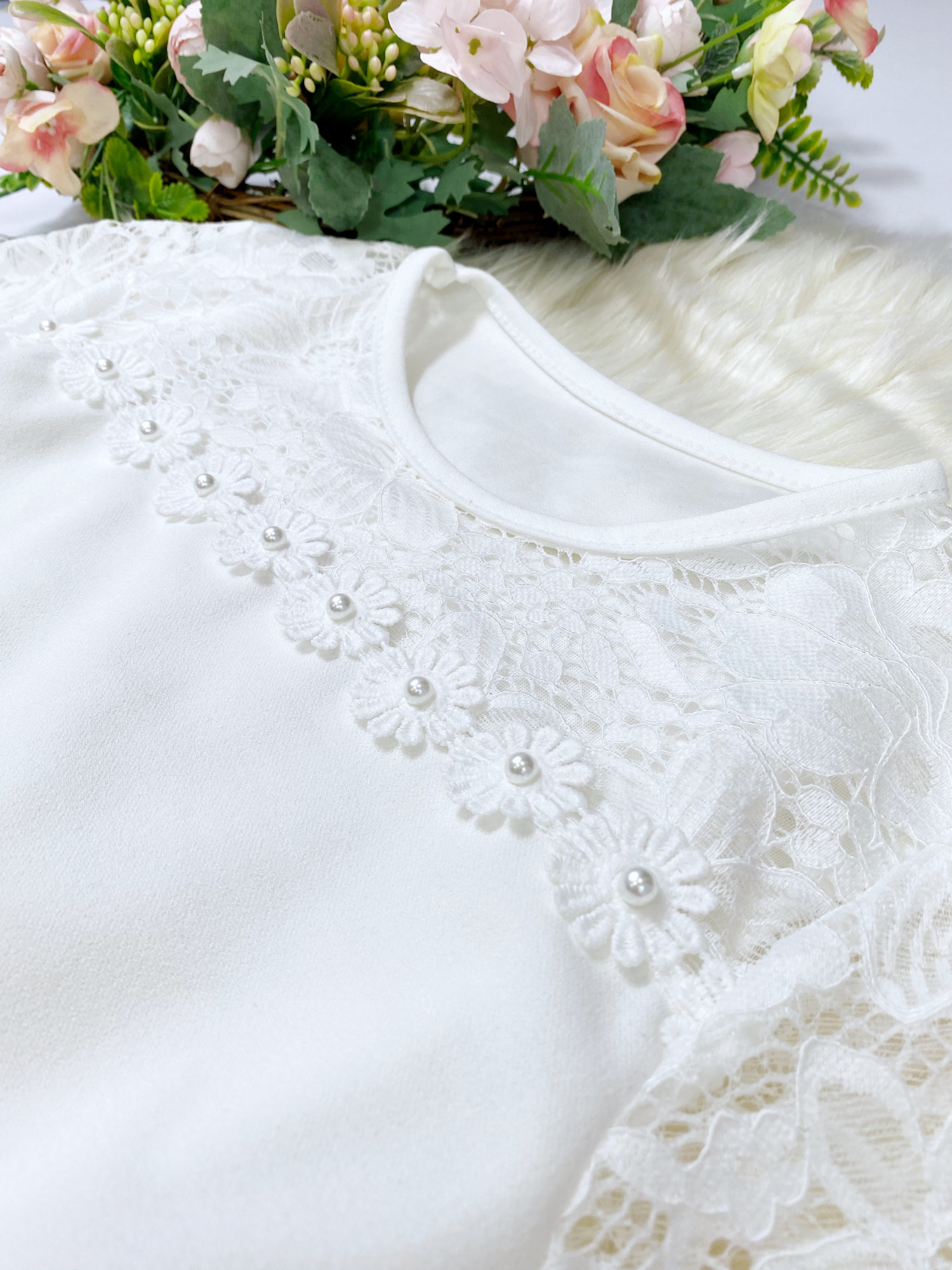 - model u góry zdobiony koronką z perełkami , rękawy również z koronki
