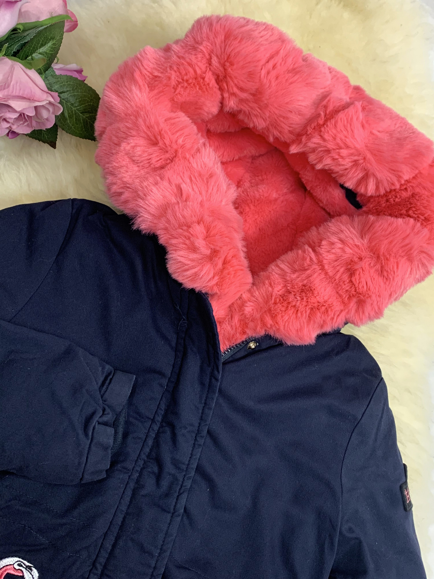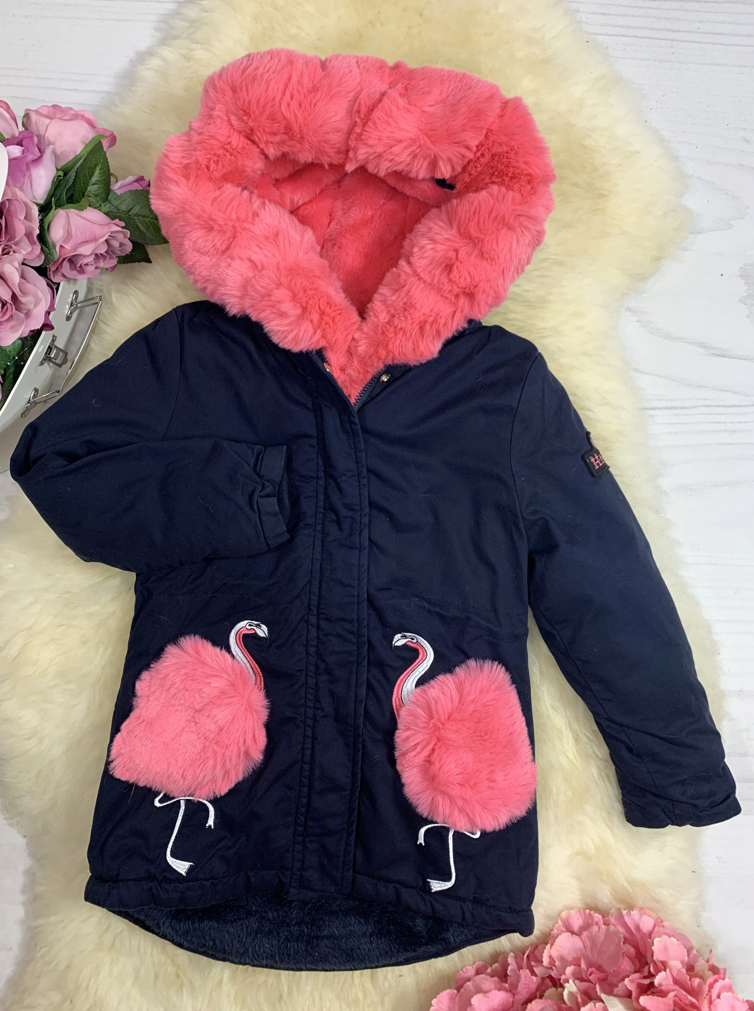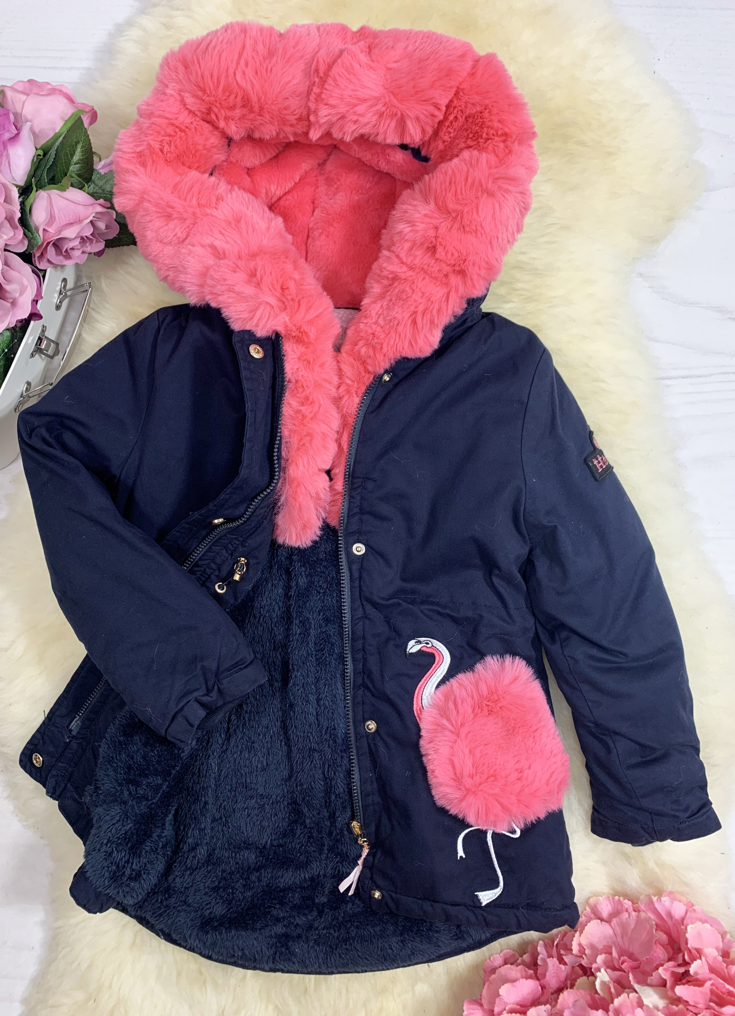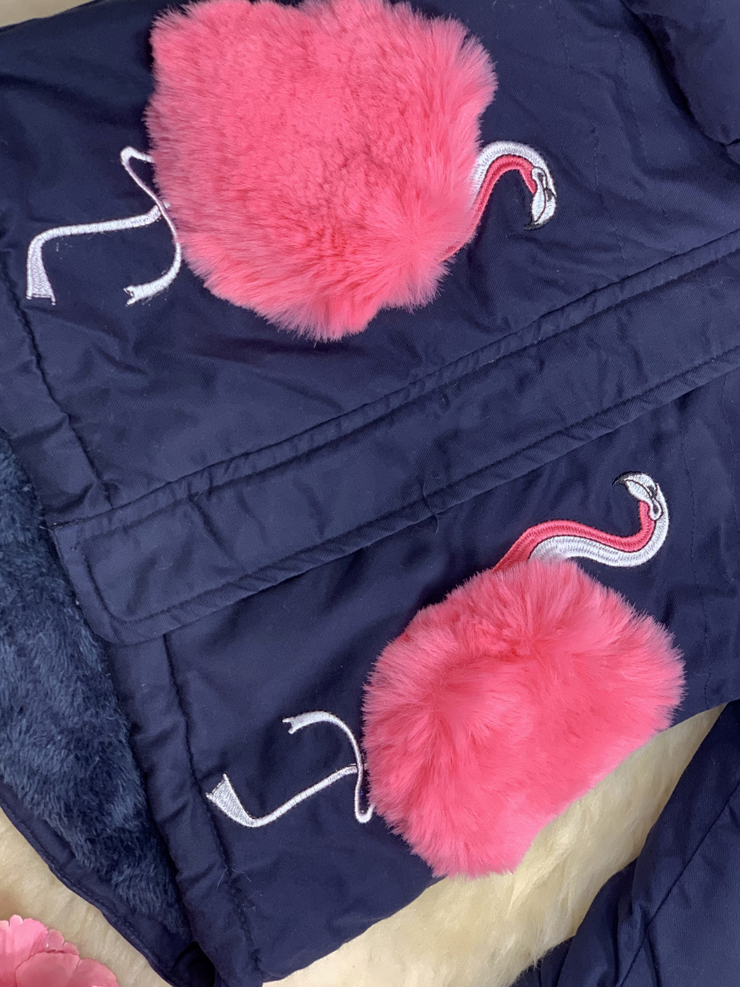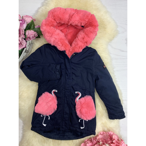 - kurtka z modnymi naszyciami flamingów dodatkowo zdobione futerkiem (odczepiane)