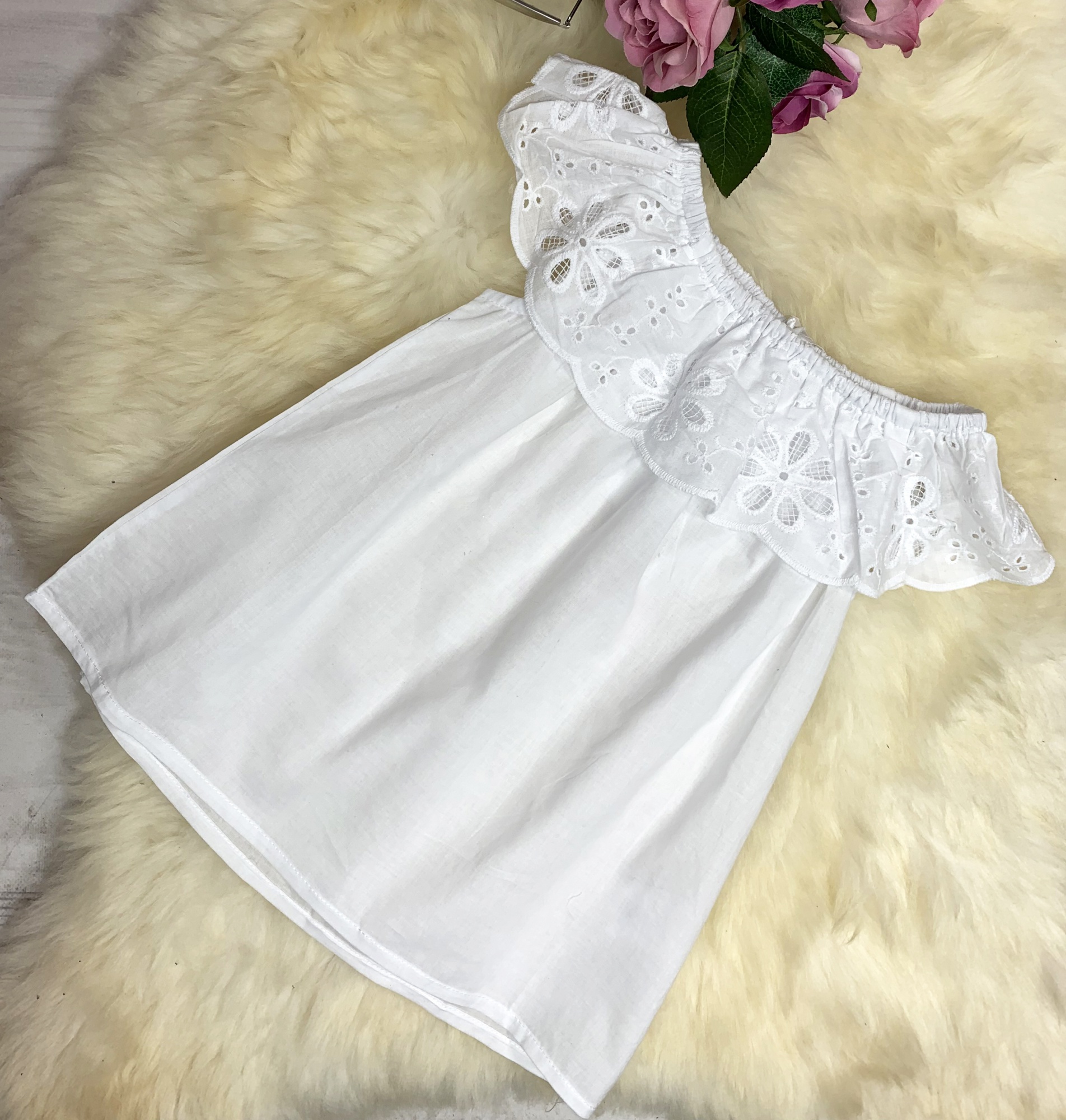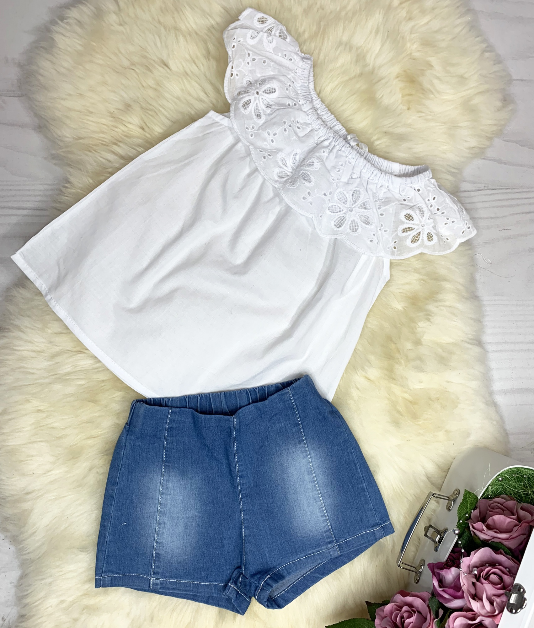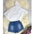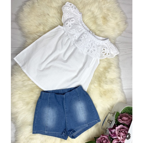 Komplet bluzka falbanka + spodenki jeans - kolor biały