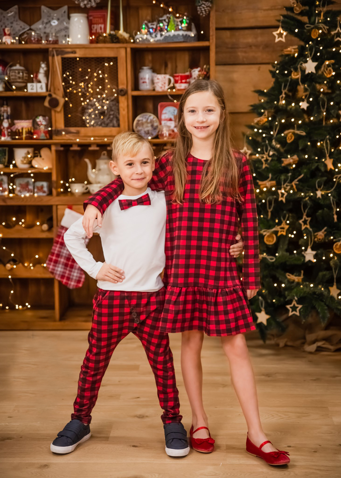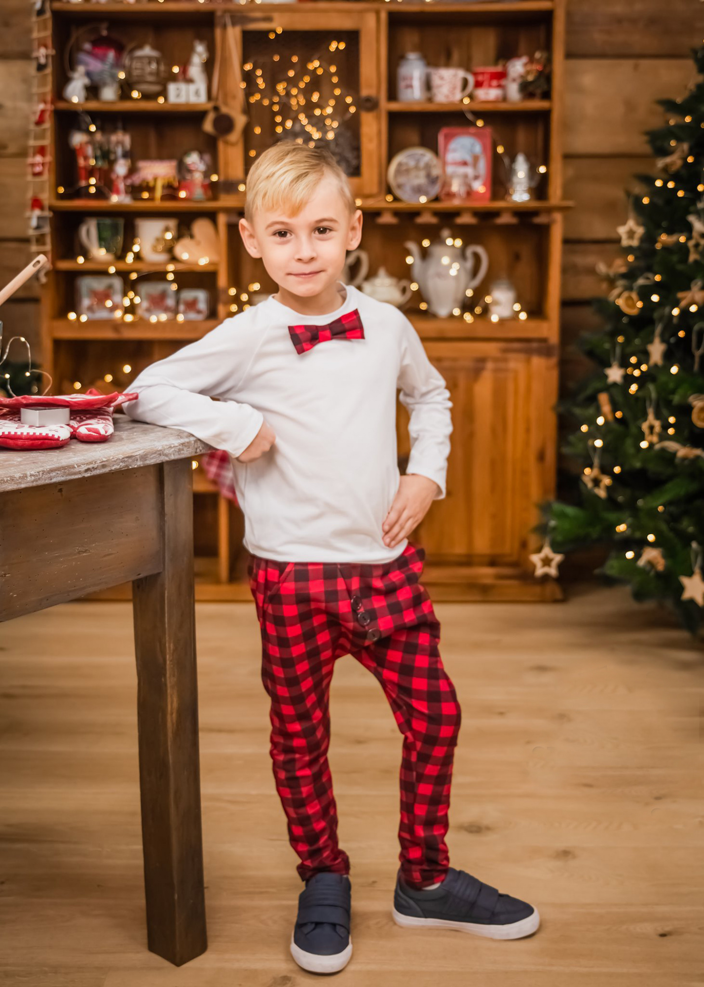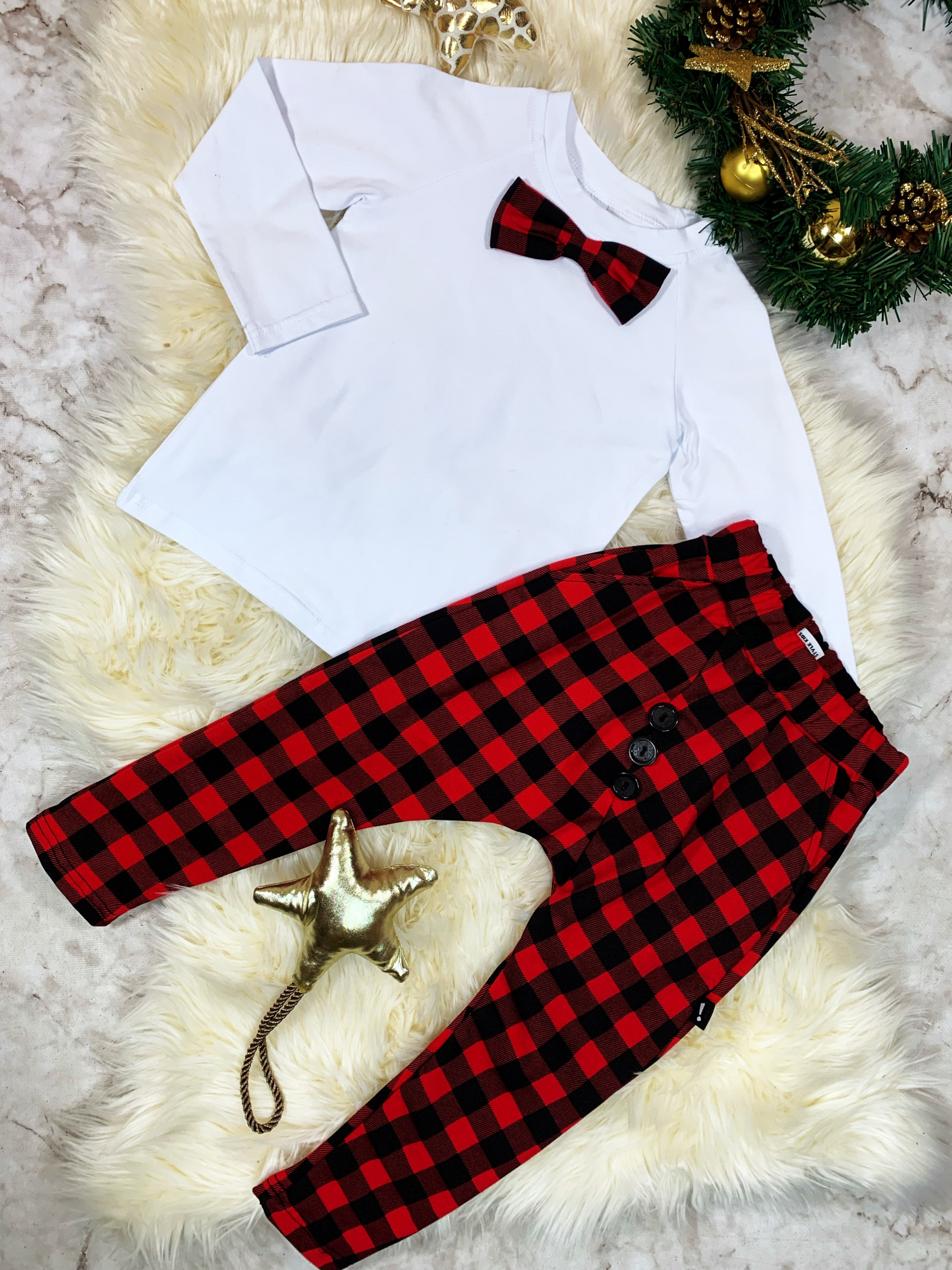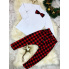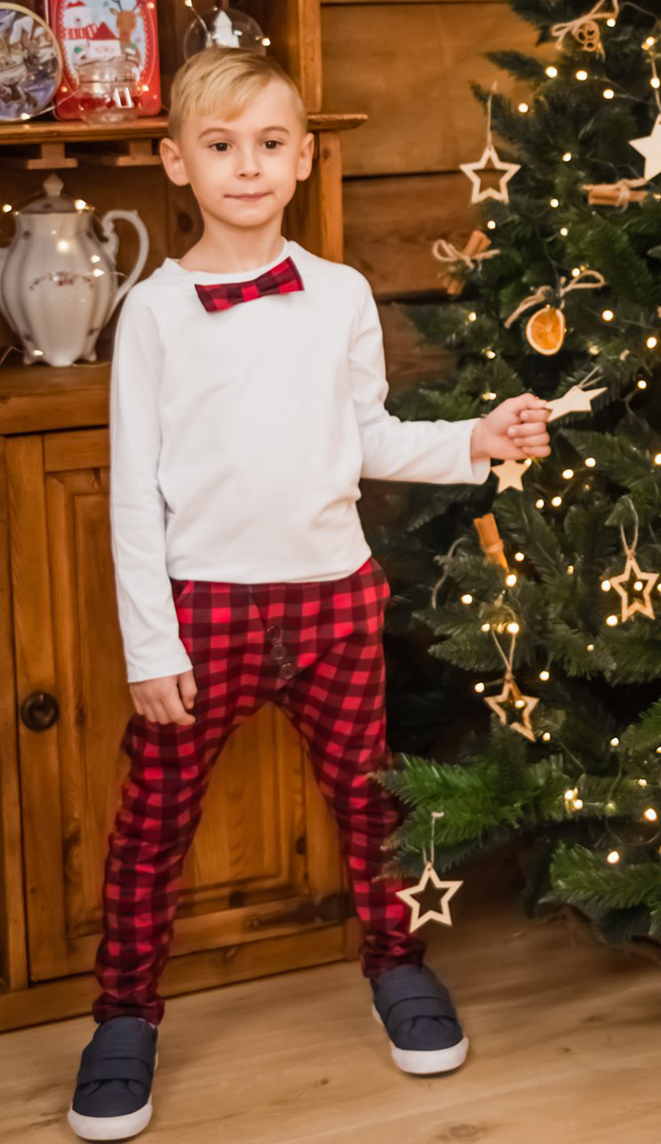 - na zestaw składają się bluzeczka biała z muszką oraz spodnie w modną kratę