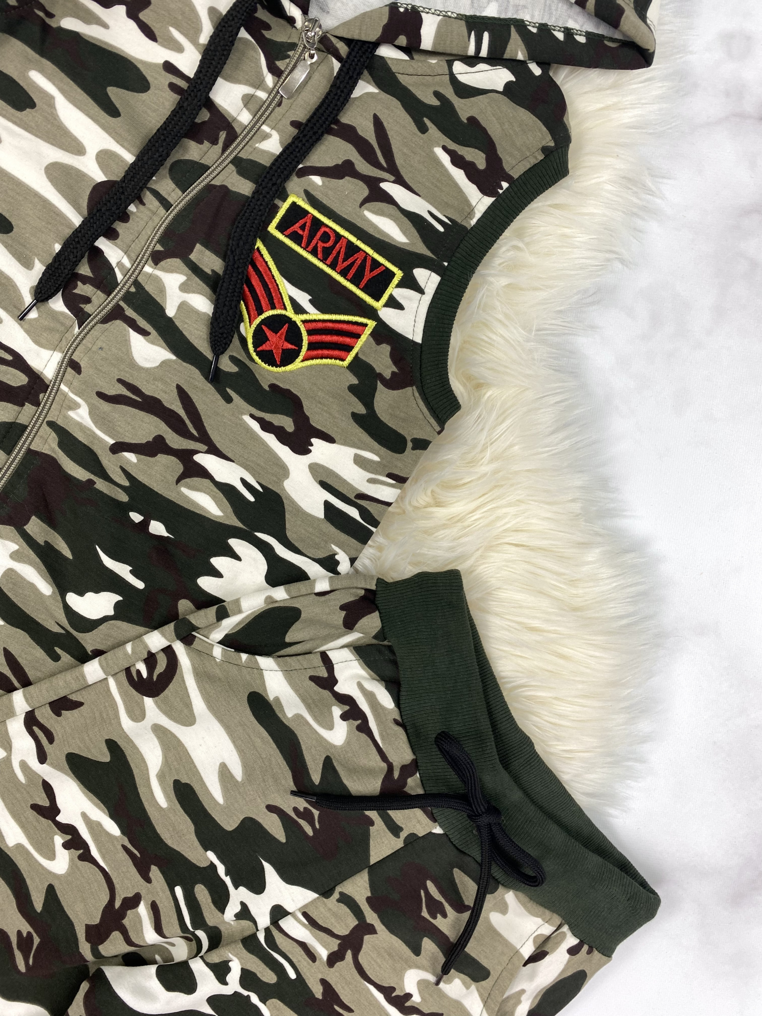 • kamizelka z kapturem zapinana na zamek, ozdobne naszywki
