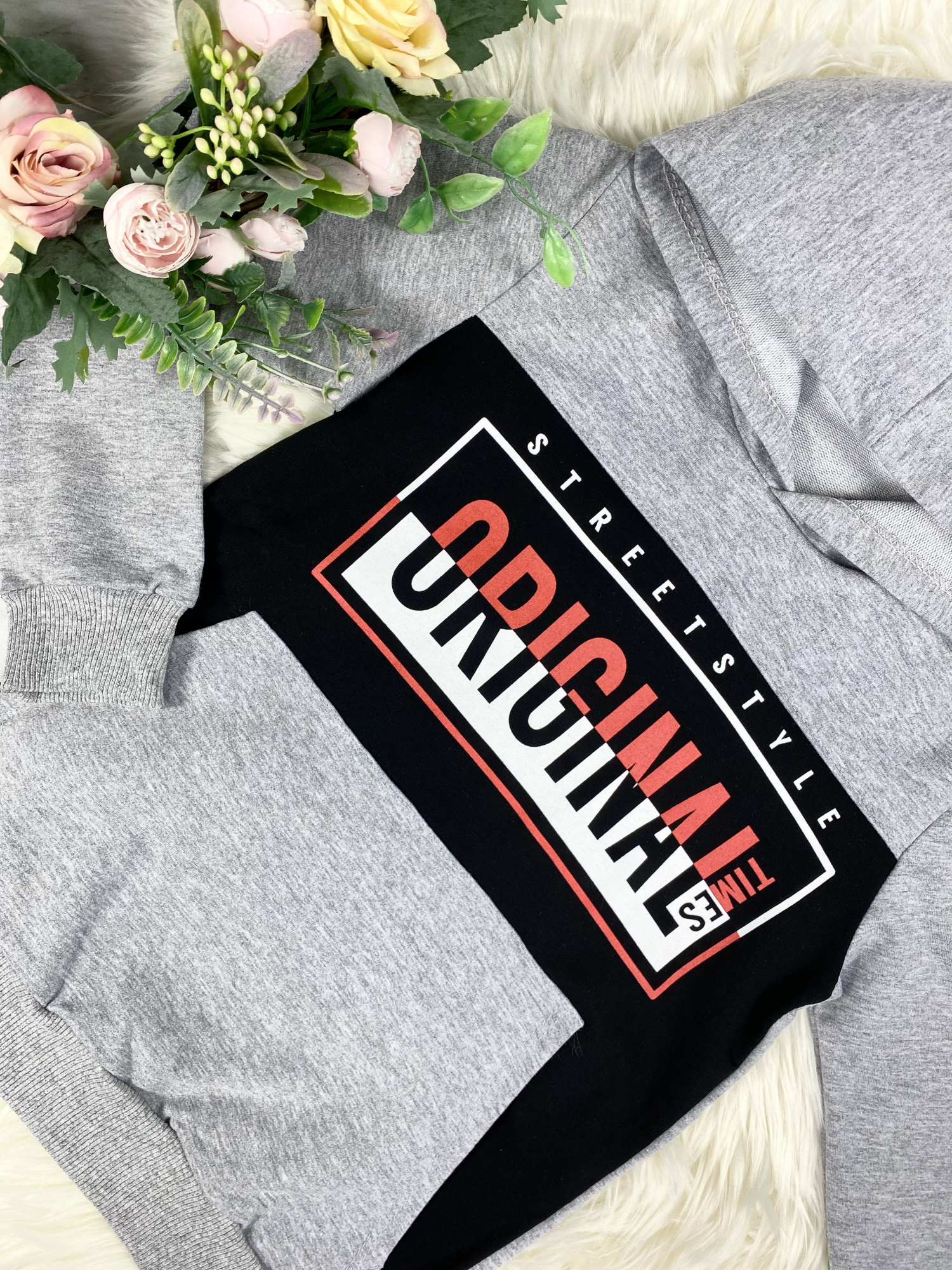 - bluza z połączonych materiałów w kolorze szarym i czarnym, zakładana przez głowę,