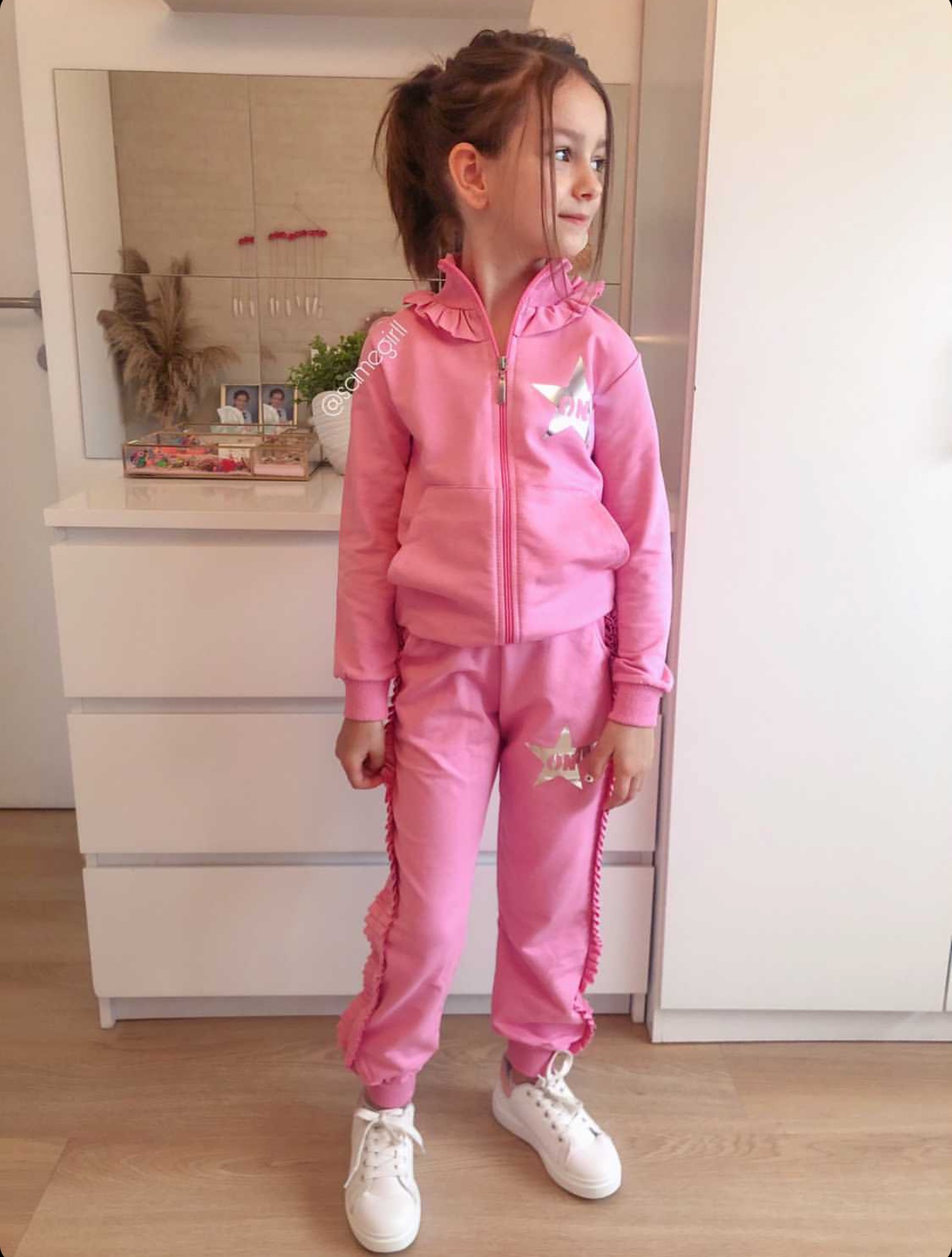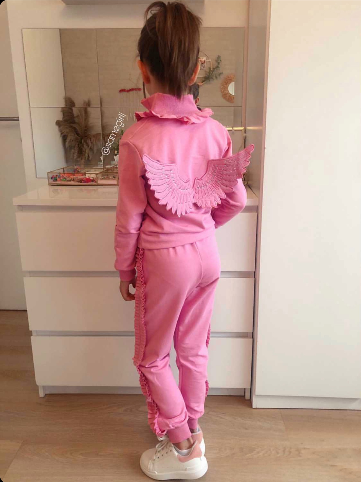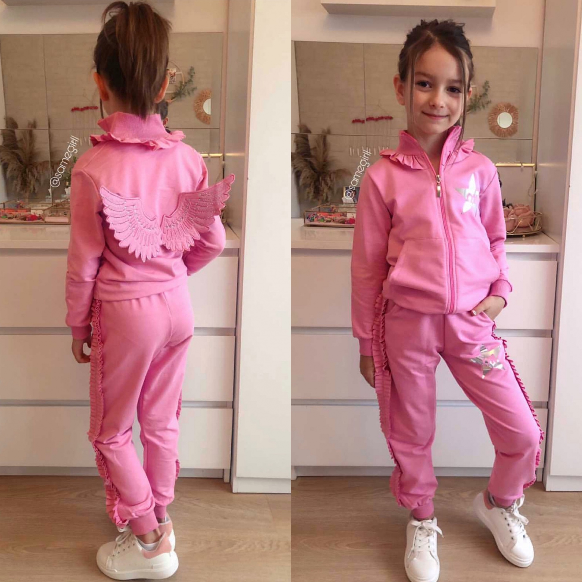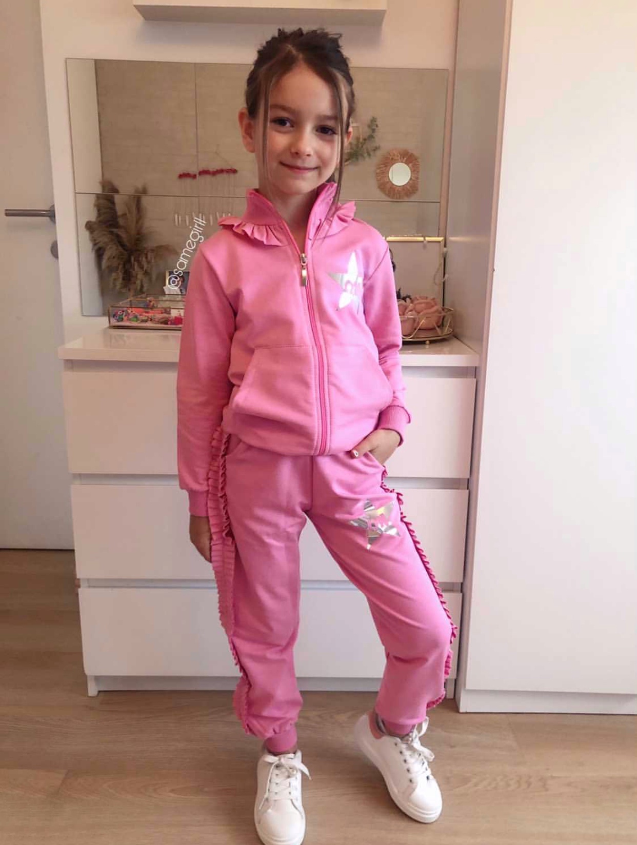 - komplet ozdobiony z falbankami wzdłóż nogawek oraz przy szyji