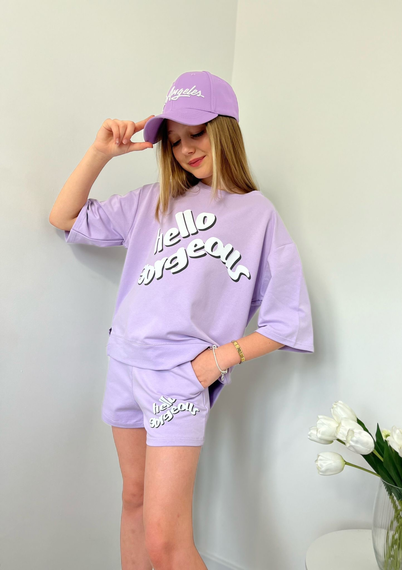 ozdobny nadruk z napisem Hello Gorgeous