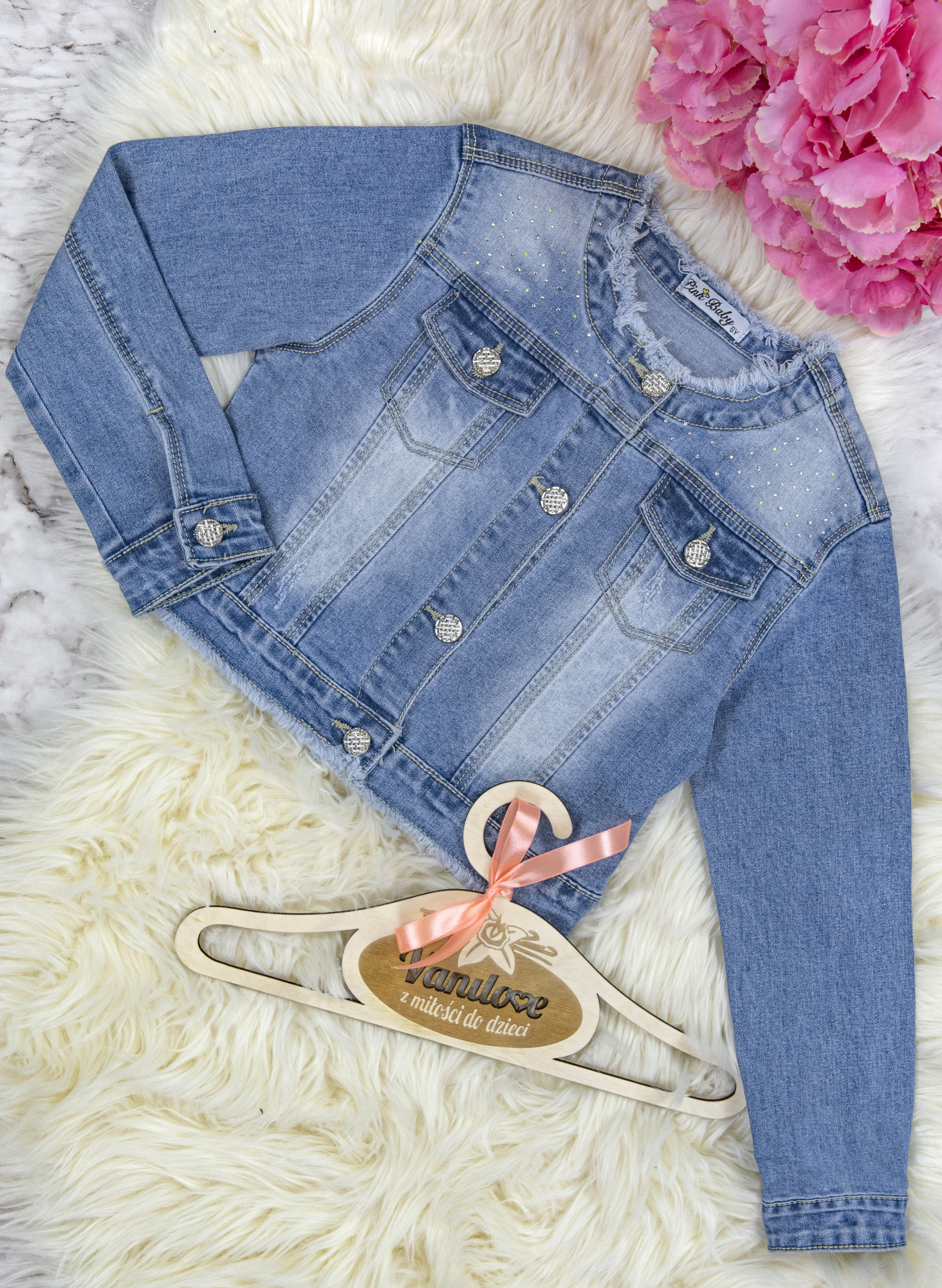 • kurtka jeansowa z zapięciem na guziki, posiada stylowe przetarcia oraz cyrkonie na wysokości ramion