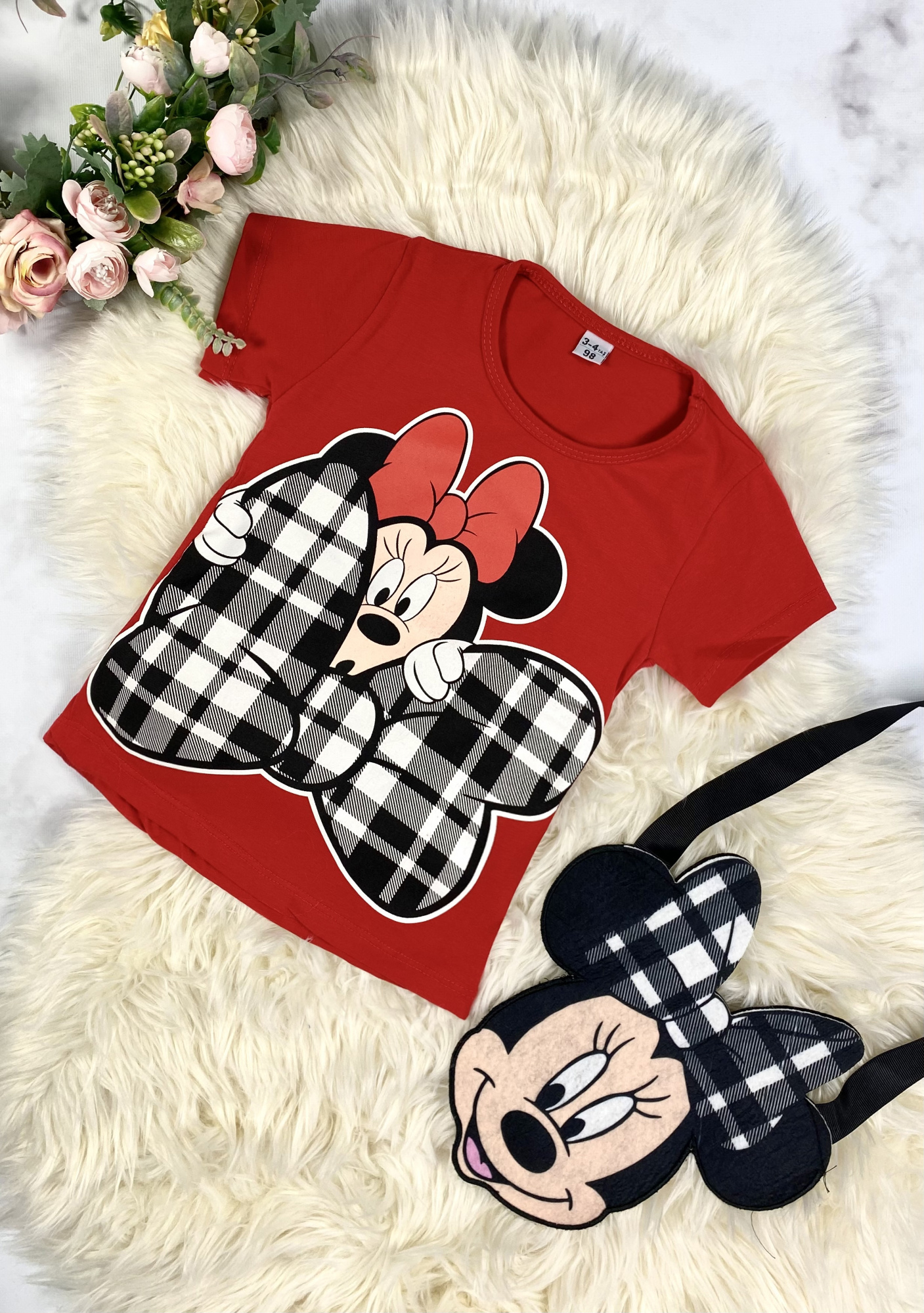 • czerwona biała bluzka z nadrukiem z kultową myszką Minnie