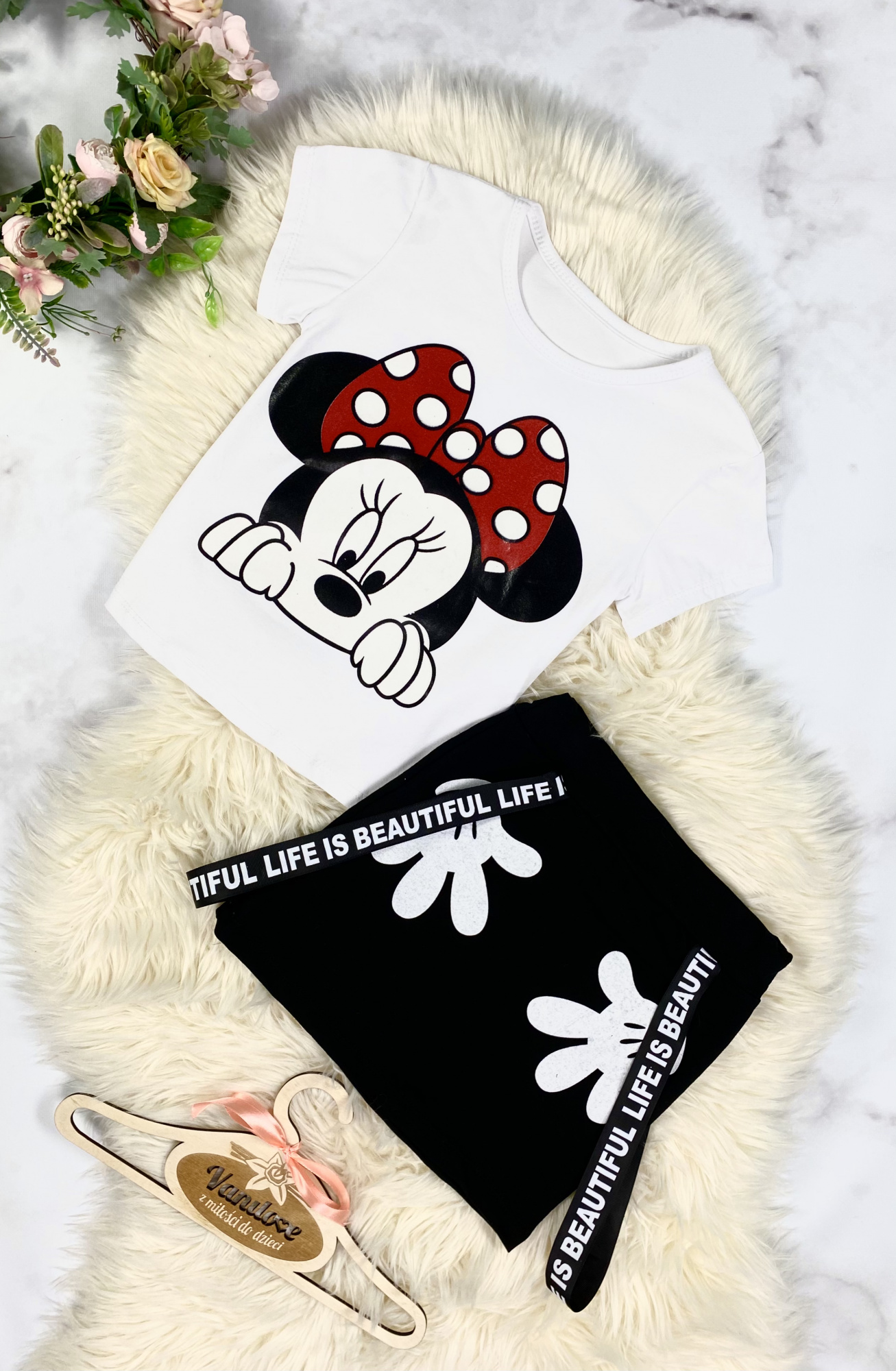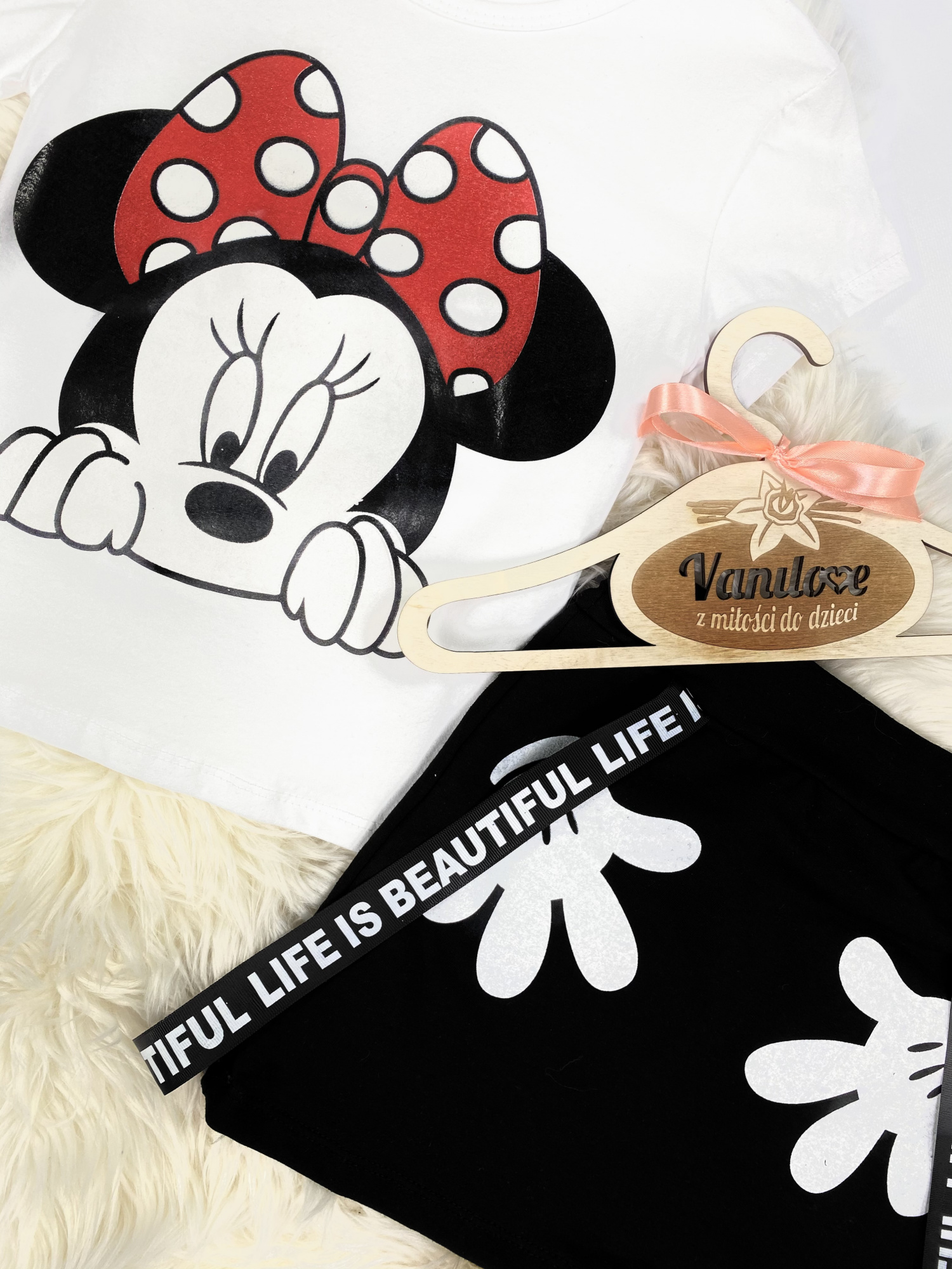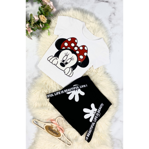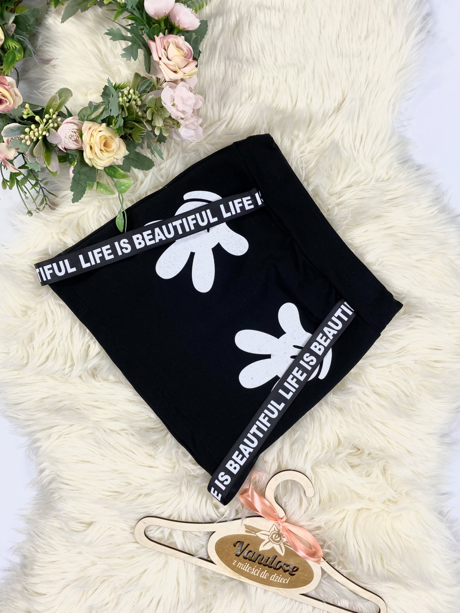 - spódniczka z nadrukiem łapek i paseczkami imitującymi szelki z białymi napisami