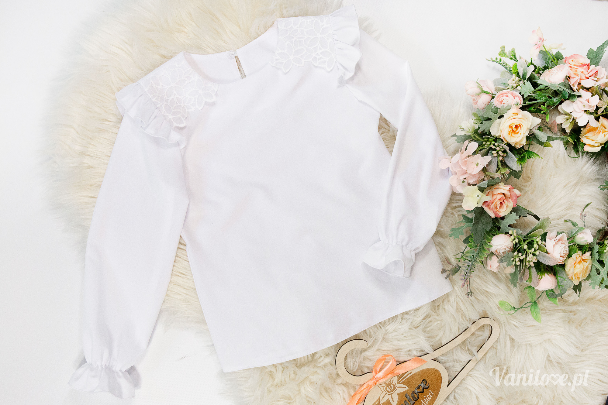 - zdobiona na ramionach haftem, rękawky z gumeczkami rozkloszowane