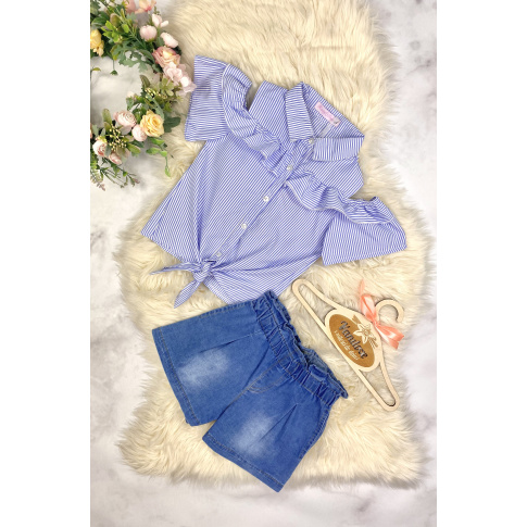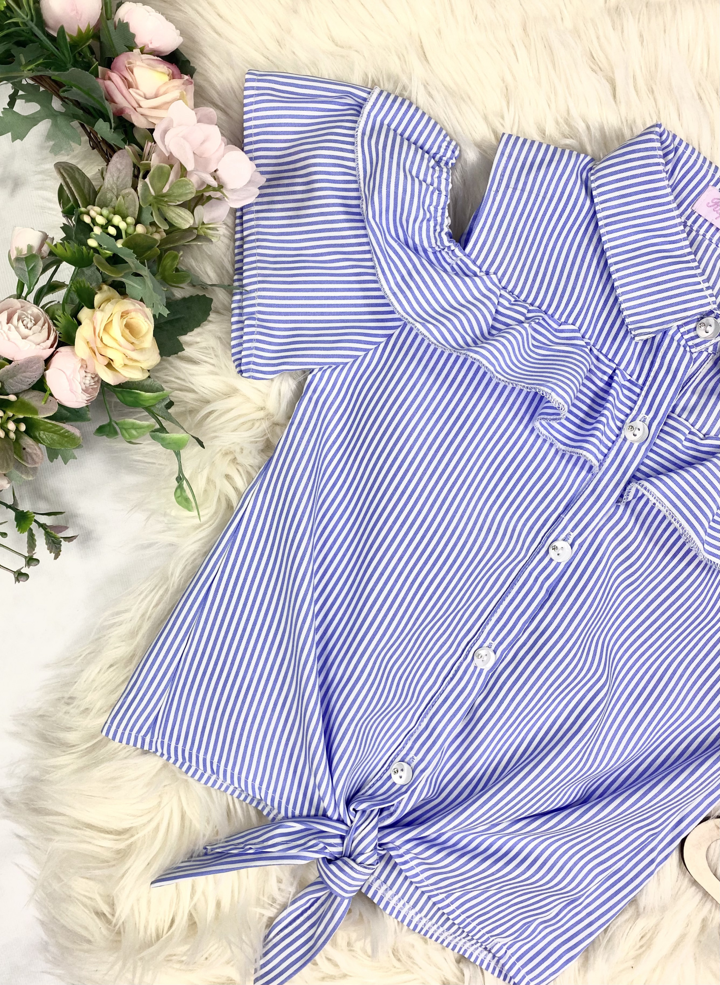 - bluzkę zdobią wycięcia w okloicy ramion oraz falbanka i dodatkowe wiązanie z dołu
