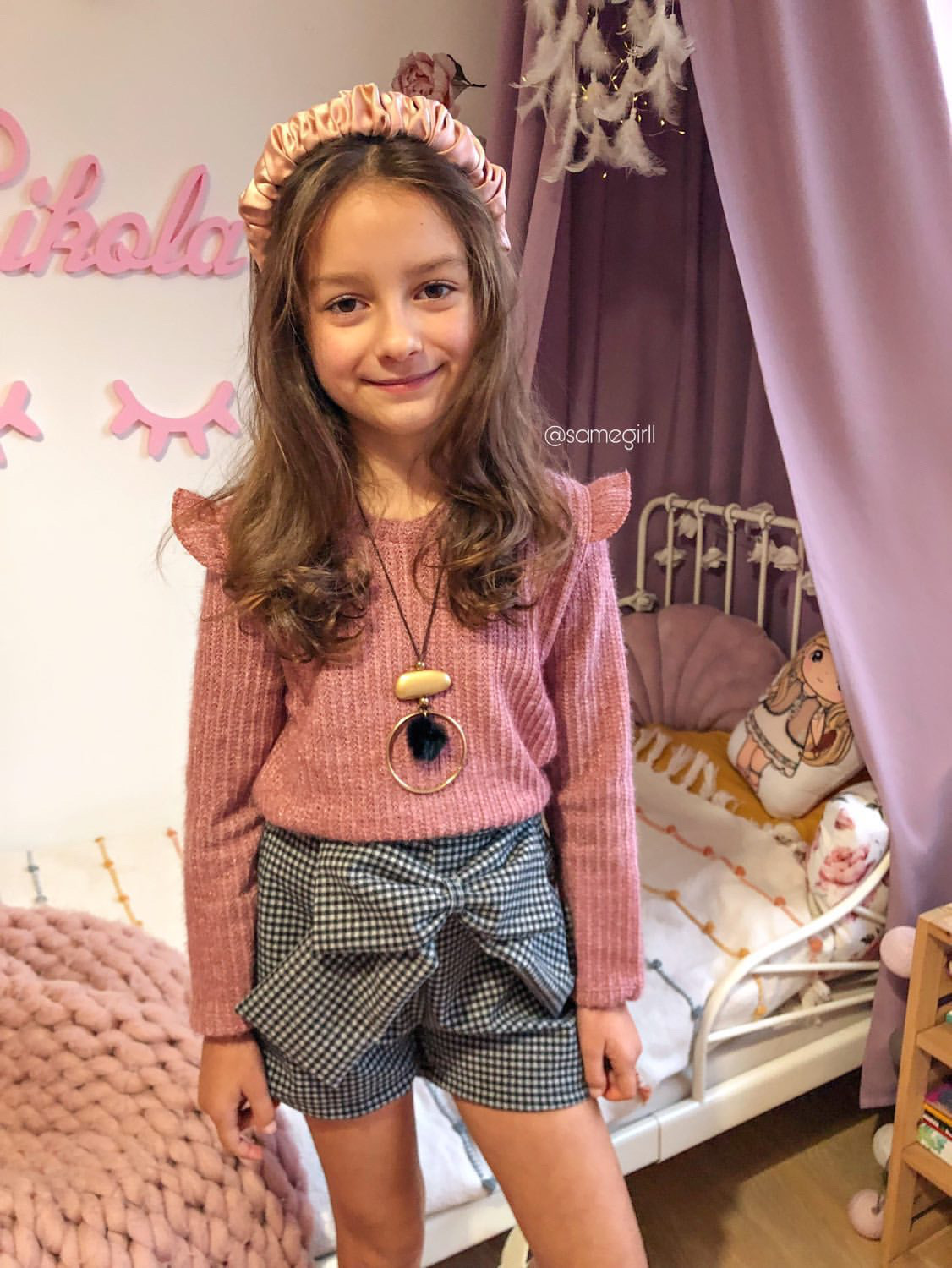 - sweterek z falbankami na ramionach i ozdobnym łańcuszkiem na rzemyku