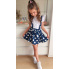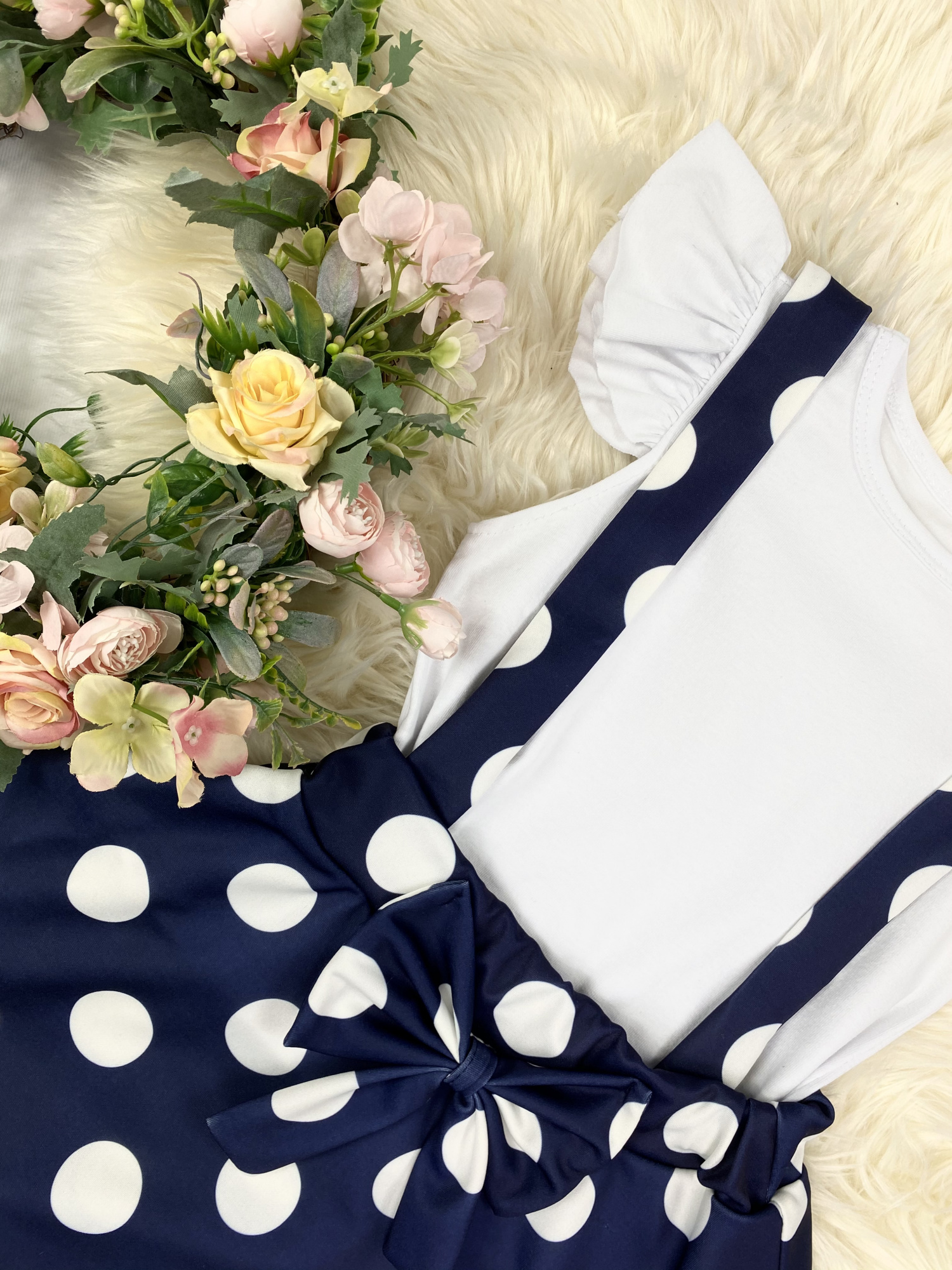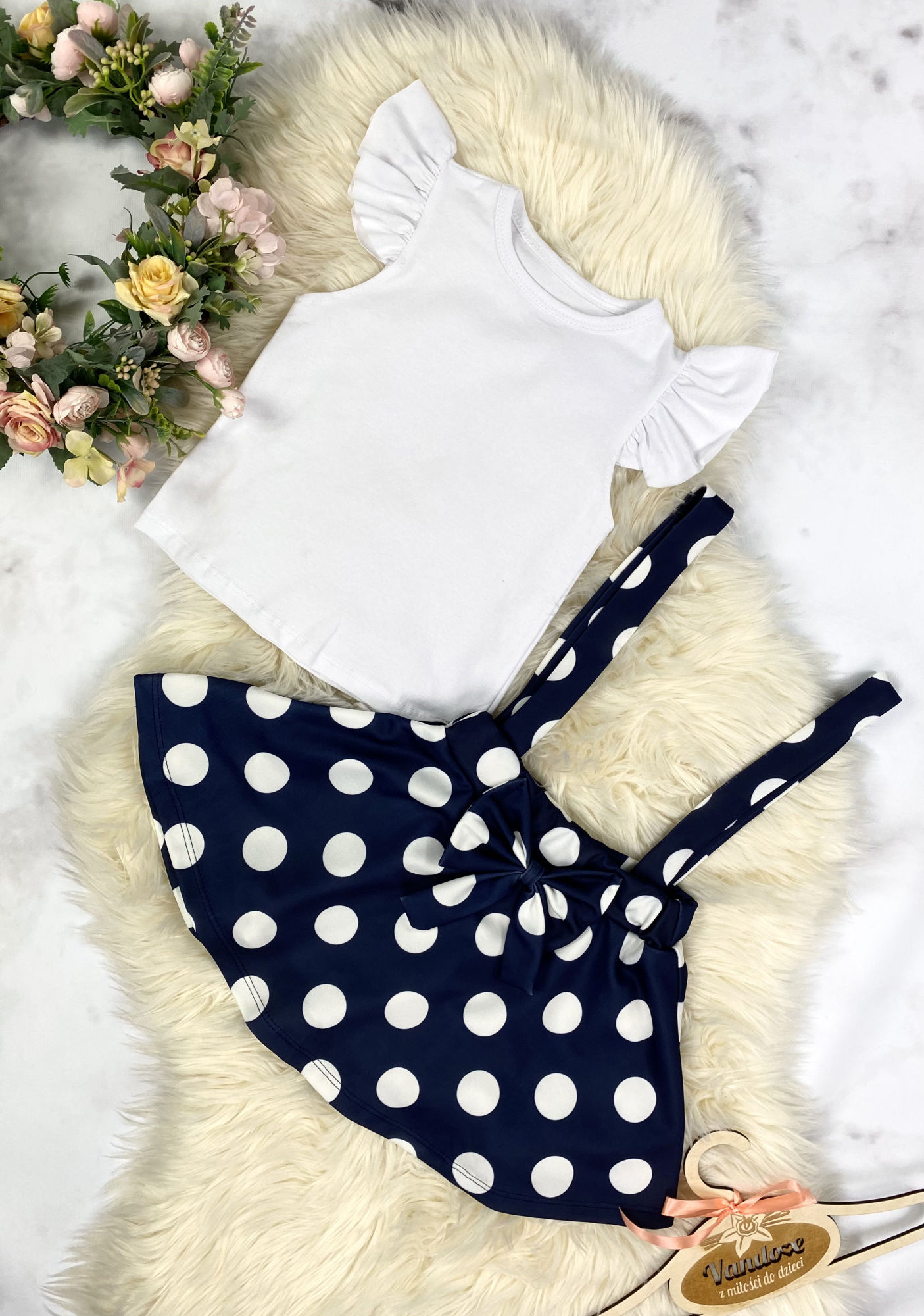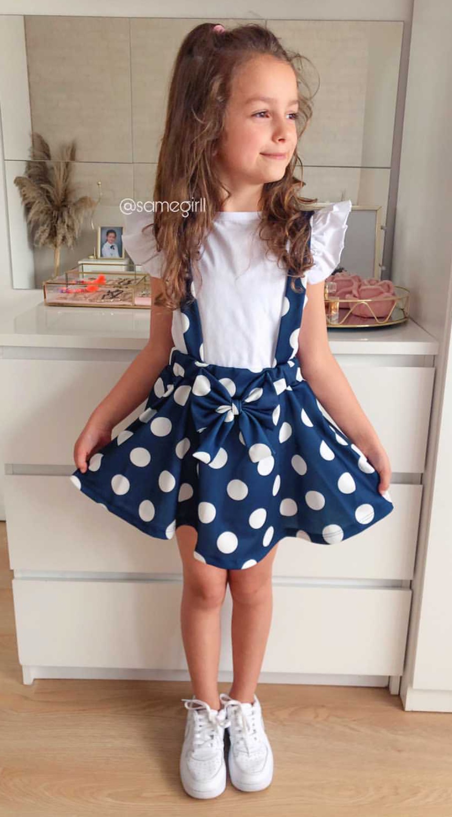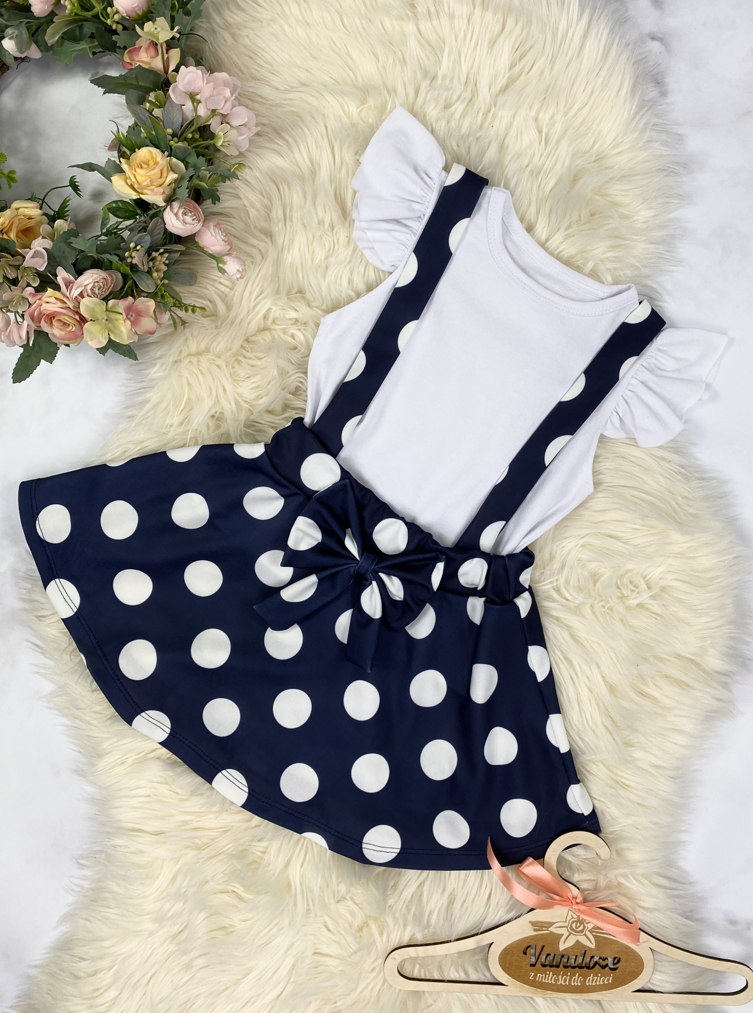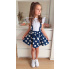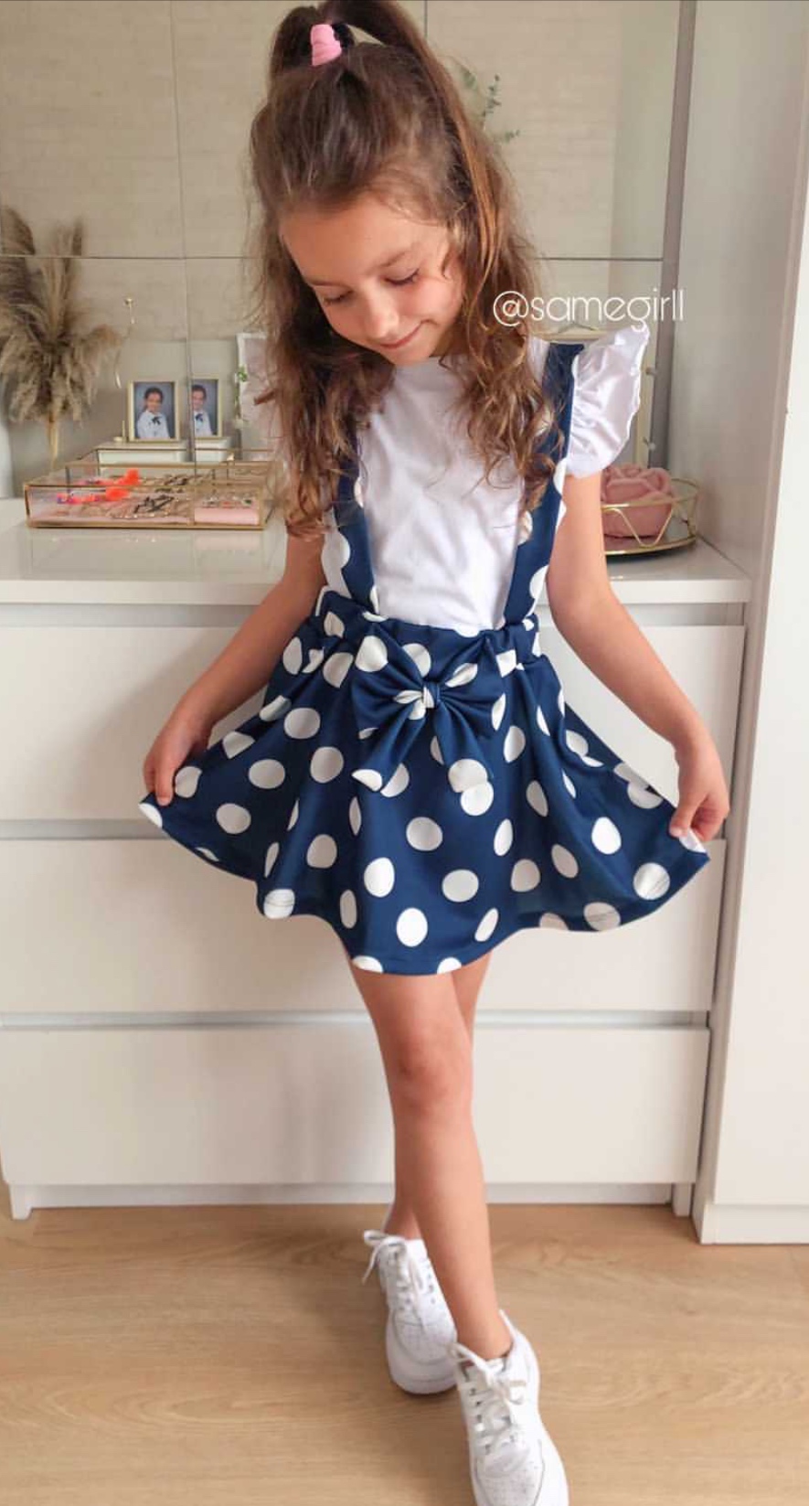 • spódnica w groszki z kokardką oraz szelkami , w pasie posiada elastyczną gumkę