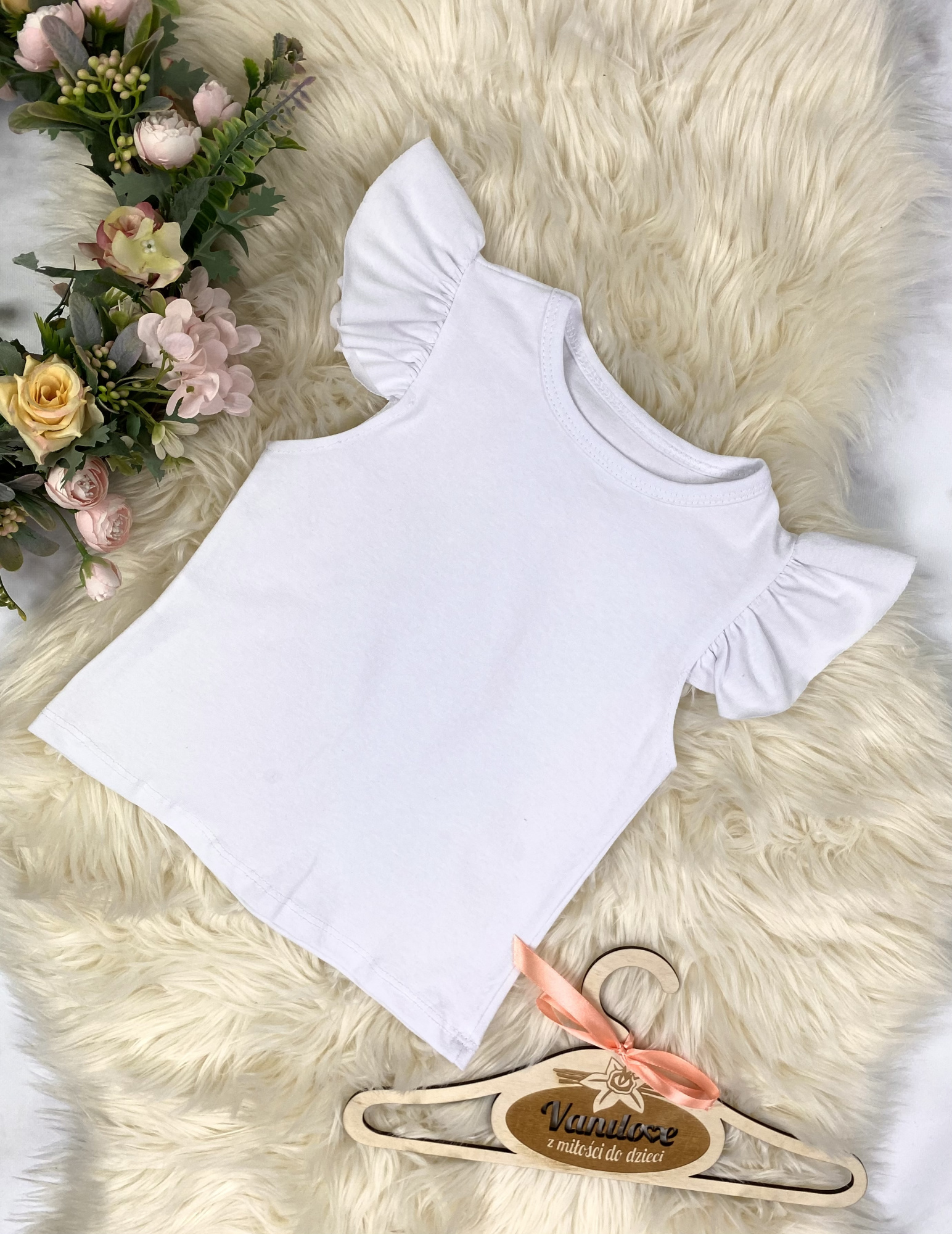 • biała klasyczna bluzka zdobiona falbankami przy rękawkach