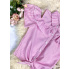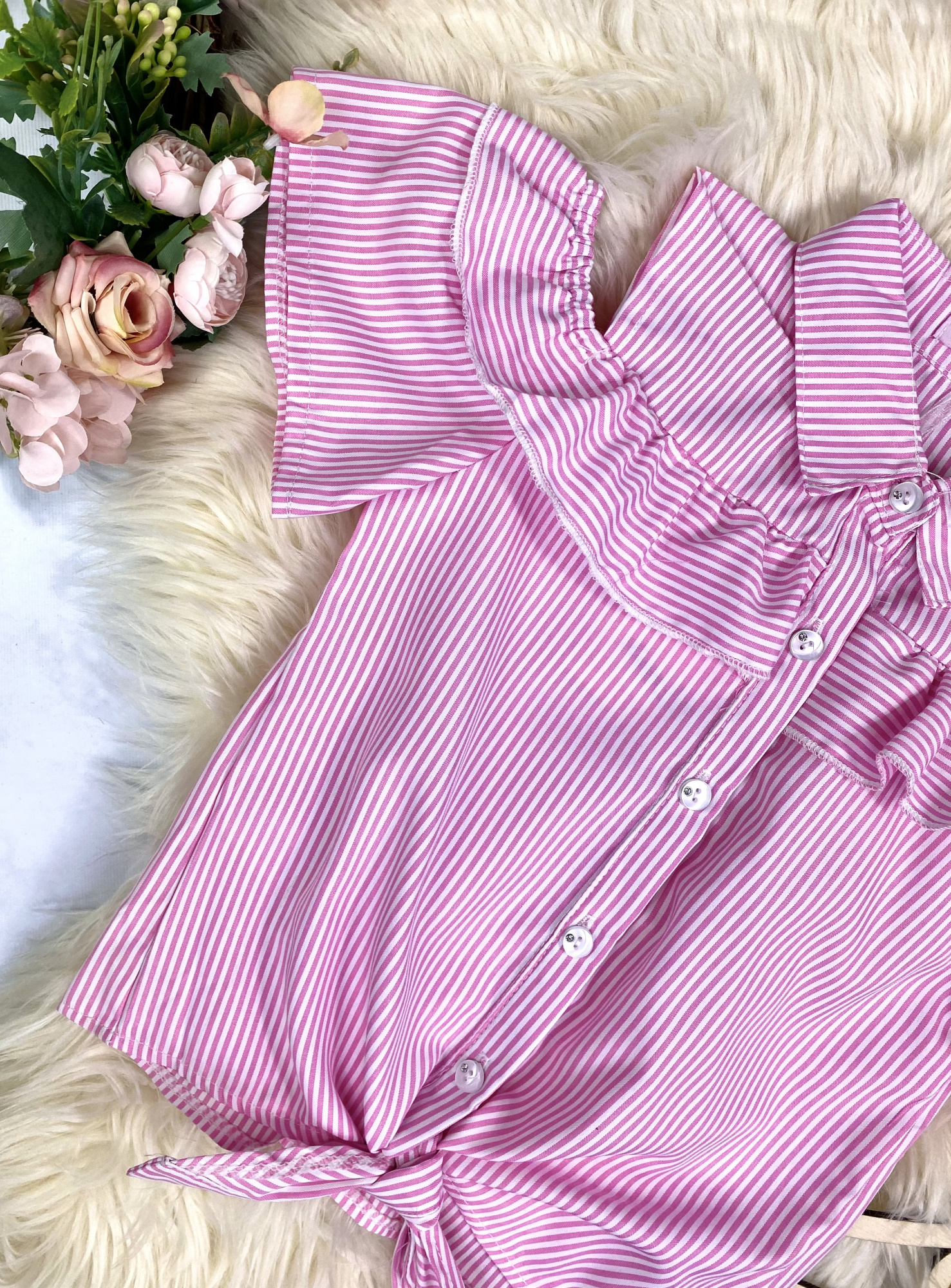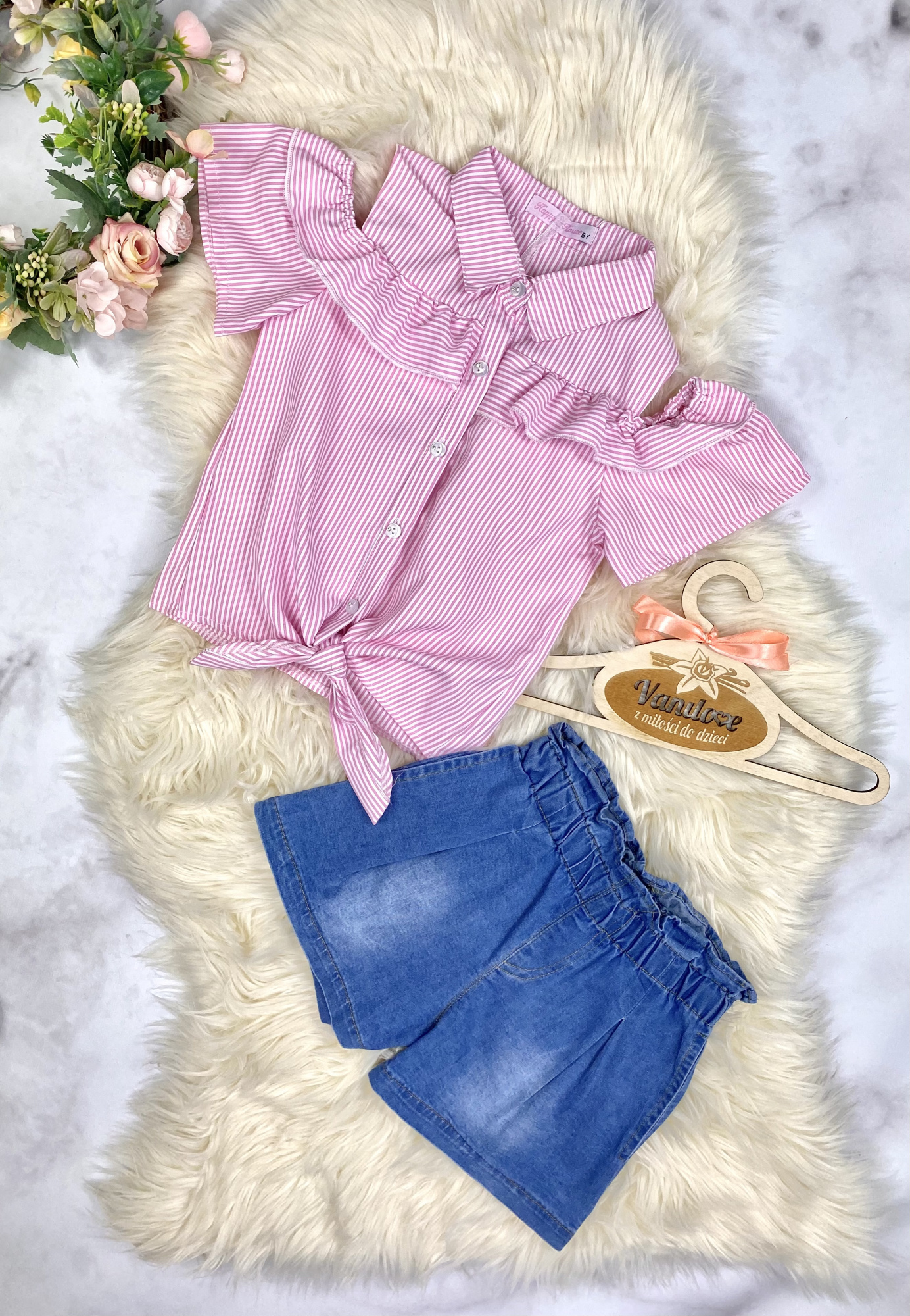 - bluzkę zdobią wycięcia w okloicy ramion oraz falbanka i dodatkowe wiązanie z dołu