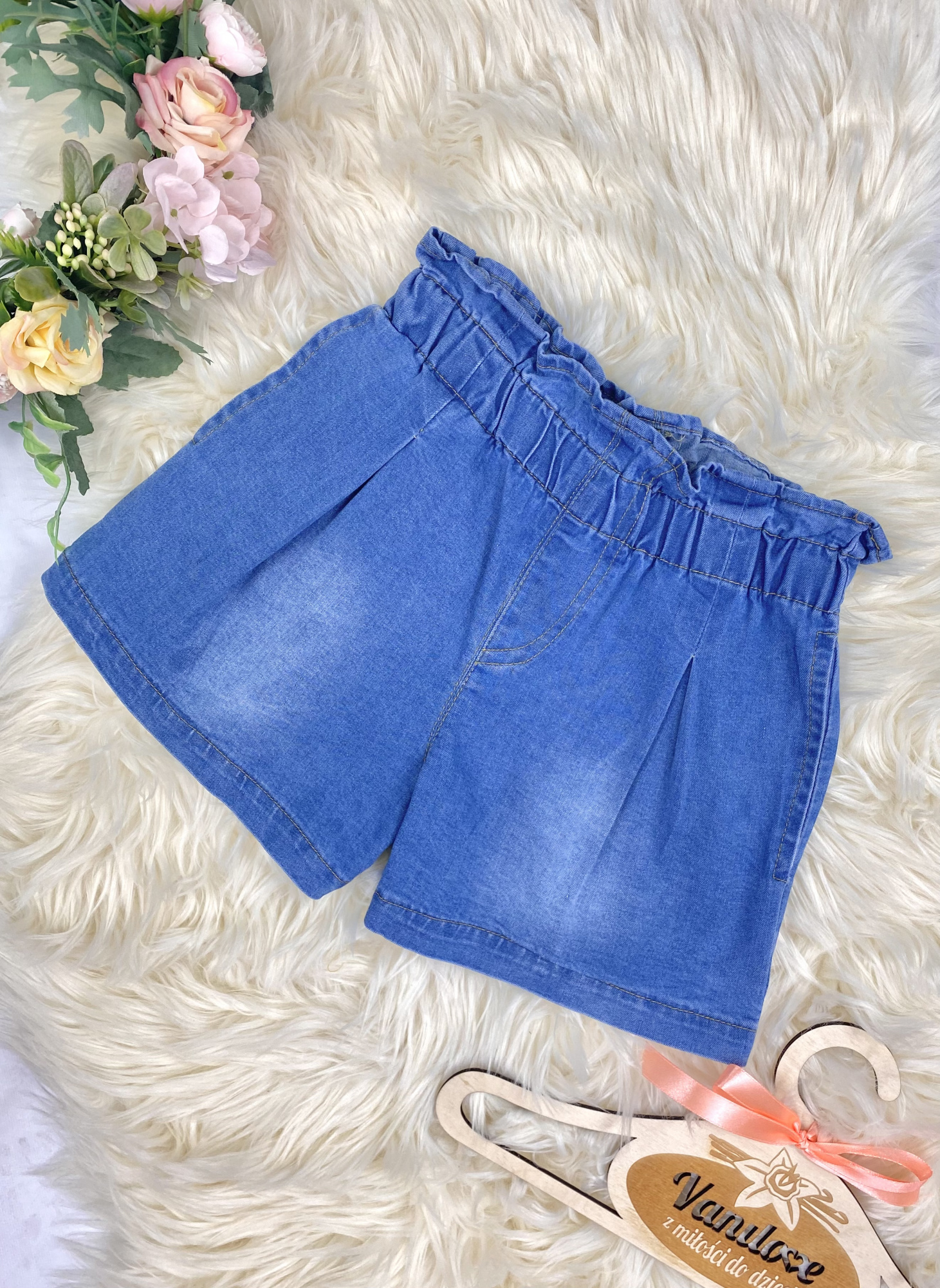 - spodenki z elastycznego, cienkiego jeansu, w pasie posiadają elastyczną gumkę