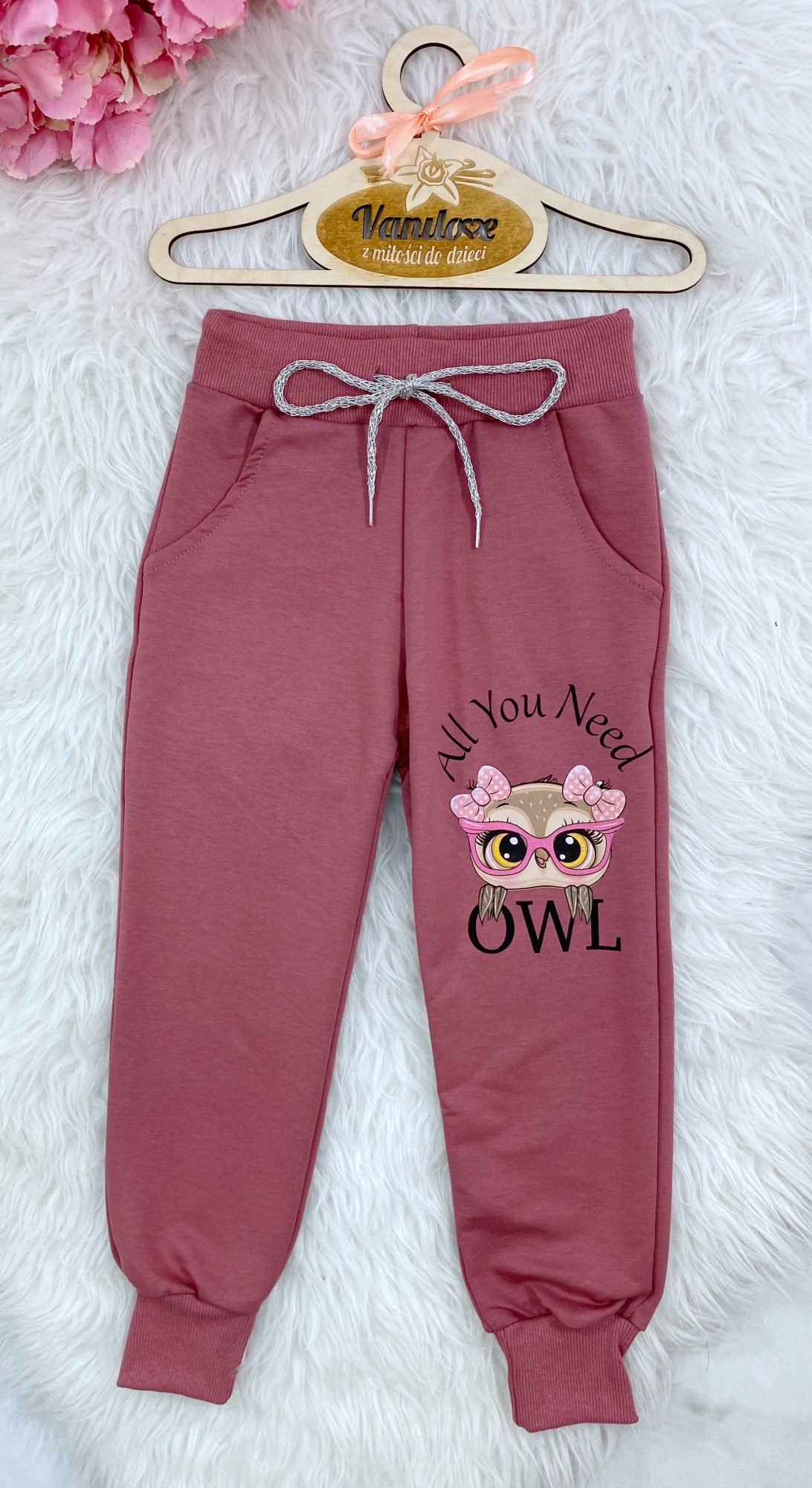 - spodnie z kieszeniami, z nadrukiem sowy na lewej nogawce