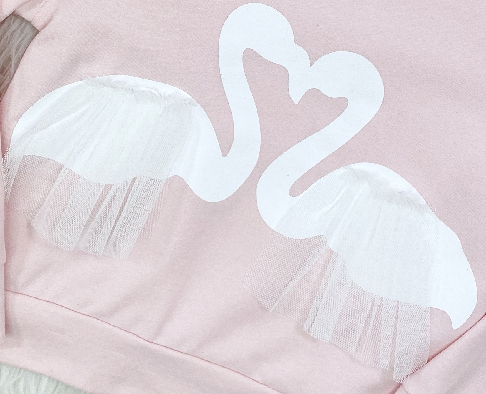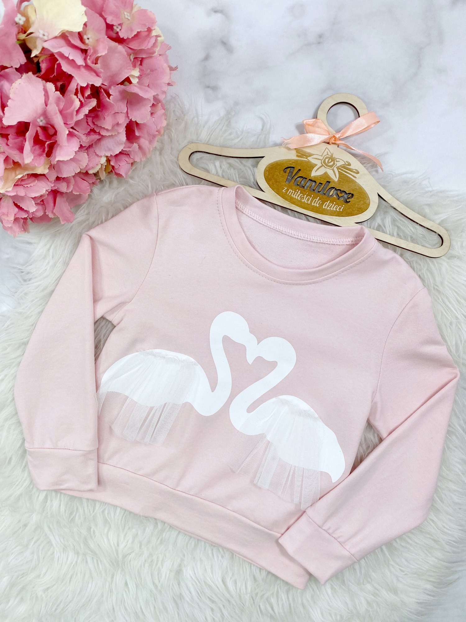 - bluza zdobiona uroczymi nadrukami łabędzi z szyfonowymi falbankami