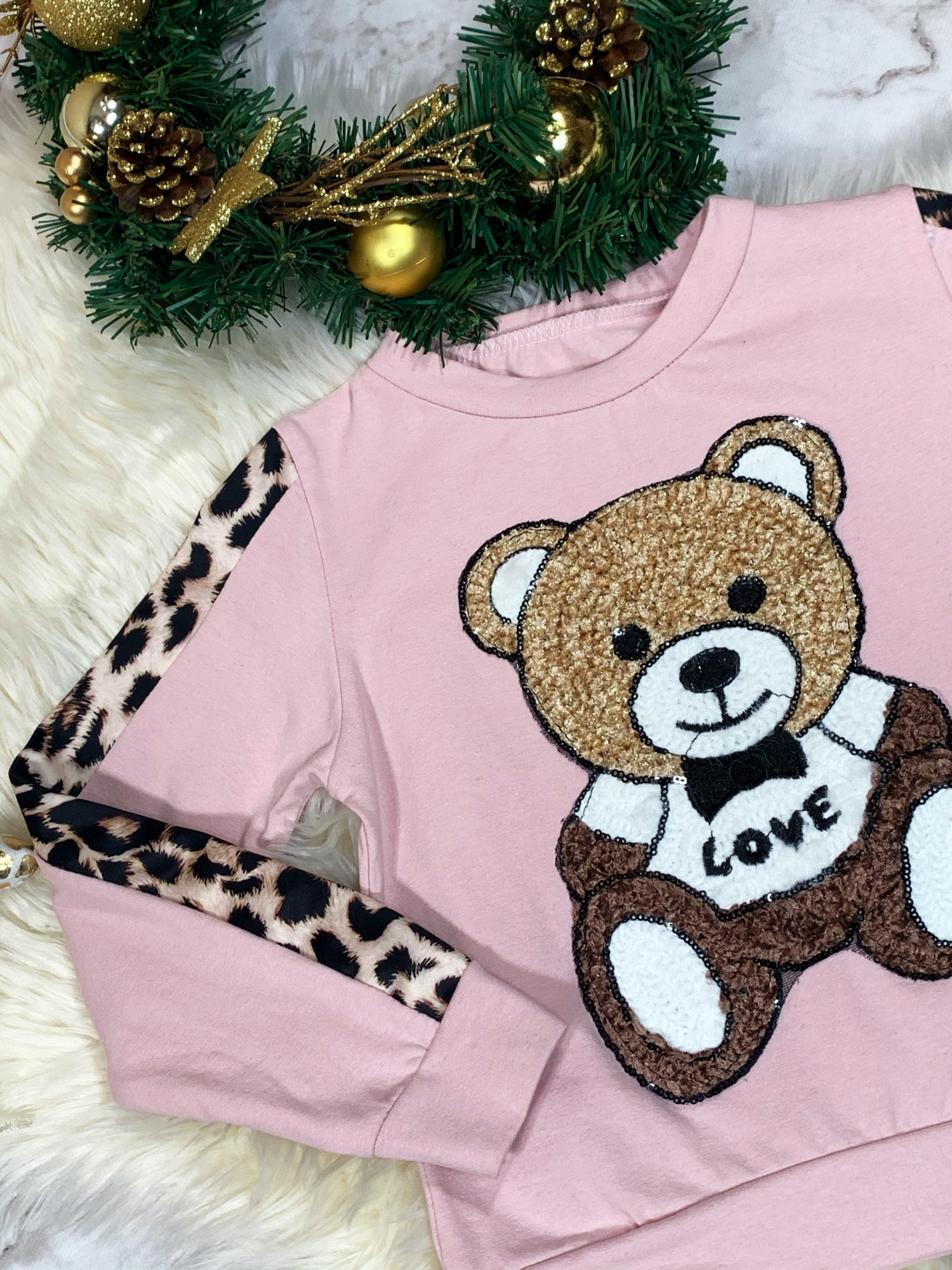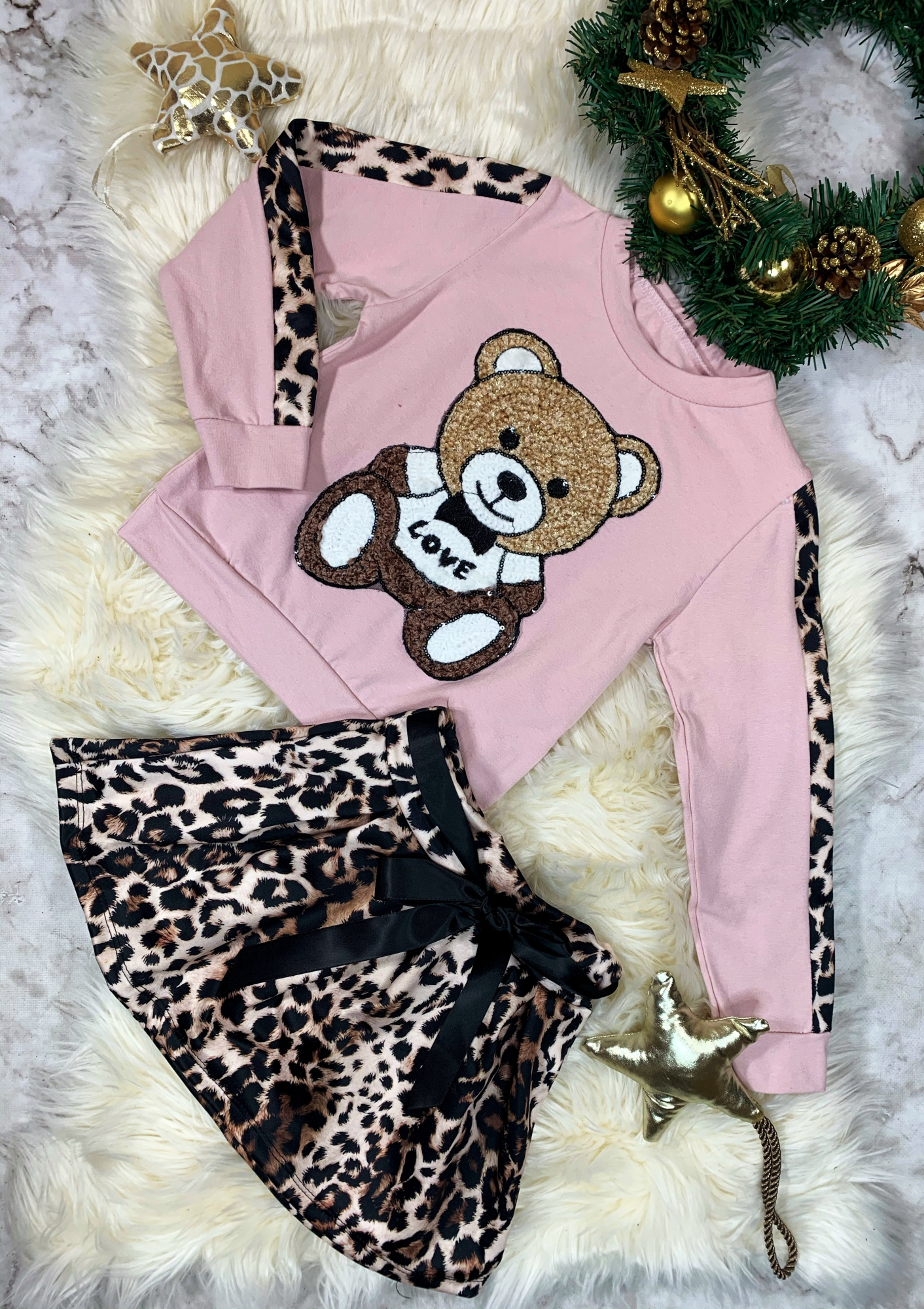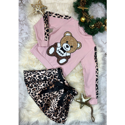 - na komplet składa się bluza z ozdobną naszywką uroczego misia, na rękawach ozdobne panterkowe wstawki