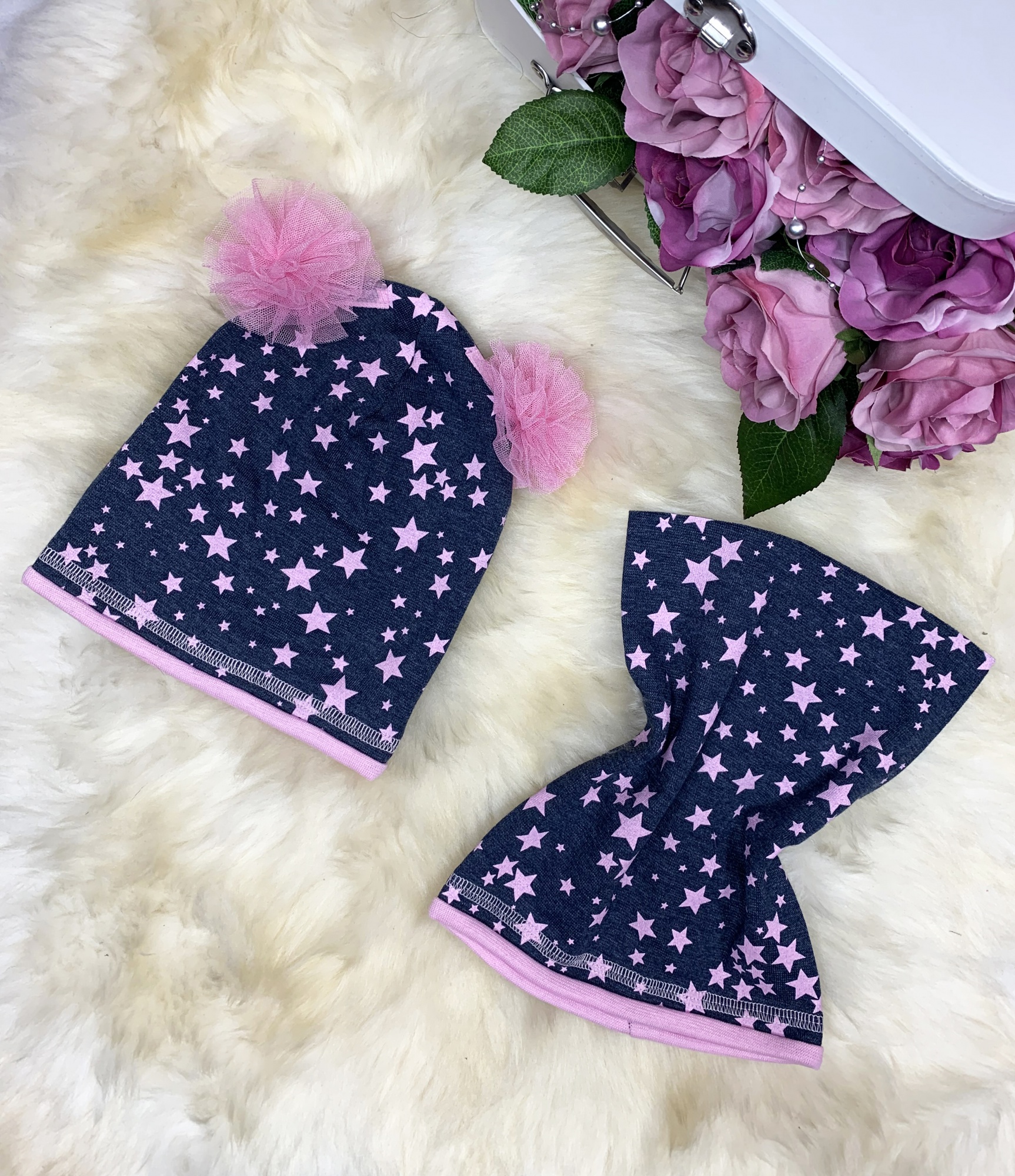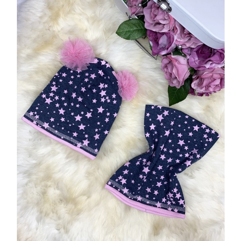Komplet Gwiazdki Czapka + Komin - Granat + Puder