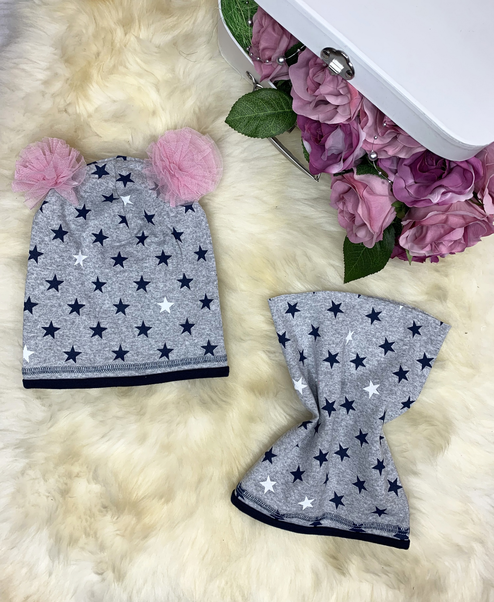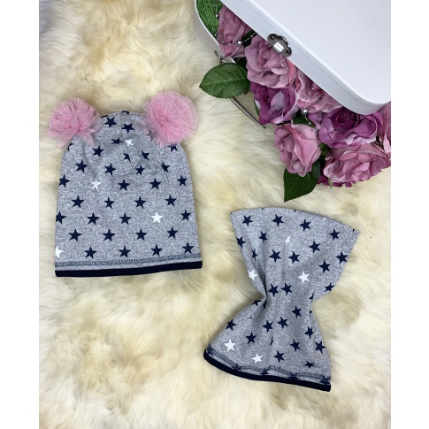 Komplet Gwiazdki Czapka + Komin - Szary + Granat pompony puder