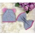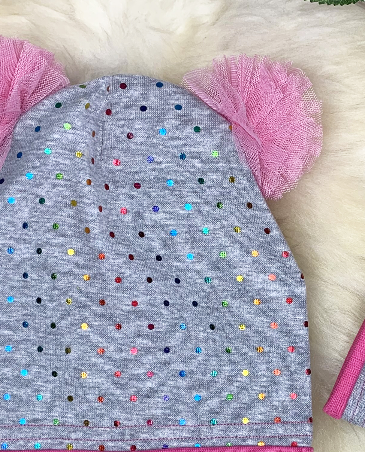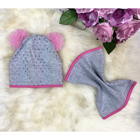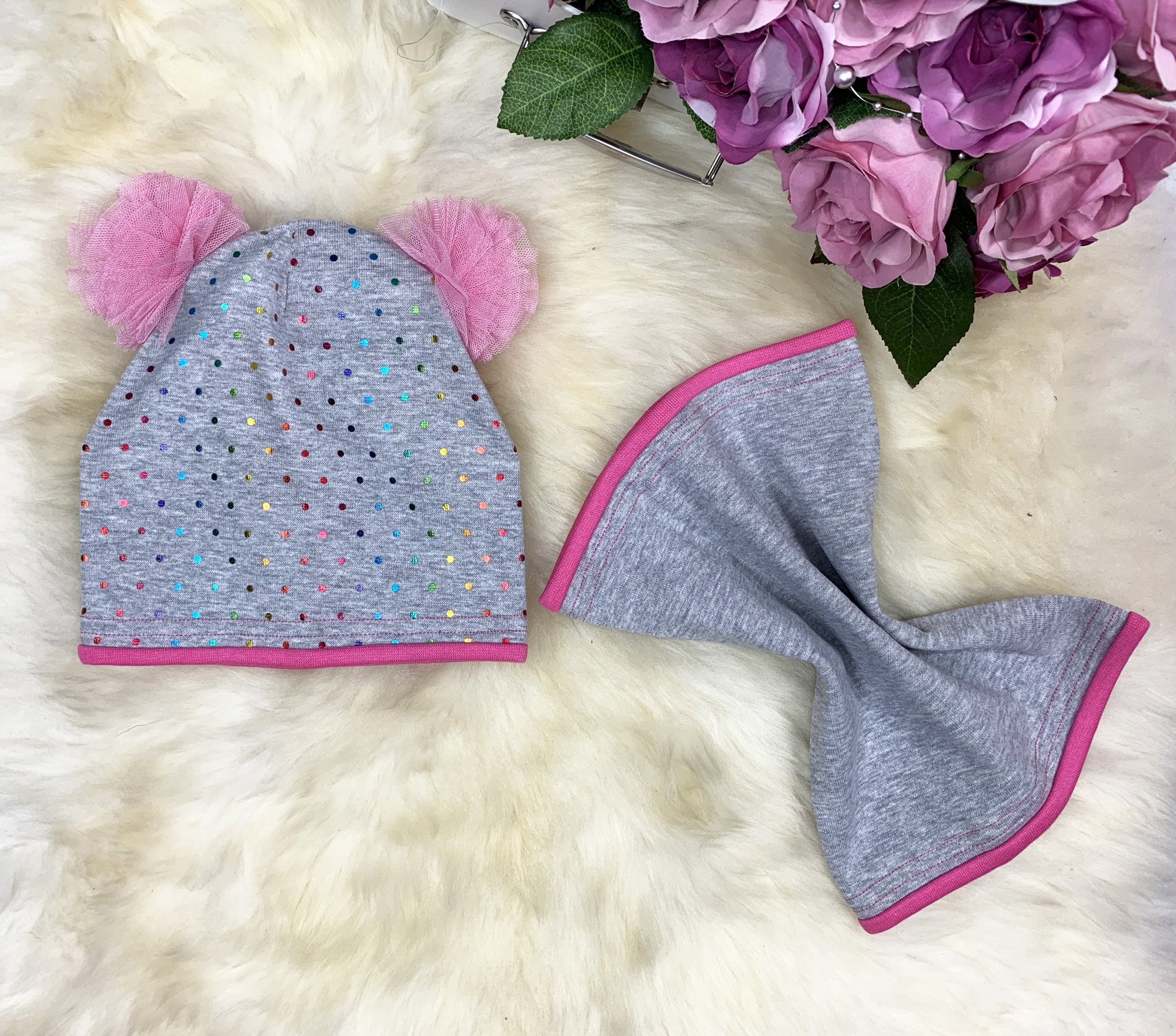 Komplet Połyskujące Groszki Czapka + Komin - Szary + Róż