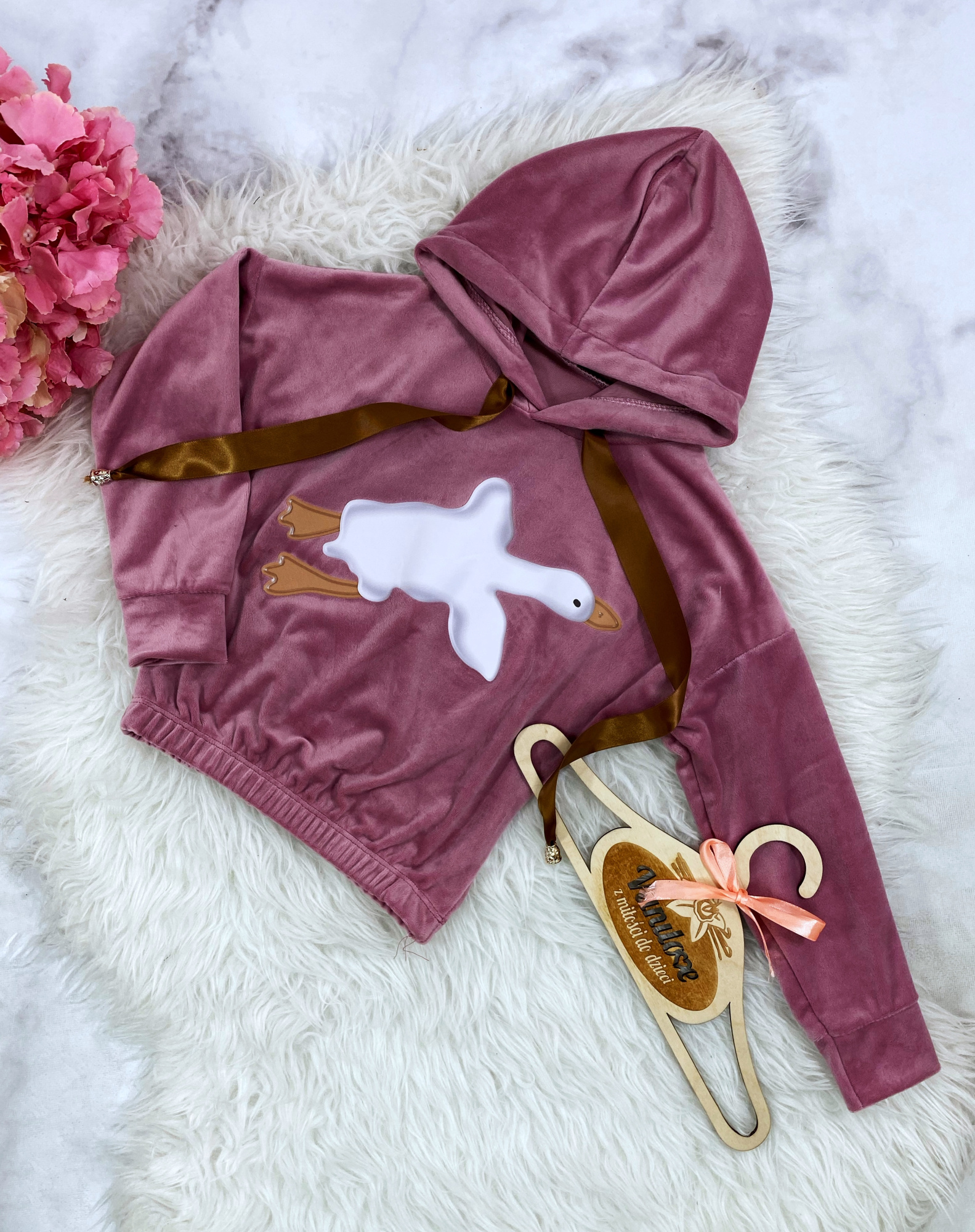 - bluza z kapturem, zdobiona nadrukiem modnej w tym sezonie Gęsi