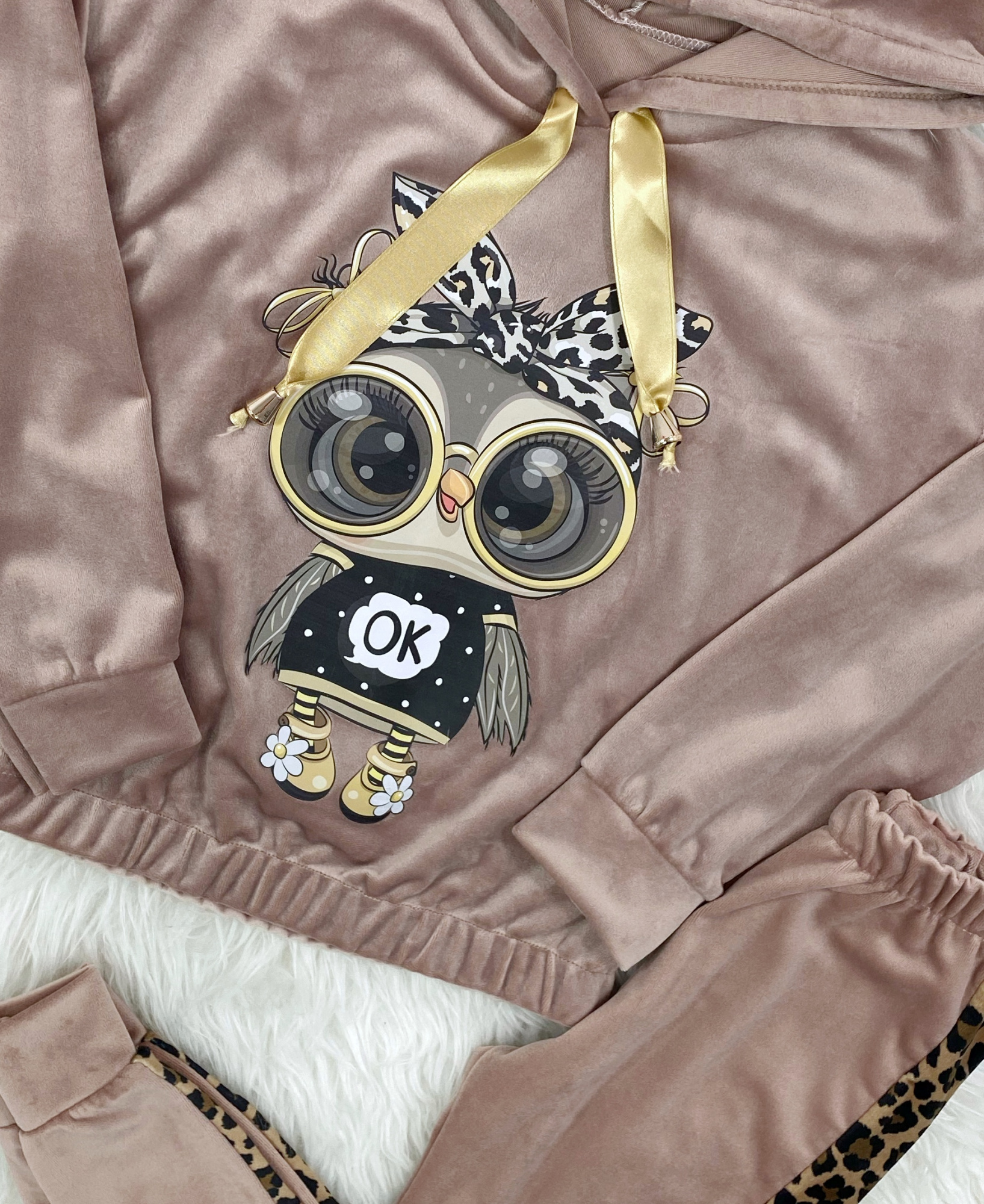 - bluza z kapturem, zdobiona nadrukiem sowy oraz pięknymi troczkami