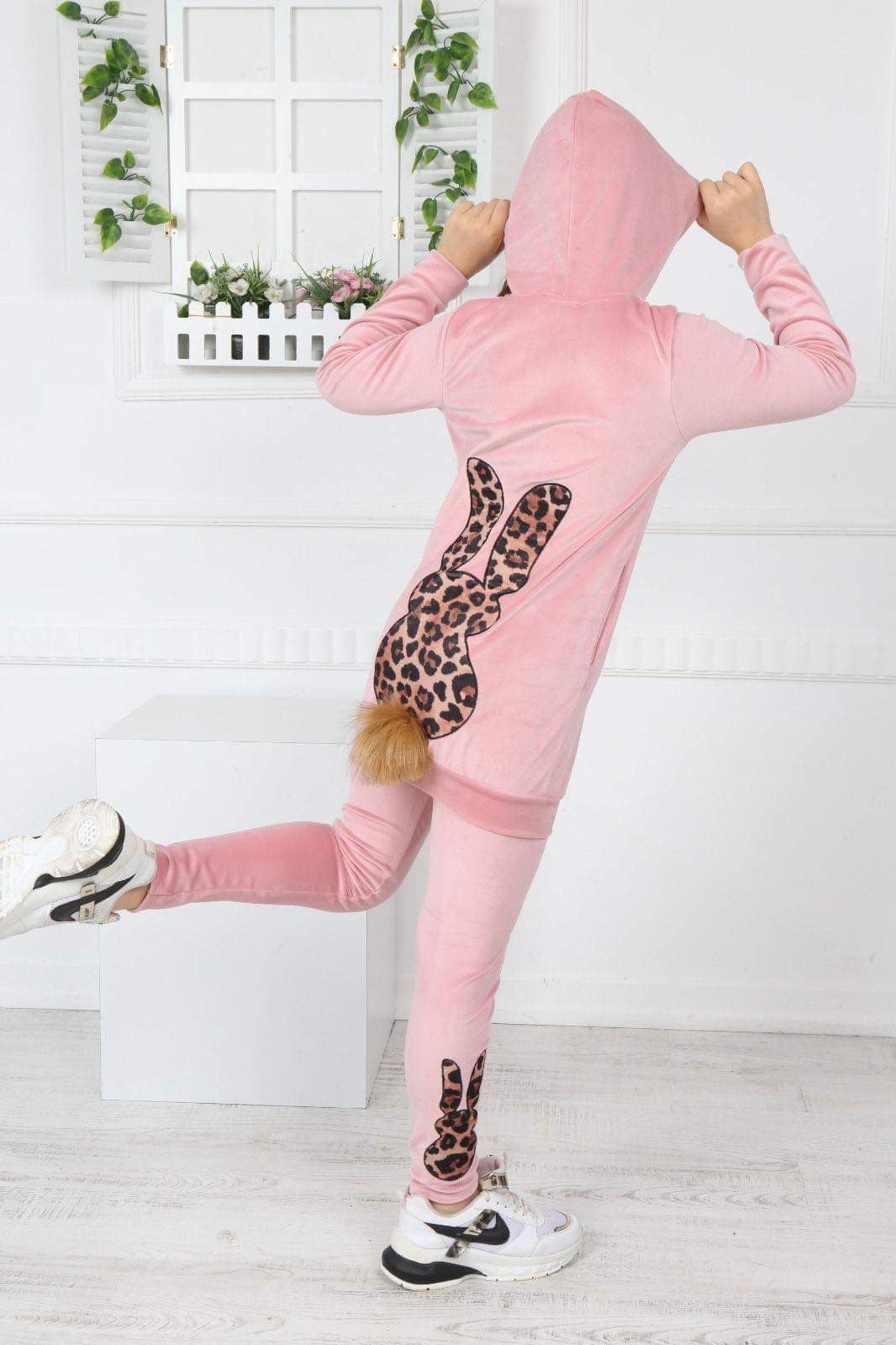 - na plecach bluza ozdobiona zarysem króliczka w panterkowy print oraz puchatym ogonkiem