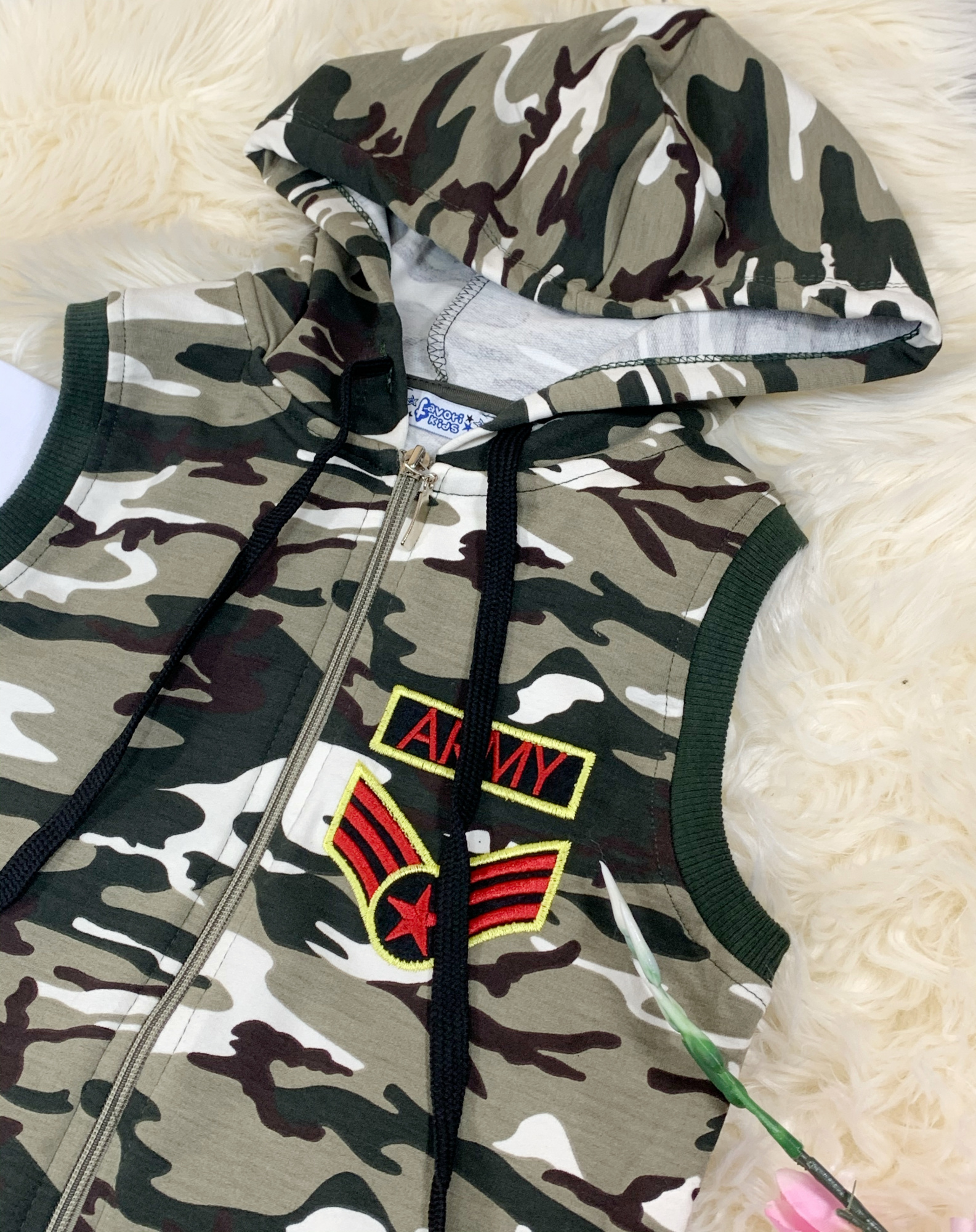 - kamizelka z kapturem zapinana na zamek, ozdobne naszywki