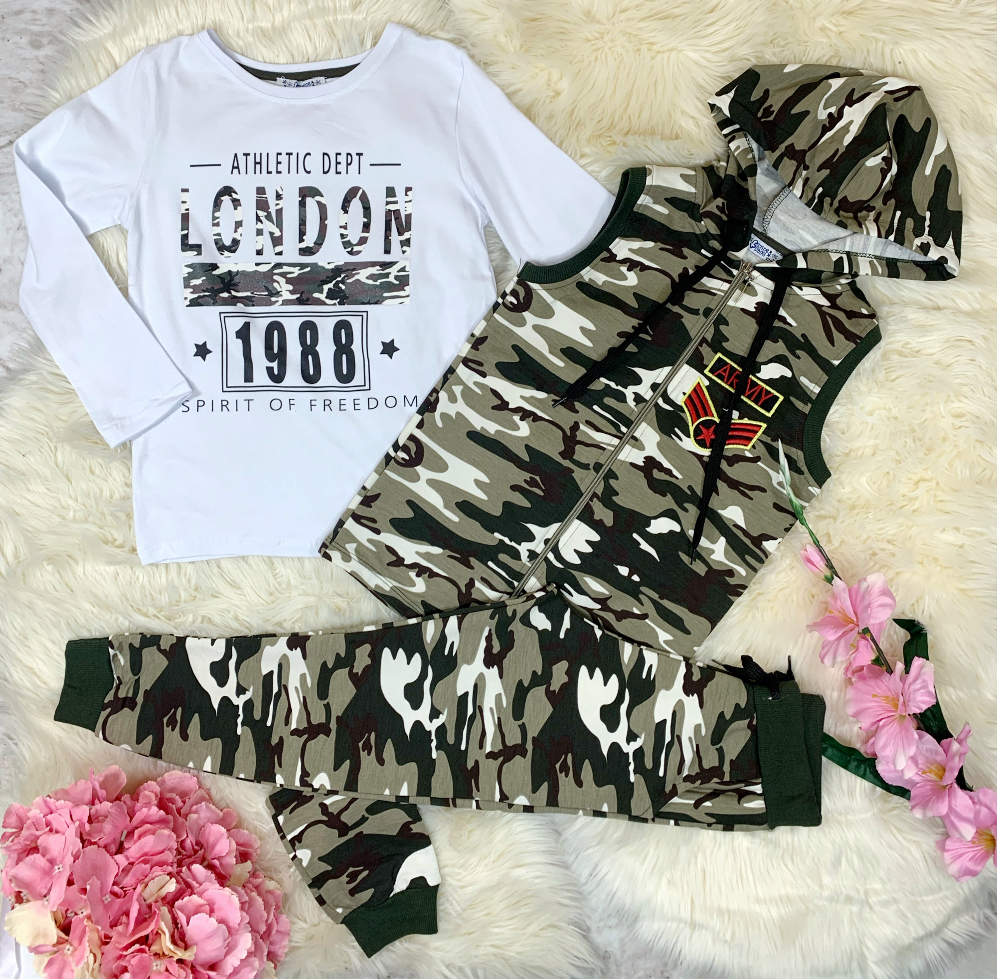 - w skład kompletu wchodzi: kamizelka, bluzka z długim rękawem i spodnie dresowe.