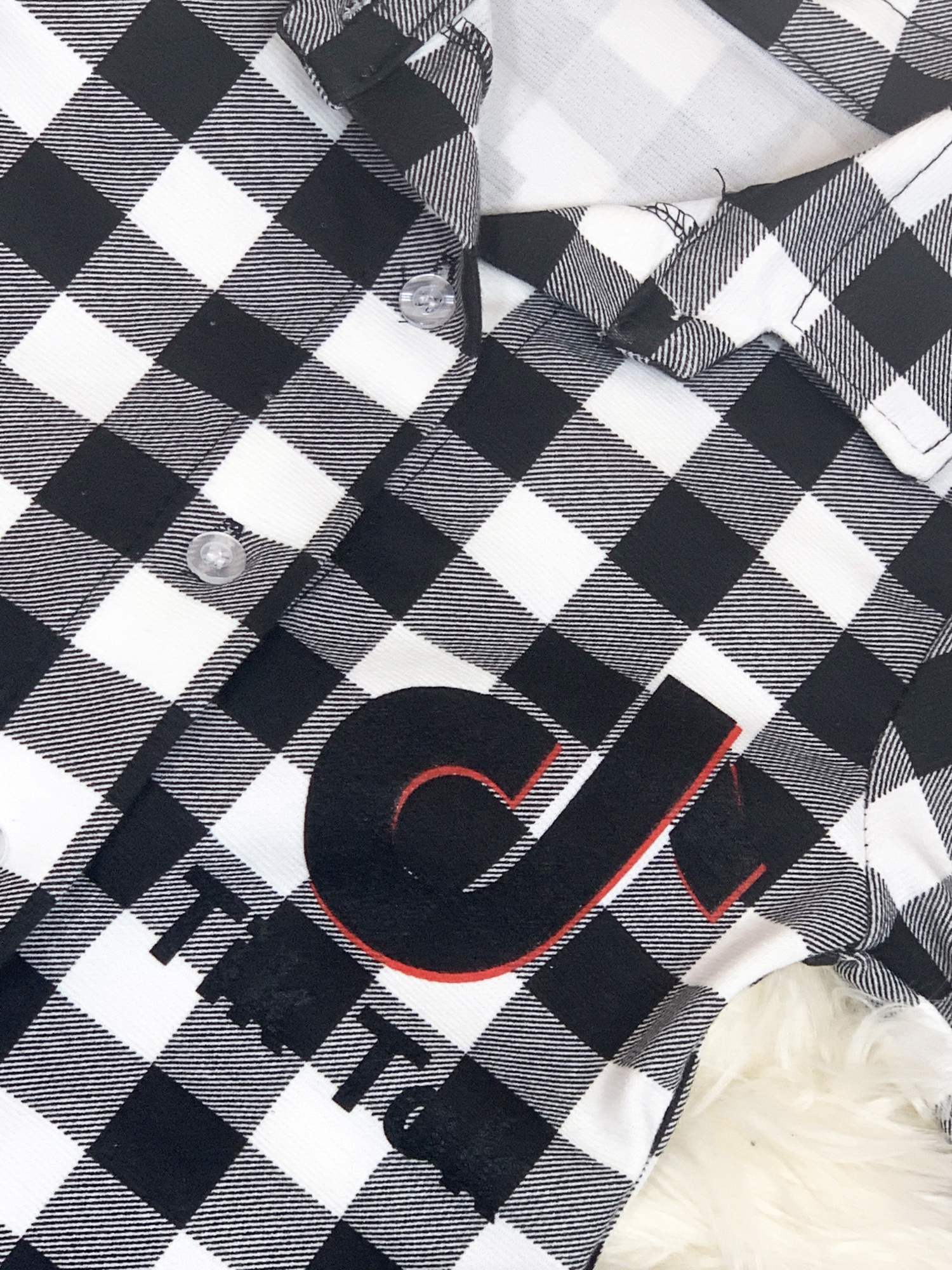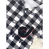 • materiał w modną kratę ozdobiony nadrukiem z tyłu i z przodu