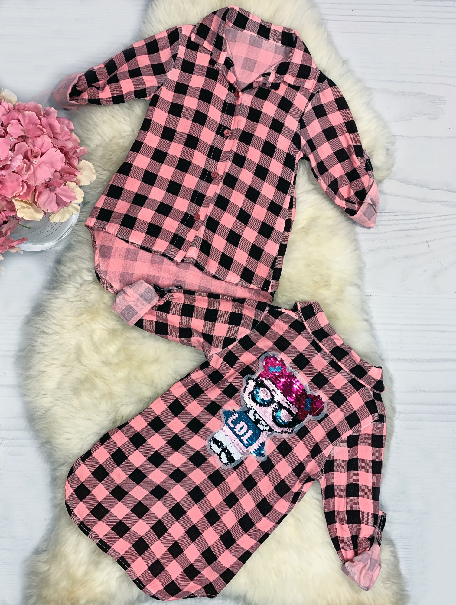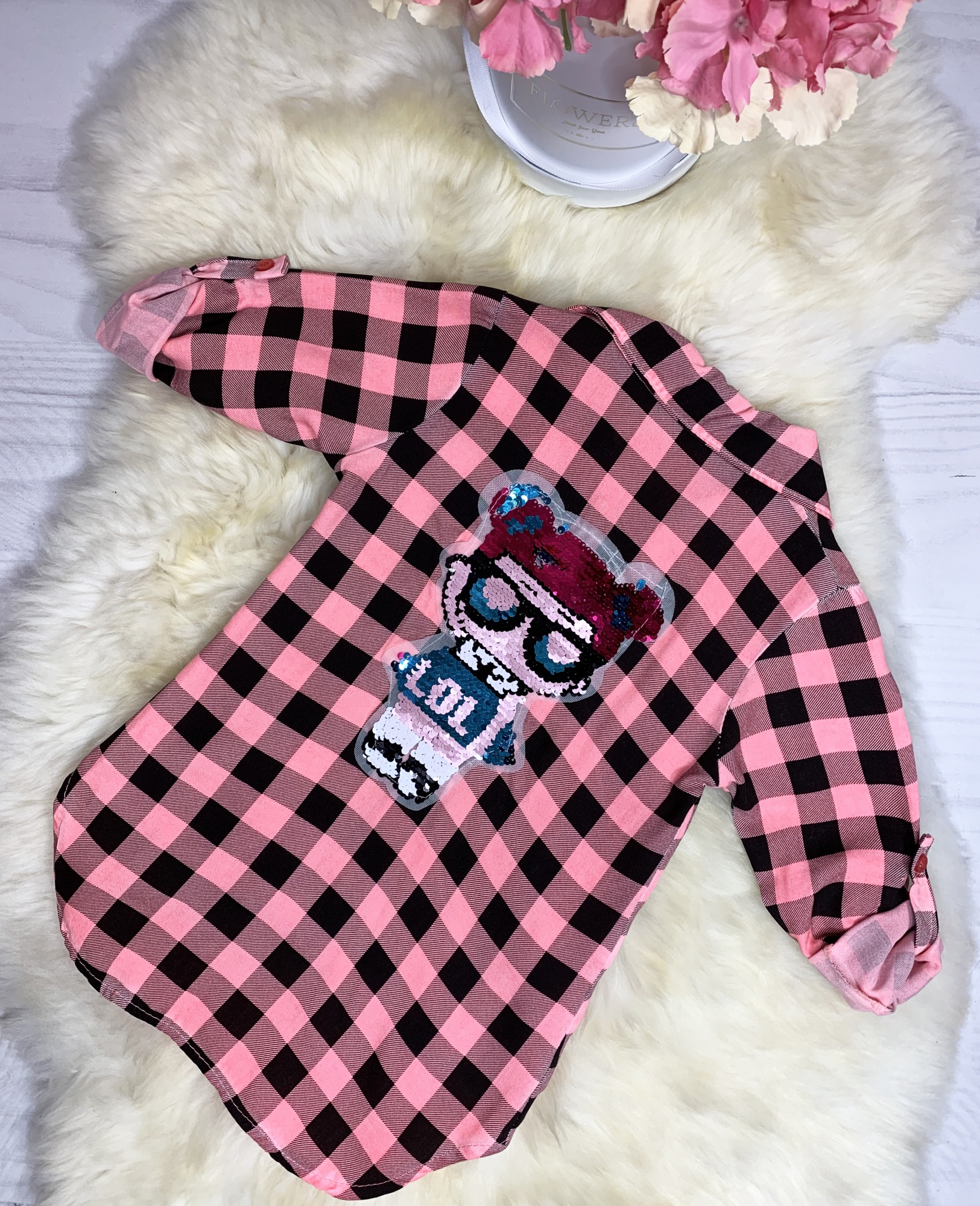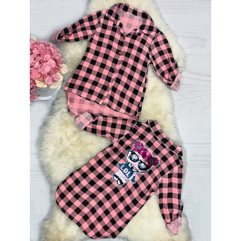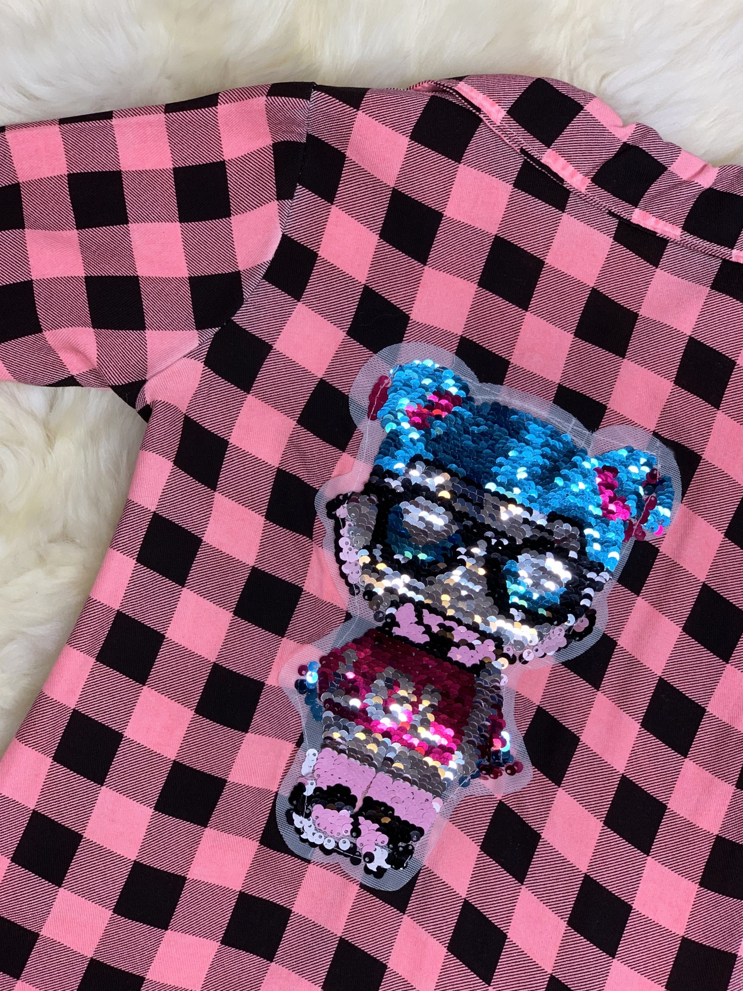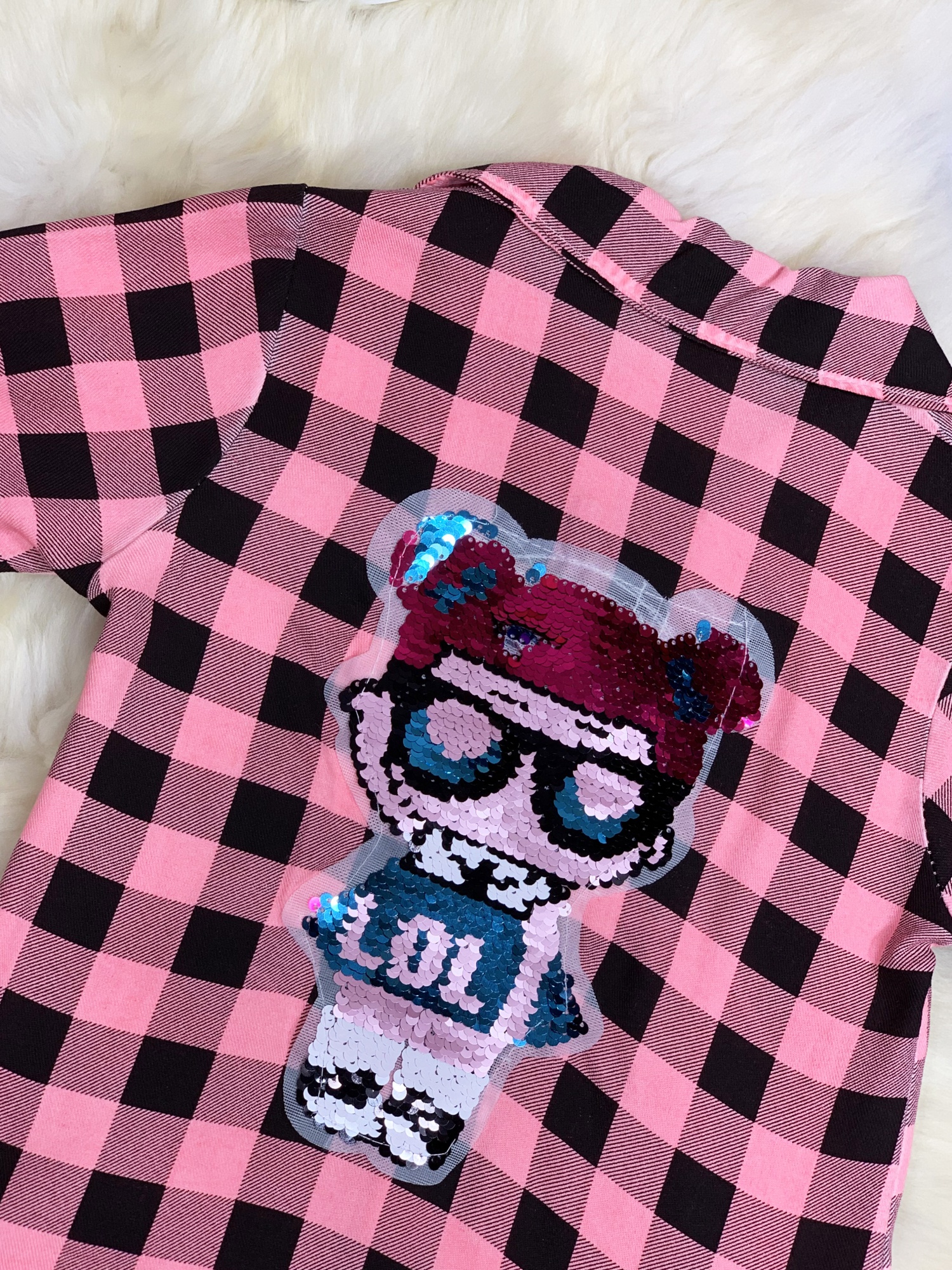 - materiał w modną kratę ozdobiony z tyłu naszyciem laleczki LOL