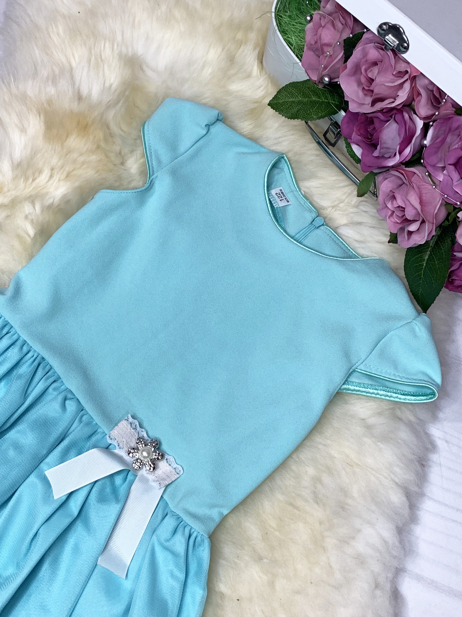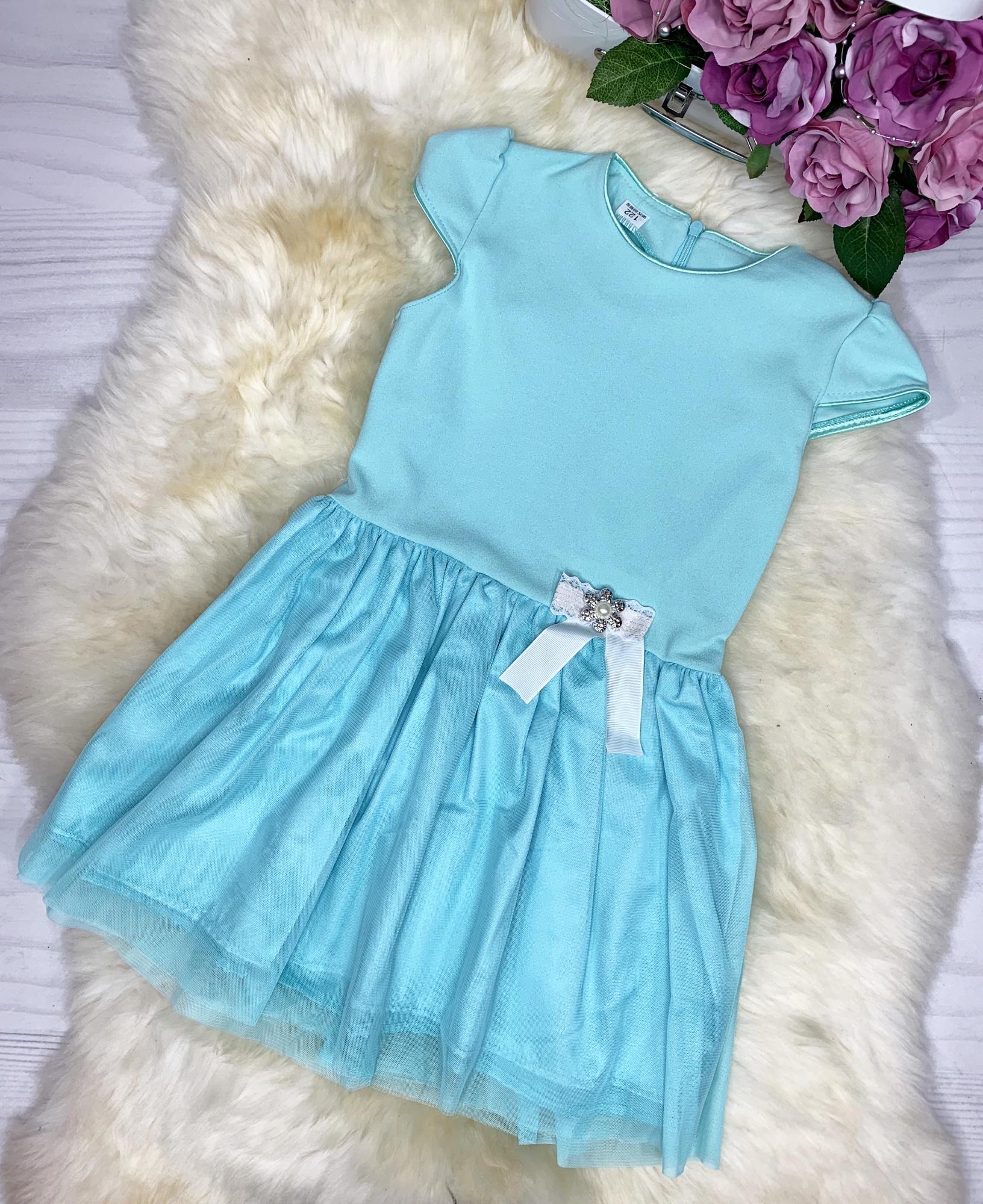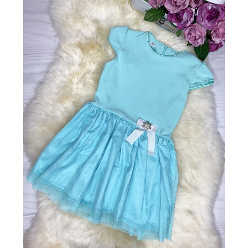 Miętowa sukienka z tiulem i ozdobą
