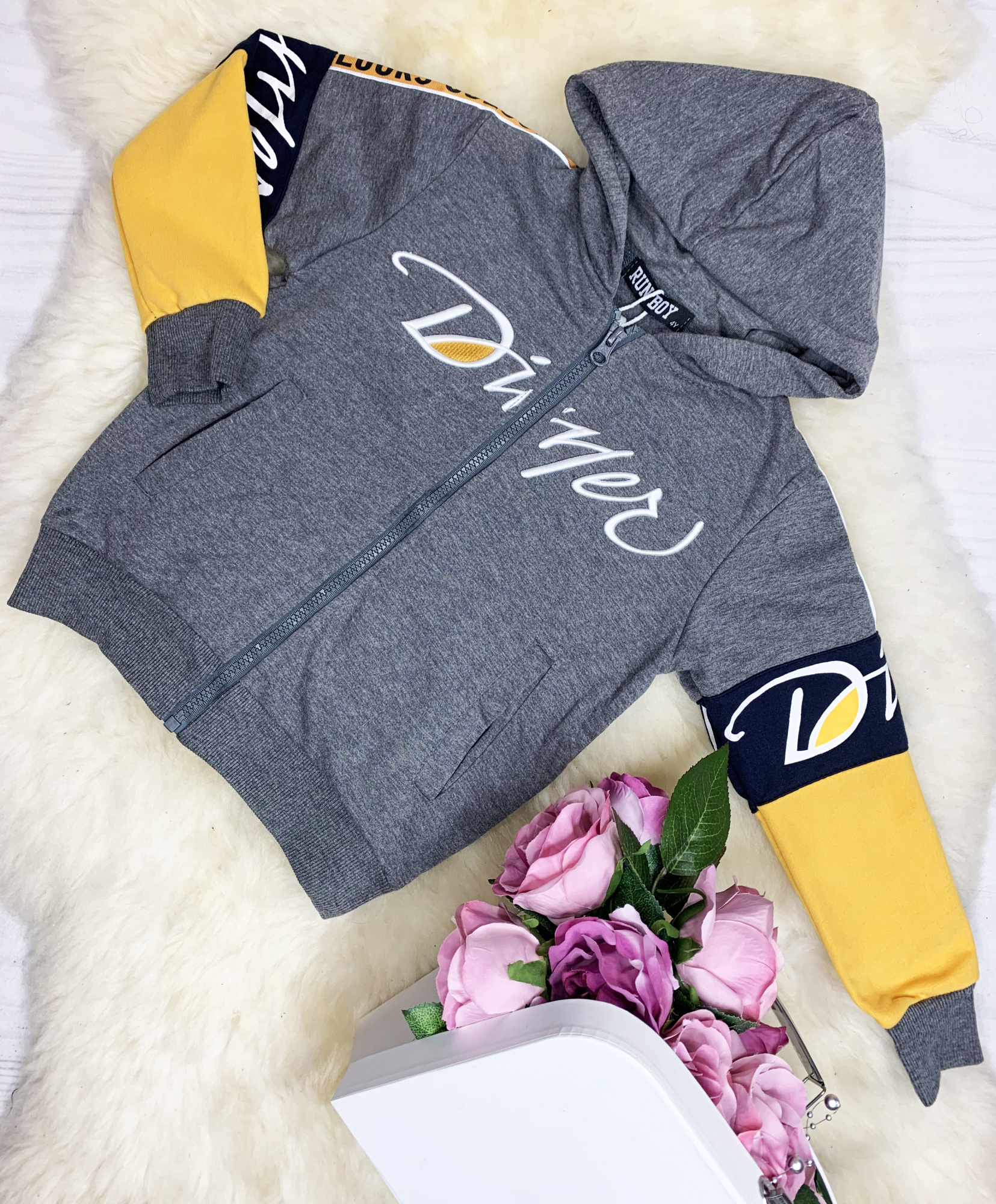 - bluza z kapturem zapinana na zamek, ozdobne nadruki na rękawach