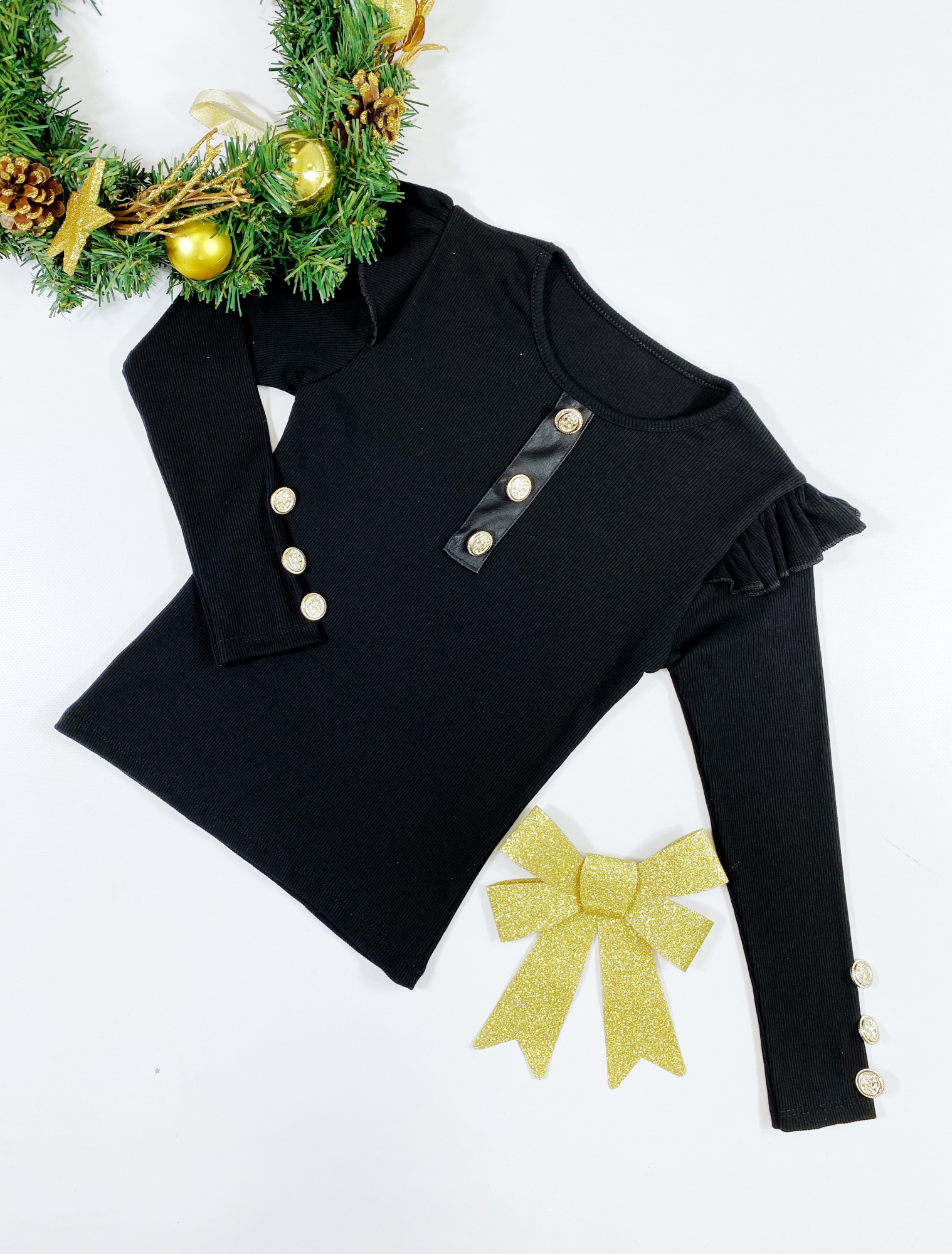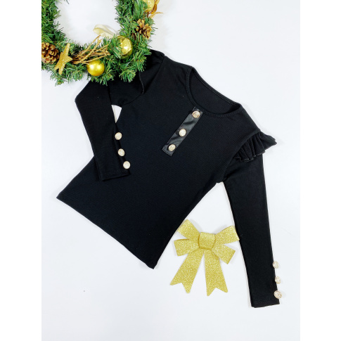 • bluzka posiada ozdobne złote guziczki, oraz falbanki obok ramion