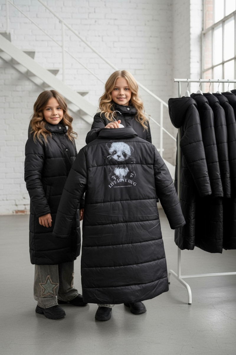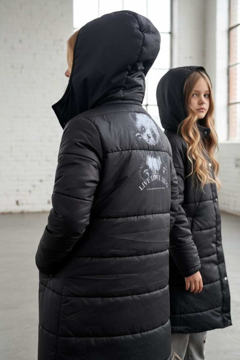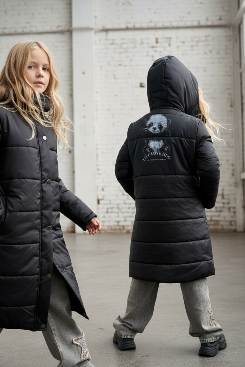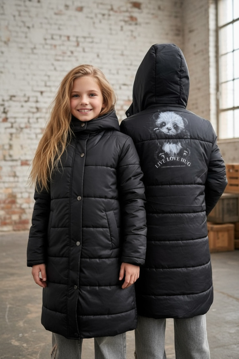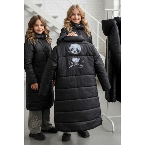 • płaszczyk jest w kolorze czarnym i uroczym nadrukiem misia oraz napisem "LIVE LOVE HUG"