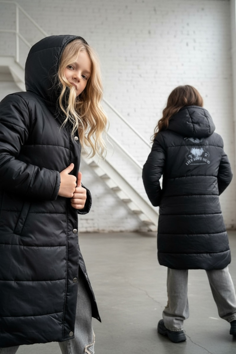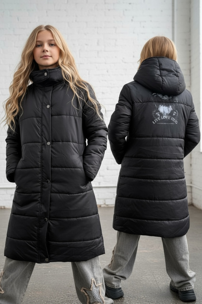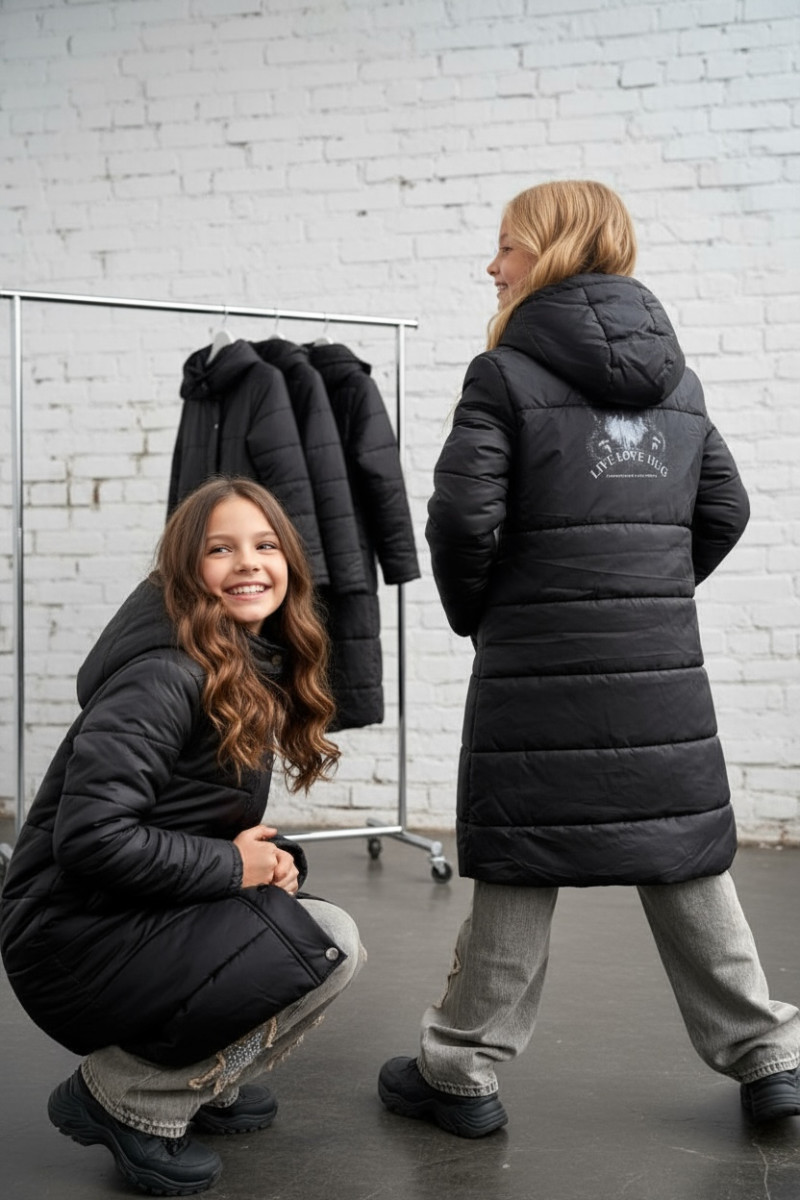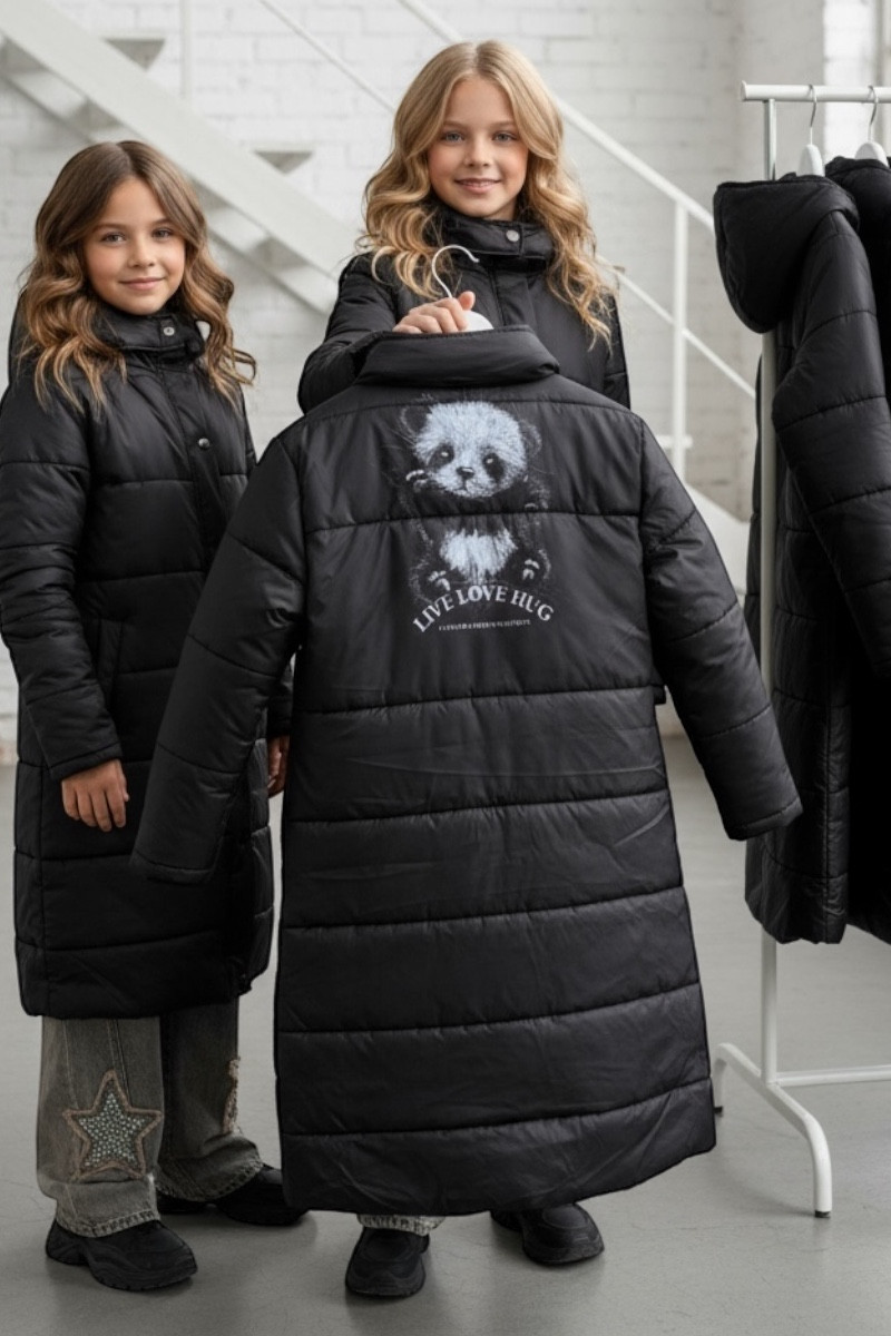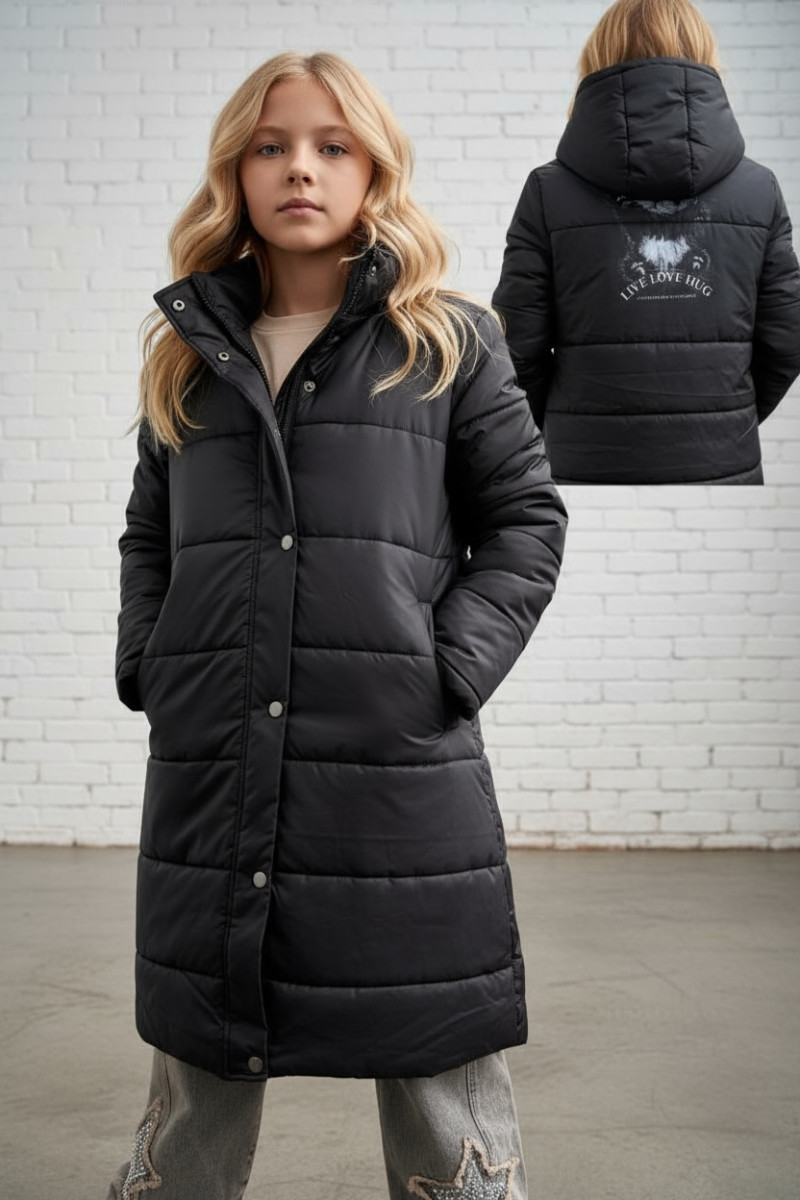 • płaszczyk jest w kolorze czarnym i uroczym nadrukiem misia oraz napisem "LIVE LOVE HUG"