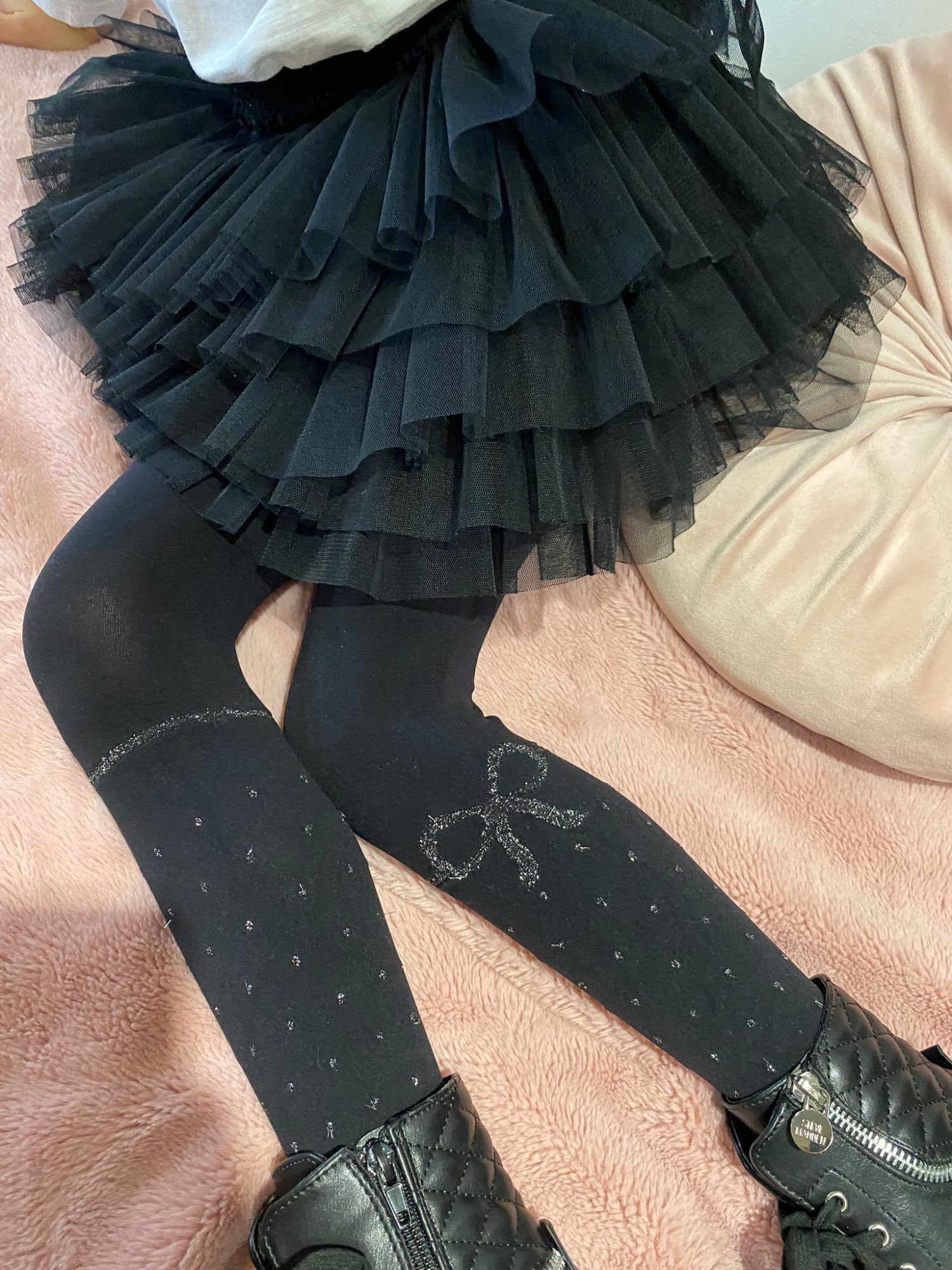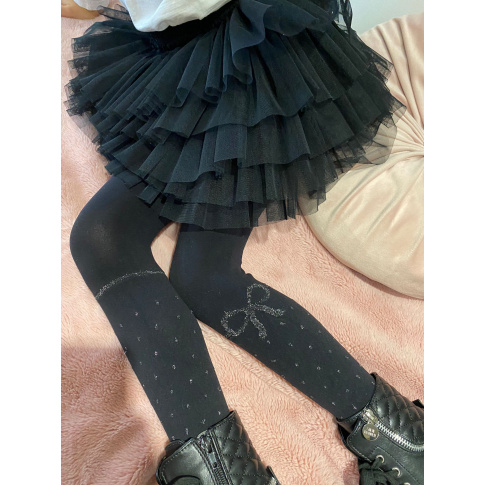 • kryjące rajstopki z ozdobną srebrzystą kokardką i kropeczkami