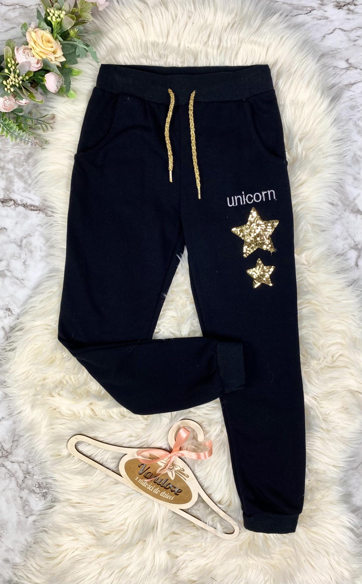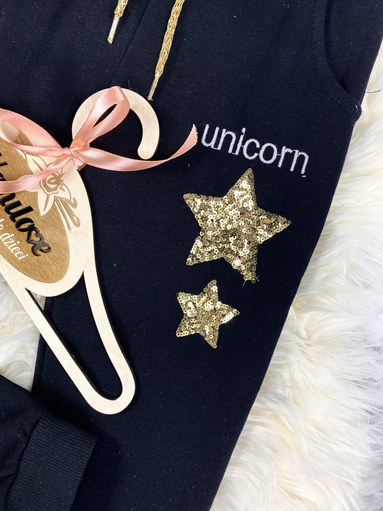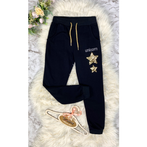 • lewa nogawka posiada biały haft unicorn oraz gwiazdki zdobione złotymi cekinami