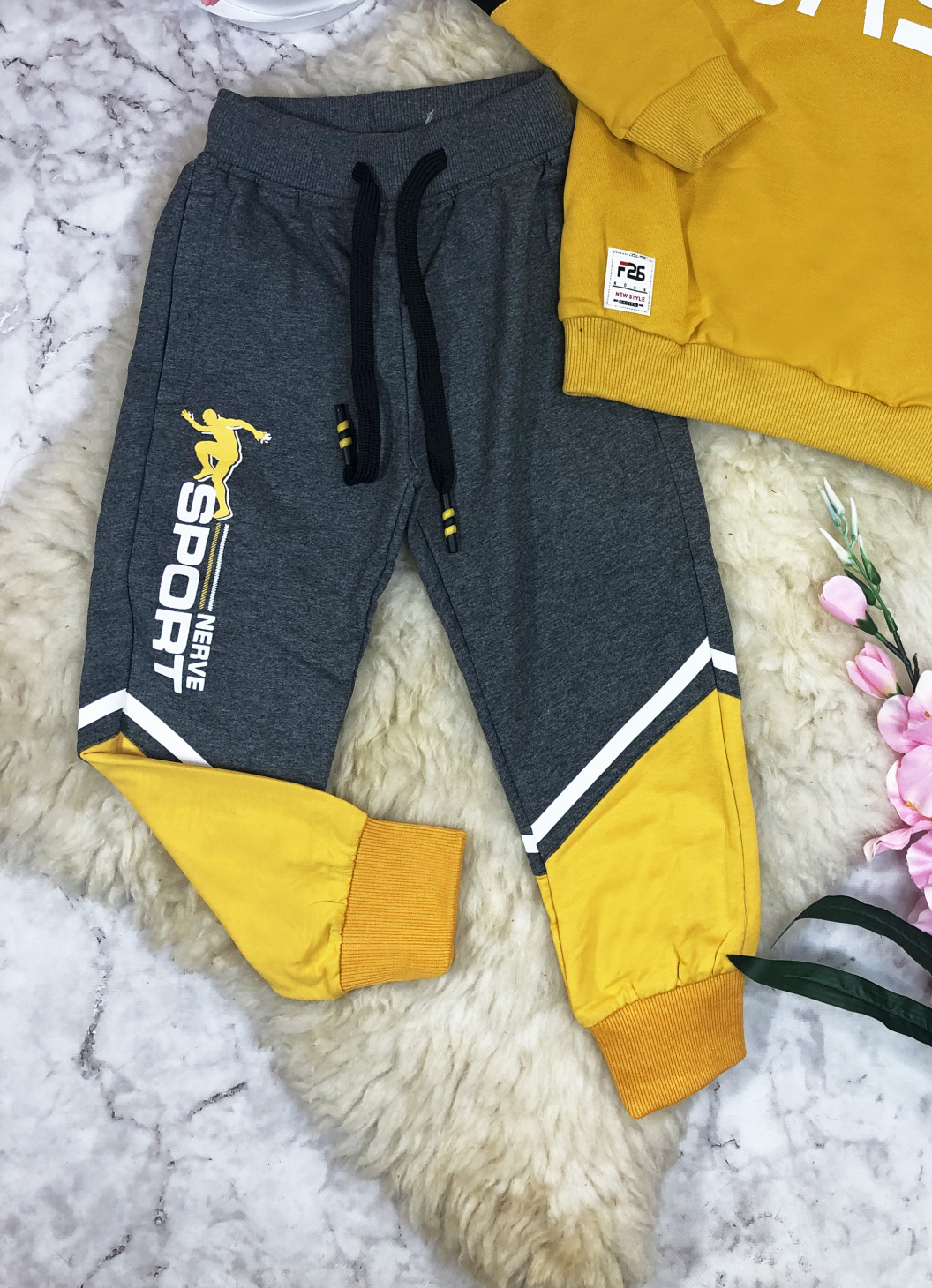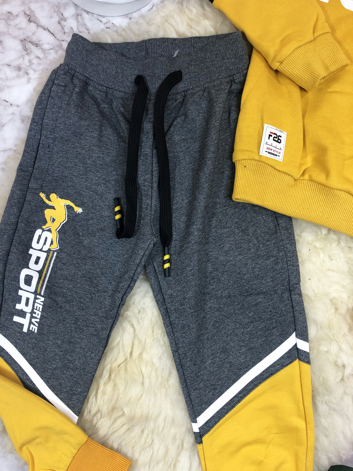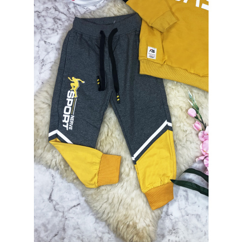 • spodnie z gumką w pasie również z nadrukami na nogawce.