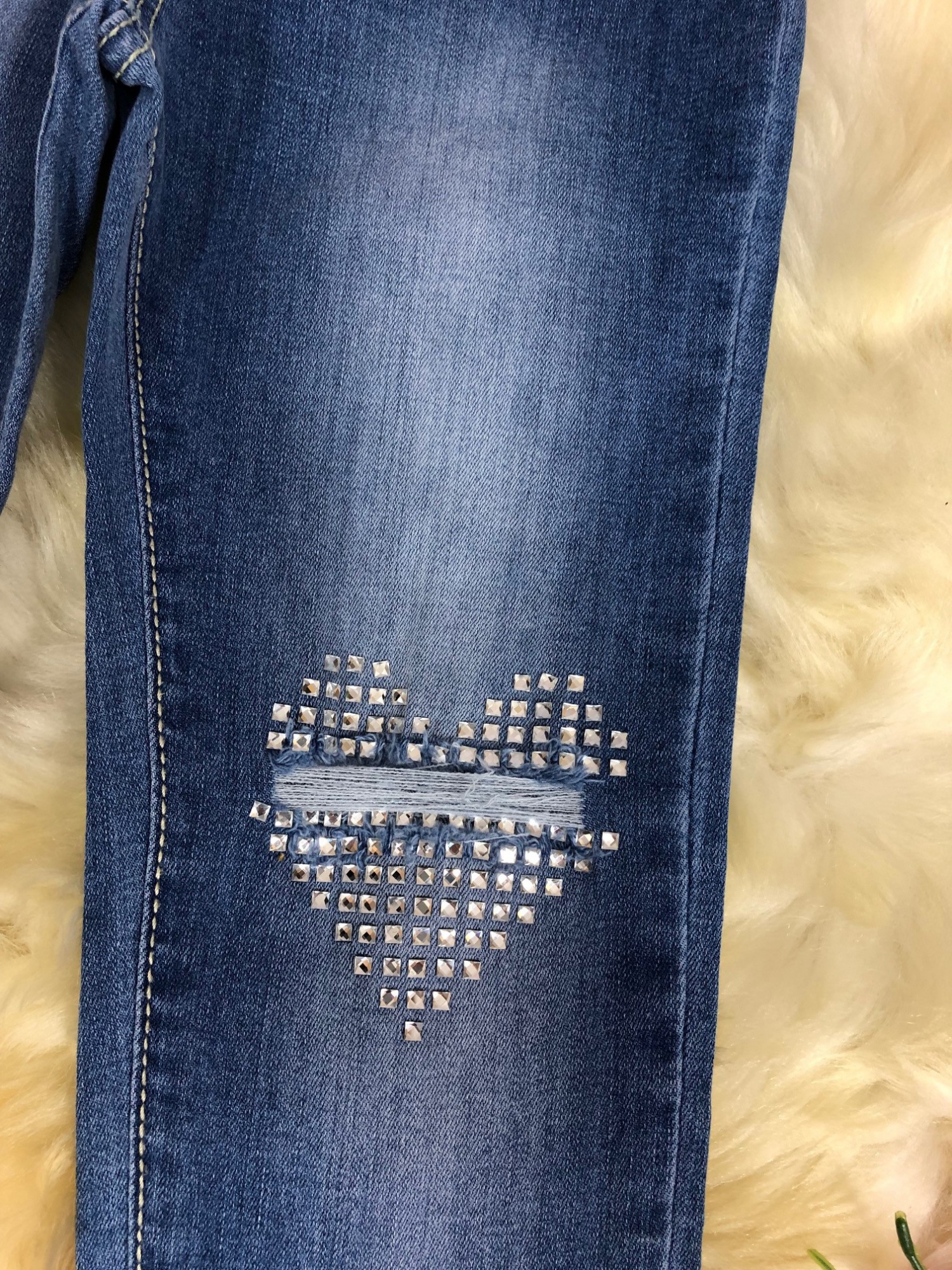 • ozdobione na kolanach modnymi rozcięciami i dżetami w kształcie serca