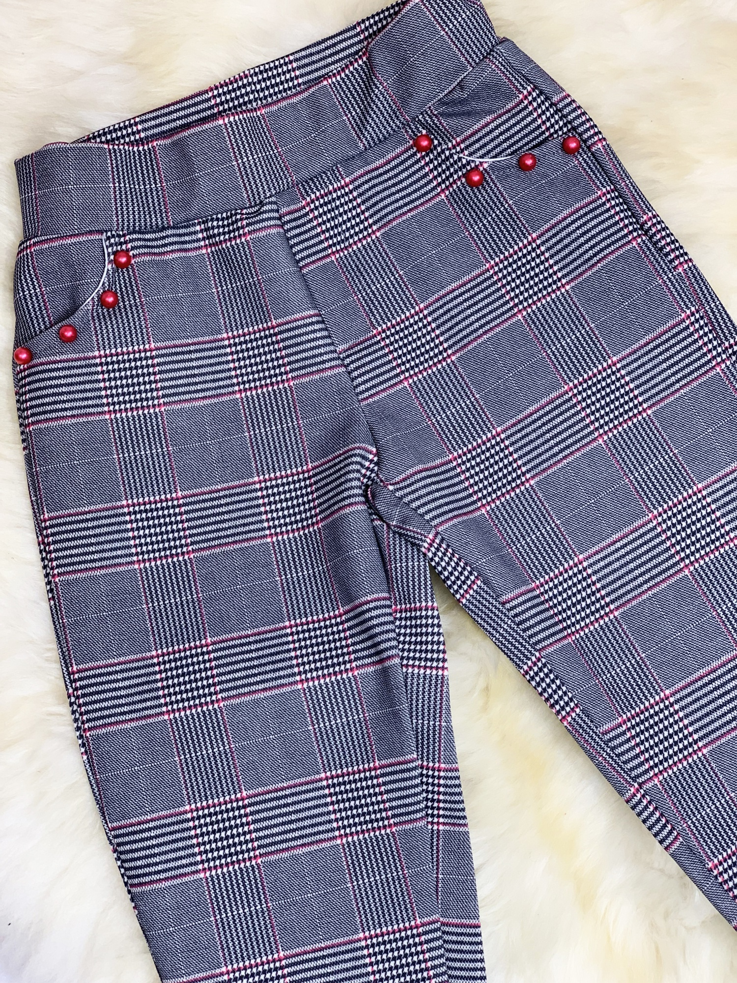 Spodnie wiosenne w modną kratę - akcent czerwony