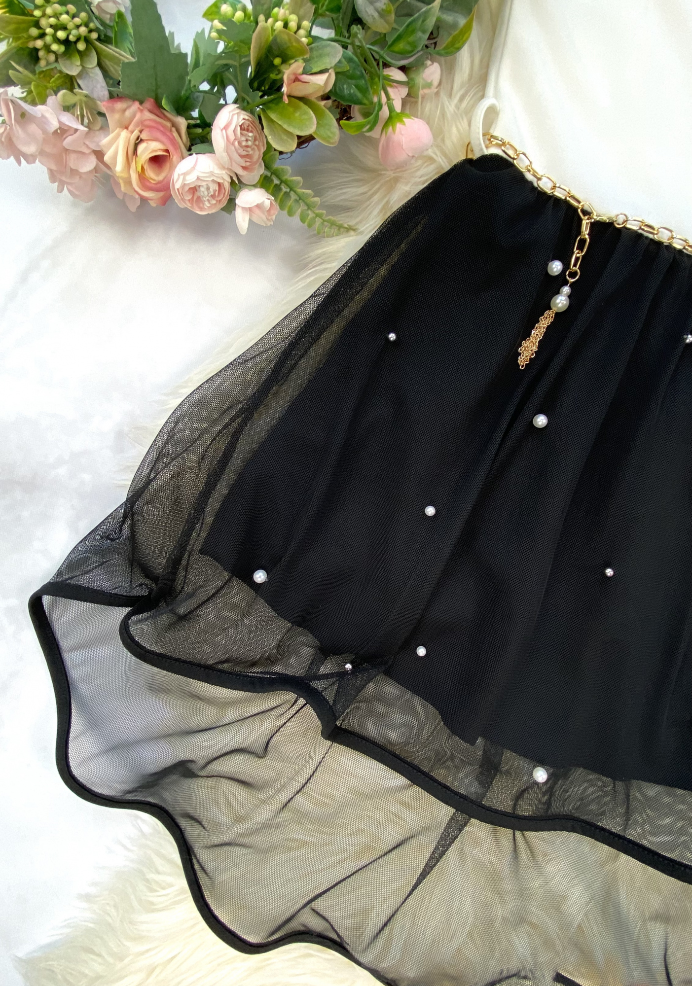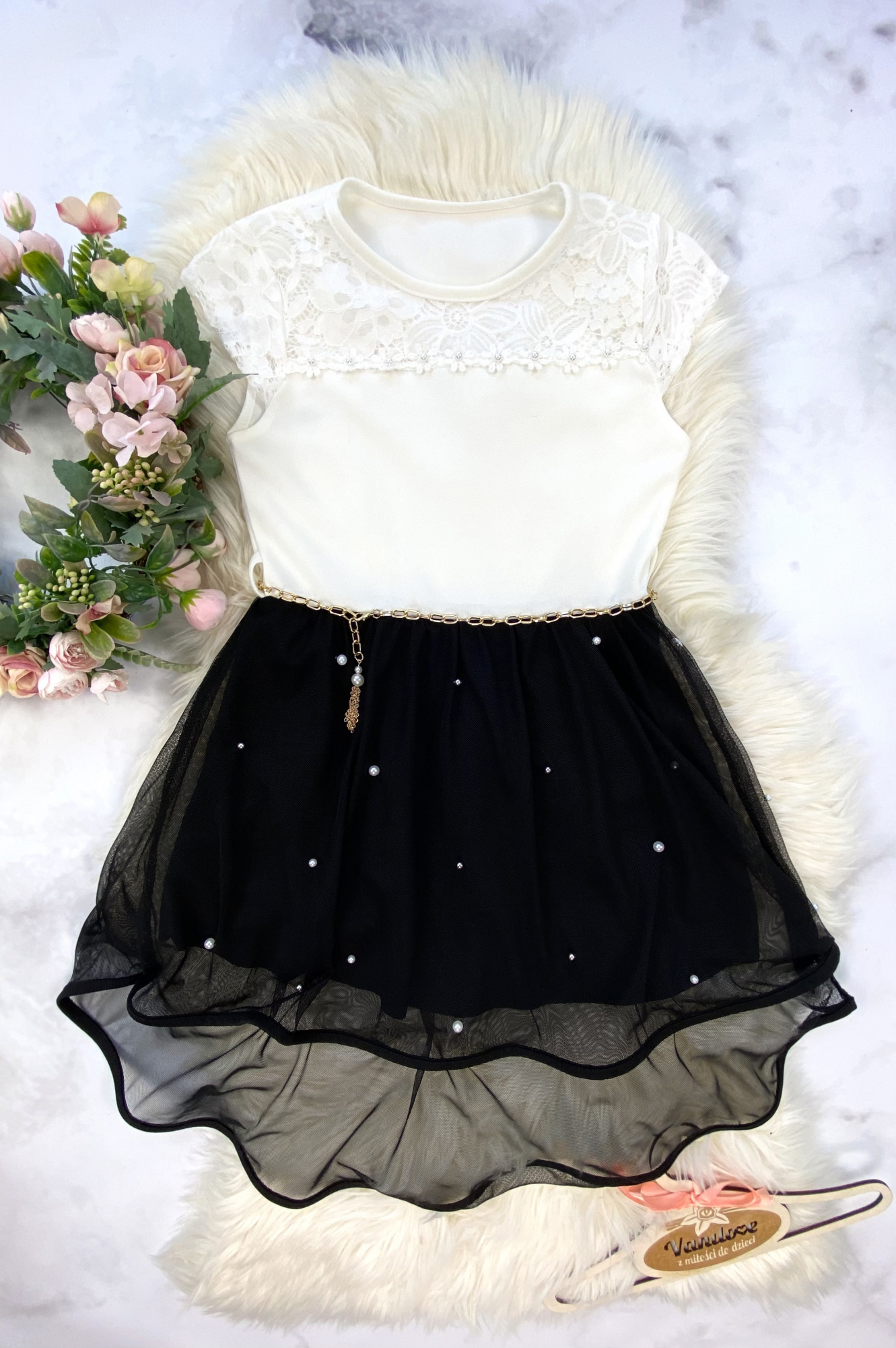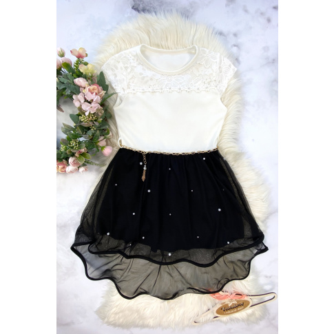 • dół zdobiony tiulem i perełkami, krój sukienki asymetryczny - z tyłu dłuższa
