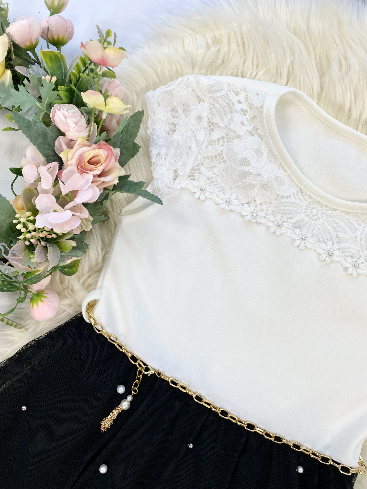 • elegancka sukienka w górnej części zdobiona koronką i delikatnymi stokrotkami